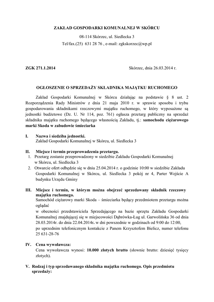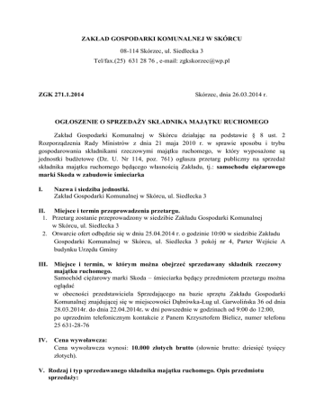 ZAKŁAD GOSPODARKI KOMUNALNEJ W SKÓRCU 08-114 Skórzec, ul. Siedlecka 3 Tel/fax.(25) 631 28 76 , e-mail: [email protected] ZGK 271.1.2014 Skórzec, dnia 26.03.2014 r. OGŁOSZENIE O SPRZEDAŻY SKŁADNIKA MAJĄTKU RUCHOMEGO Zakład Gospodarki Komunalnej w Skórcu działając na podstawie § 8 ust. 2 Rozporządzenia Rady Ministrów z dnia 21 maja 2010 r. w sprawie sposobu i trybu gospodarowania składnikami rzeczowymi majątku ruchomego, w który wyposażone są jednostki budżetowe (Dz. U. Nr 114, poz. 761) ogłasza przetarg publiczny na sprzedaż składnika majątku ruchomego będącego własnością Zakładu, tj.: samochodu ciężarowego marki Skoda w zabudowie śmieciarka I. Nazwa i siedziba jednostki. Zakład Gospodarki Komunalnej w Skórcu, ul. Siedlecka 3 II. Miejsce i termin przeprowadzenia przetargu. 1. Przetarg zostanie przeprowadzony w siedzibie Zakładu Gospodarki Komunalnej w Skórcu, ul. Siedlecka 3 2. Otwarcie ofert odbędzie się w dniu 25.04.2014 r. o godzinie 10:00 w siedzibie Zakładu Gospodarki Komunalnej w Skórcu, ul. Siedlecka 3 pokój nr 4, Parter Wejście A budynku Urzędu Gminy III. Miejsce i termin, w którym można obejrzeć sprzedawany składnik rzeczowy majątku ruchomego. Samochód ciężarowy marki Skoda – śmieciarka będący przedmiotem przetargu można oglądać w obecności przedstawiciela Sprzedającego na bazie sprzętu Zakładu Gospodarki Komunalnej znajdującej się w miejscowości Dąbrówka-Ług ul. Garwolińska 36 od dnia 28.03.2014r. do dnia 22.04.2014r. w dni powszednie w godzinach od 9:00 do 12:00, po uprzednim telefonicznym kontakcie z Panem Krzysztofem Bielicz, numer telefonu 25 631-28-76 IV. Cena wywoławcza: Cena wywoławcza wynosi: 10.000 złotych brutto (słownie brutto: dziesięć tysięcy złotych). V. Rodzaj i typ sprzedawanego składnika majątku ruchomego. Opis przedmiotu sprzedaży: 一 一 一 一 VI. 1. 2. 3. 1. 2. 1. 2. VII. 1. 2. 3. Rodzaj, marka : Model, typ : Numer ramy: Rok produkcji: Samochód ciężarowy Skoda w zabudowie śmieciarka A06 RTK 90441408 1984 r. Wysokość wadium oraz forma, termin i miejsce jego wniesienia. Wadium: Warunkiem przystąpienia do przetargu jest wniesienie wadium (wyłącznie w pieniądzu) w wysokości 5% wartości ceny wywoławczej tj: 500,00 złotych (słownie: pięćset złotych), które należy wpłacić najpóźniej do dnia 22.04.2014r. do godz. 10:00 przelewem na rachunek bankowy Sprzedającego: nr 33 9194 0007 0055 0143 2000 0060 z dopiskiem „Wadium – kupno samochodu ciężarowego Skoda w zabudowie śmieciarka)” Wpłacenie wadium przelewem będzie uznane za skuteczne jeżeli w dniu składania ofert środki będą na koncie Sprzedającego. Nie wniesienie wadium w wymaganym terminie (brak środków na koncie Sprzedającego) spowoduje odrzucenie oferty. Dowód wniesienia wadium (oryginał lub kserokopia z podpisem za zgodność z oryginałem) winien być dołączony do oferty. Zasady zwrotu wadium: Wadium złożone przez oferentów, których oferty nie zostały wybrane lub zostały odrzucone, zostanie zwrócone w ciągu 7 dni od dnia wyboru lub odrzucenia oferty na rachunek bankowy wskazany w ofercie. Wadium złożone przez nabywcę samochodu ciężarowego Skoda w zabudowie śmieciarka) zostanie zaliczone na poczet ceny. Utrata wadium: Wadium nie podlega zwrotowi w przypadku, gdy Oferent, który zaoferował najwyższą cenę zakupu, uchyli się od zawarcia umowy sprzedaży. Wadium nie podlega zwrotowi w przypadku, gdy nabywca nie wpłaci kwoty (ceny) nabycia samochodu ciężarowego Skoda w zabudowie śmieciarka) zaoferowanej podczas przetargu, w terminie 7 dni od dnia zawarcia umowy. Wymagania, jakim powinna odpowiadać oferta. Ofertę należy złożyć w nieprzejrzystej, zamkniętej kopercie/opakowaniu z dopiskiem: „Oferta na sprzedaż samochodu ciężarowego Skoda w zabudowie śmieciarka) nie otwierać przed dniem 25.04.2014 r. do godziny 10:00”. Oferta musi być sporządzona zgodnie ze wzorem – załącznik nr 1 do ogłoszenia, który można pobrać w siedzibie sprzedającego w Zakładzie Gospodarki Komunalnej w Skórcu lub pobrać ze strony internetowej: www.gminawskorcu.eu. Oferta pod rygorem nieważności powinna być sporządzona w formie pisemnej i powinna zawierać: imię i nazwisko, dokładny adres i numer telefonu kontaktowego lub nazwę (firmę) i adres siedziby oferenta, numer telefonu/faksu oraz PESEL i numer REGON; oferowaną cenę (nie mniejszą niż cena wywoławcza) i warunki jej zapłaty; oświadczenie Oferenta, że zapoznał się ze stanem samochodu ciężarowego Skoda (zabudowa śmieciarka) lub że ponosi odpowiedzialność za skutki wynikające z rezygnacji z oględzin; dowód wniesienia obowiązującego wadium; w przypadku składania oferty przez osoby fizyczne nie prowadzące działalności gospodarczej do oferty należy dołączyć kopię dowodu osobistego; w przypadku składania oferty przez osobę fizyczną prowadzącą działalność gospodarczą lub firmę należy dołączyć aktualny wypis z właściwego rejestru albo aktualne zaświadczenie o wpisie do ewidencji działalności gospodarczej wystawione nie wcześniej niż 6 miesięcy przed upływem terminu składania ofert; parafowany wzór umowy. VIII. Termin, miejsce i tryb złożenia oferty oraz okres, w którym oferta jest wiążąca. 1. Ofertę należy złożyć w nieprzejrzystej, zamkniętej kopercie/opakowaniu do dnia 25.04.2014r. do godziny 10:00 w siedzibie Zakładu Gospodarki Komunalnej w Skórcu „Oferta na sprzedaż samochodu ciężarowego Skoda w zabudowie śmieciarka) nie otwierać przed dniem 25.04.2014r. do godziny 10:00”. 2. W przypadku wysłania oferty za pośrednictwem poczty lub firmy kurierskiej, decyduje data i godzina wpływu przesyłki z ofertą do siedziby Zakładu Gospodarki Komunalnej, a nie data stempla pocztowego (nadania). 3. Oferta jest wiążąca przez okres 7 dni od daty otwarcia ofert. IX. 1. 2. X. 1. 2. 3. 4. Odrzucenie oferty. Komisja przetargowa odrzuci ofertę, j