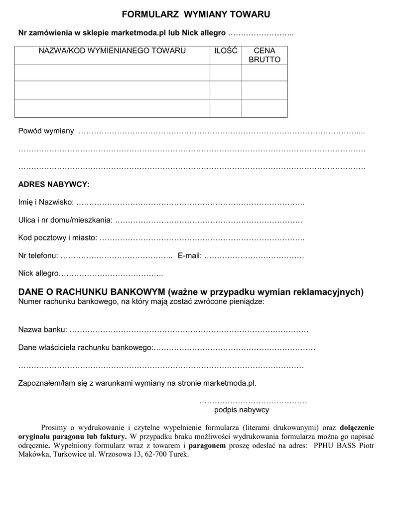 FORMULARZ WYMIANY TOWARU Nr zamówienia w sklepie marketmoda.pl lub Nick allegro …………………….. NAZWA/KOD WYMIENIANEGO TOWARU ILOŚĆ CENA BRUTTO Powód wymiany ……………………………………………………………………………………………….... ……………………………………………………………………………………………………………………… ……………………………………………………………………………………………………………………… ADRES NABYWCY: Imię i Nazwisko: …………………………………………………………………………….. Ulica i nr domu/mieszkania: ………………………………………………………………. Kod pocztowy i miasto: …………………………………………………………………….. Nr telefonu: …………………………………….. E-mail: ………………………………… Nick allegro………………………………….. DANE O RACHUNKU BANKOWYM (ważne w przypadku wymian reklamacyjnych) Numer rachunku bankowego, na który mają zostać zwrócone pieniądze: Nazwa banku: ………………………………………………………………………………… Dane właściciela rachunku bankowego:……………………………………………………… ………………………………………………………………………………………………… Zapoznałem/łam się z warunkami wymiany na stronie marketmoda.pl. …………………………………… podpis nabywcy Prosimy o wydrukowanie i czytelne wypełnienie formularza (literami drukowanymi) oraz dołączenie oryginału paragonu lub faktury. W przypadku braku możliwości wydrukowania formularza można go napisać odręcznie. Wypełniony formularz wraz z towarem i paragonem proszę odesłać na adres: PPHU BASS Piotr Makówka, Turkowice ul. Wrzosowa 13, 62-700 Turek.