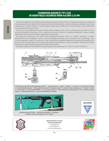 STANOWISKO BADAWCZE TYP 5,56B DO BADAŃ WĘZŁA GAZOWEGO BRONI KALIBRU 5,56 MM UZBROJENIE Stanowisko badawcze Typ 5,56B do badań węzła gazowego broni kalibru 5,56 mm zostało zaprojektowane, wykonane i przetestowane przez Instytut Techniki Uzbrojenia Wydziału Mechatroniki i Lotnictwa Wojskowej Akademii Technicznej i Fabrykę Broni „Łucznik”-Radom w ramach projektu badawczego 0 T00B 029 24, finansowanego w latach 2003-2006 przez Ministerstwo Edukacji i Nauki. Zawiera ono dwa podstawowe zespoły: lufowy układ miotający kalibru 5,56 mm (dostosowany do 5,56 x 45 mm amunicji pośredniej), wyposażony m.in. w gniazda pod czujniki ciśnienia i urządzenia dodatkowe, zestaw narzędzi i elementów wymiennych oraz zestaw rejestrująco-archiwizujący. Na stanowisku badawczym Typ 5,56B można dokonywać pomiaru ciśnień w czterech miejscach: w stożku przejściowym komory nabojowej – pkn, w części prowadzącej przewodu lufy na wysokości otworu gazowego – pko, w komorze gazowej – pkgaz i na wylocie lufy – pwyl, w zależności od objętości Wkgaz komory gazowej i pola powierzchni przekroju poprzecznego Sogaz otworu gazowego (poprzez wymianę dysz o różnych kształtach i średnicach). Ponadto stanowisko umożliwia dokonywanie pomiaru drogi lsuw suwadła. Stanowisko badawcze Typ 5,56B jest chronione zgłoszeniem patentowym nr P-394 174 z dnia 10.03.2011 r. Przekrój fragmentu stanowiska typ 5,56B (podstawowe elementy): 1 – sprężyna powrotna, 2 – suwadło, 3 – nakładka, 4 – rura gazowa, 5 – tłoczysko tłoka nastawnego, 6 – przeciwnakrętka tłoka gazowego, 7 – tuleja-cylinder komory gazowej, 8 – tłok gazowy nastawny, 9 – zaślepka, 10 – korpus komory gazowej, 11 – nakrętka, 12 – łącznik, 13 – obsada czujnika, 14 – czujnik ciśnienia 4QP2000, 15 – lufa, 16 – dysza wymienna, 17 – kołek ustalający cylindra komory gazowej, 18 – łoże z wybraniem pod obsadę czujnika, 19 – obsada czujnika ciśnienia, 20 – czujnik ciśnienia 4QP6000 [rys. R. Woźniak] NASZ PARTNER Stanowisko badawcze Typ 5,56B: 1 – obiekt badań na stanowisku, 2 – elektrospust, 3 – podstawa z uchwytami mocującymi broń [fot. J. Kijewski] Wydział Mechatroniki i Lotnictwa Instytut Techniki Uzbrojenia Ryszard Woźniak tel.: +48 22 683 93 77 e-mail: [email protected] 20