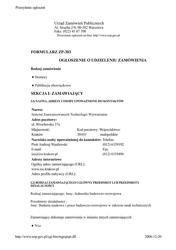 Przesyłanie ogłoszeń Urząd Zamówień Publicznych Al. Szucha 2/4; 00-582 Warszawa Faks: (022) 45 87 700 Przesyłanie ogłoszeń on-line: http://www.uzp.gov.pl FORMULARZ ZP-303 OGŁOSZENIE O UDZIELENIU ZAMÓWIENIA Rodzaj zamówienia ● Dostawy ● Publikacja obowiązkowa SEKCJA I: ZAMAWIAJĄCY I.I) NAZWA, ADRESY I OSOBY UPOWAŻNIONE DO KONTAKTÓW Nazwa: Instytut Zaawansowanych Technologii Wytwarzania Adres pocztowy: ul. Wrocławska 37a Miejscowość: Kod pocztowy: Województwo: Kraków 30-011 małopolskie Nazwisko osoby upoważnionej do kontaktów: Telefon: Piotr Andrzej Wasilewski (012) 6339192 E-mail: Fax: [email protected] (012) 6339490 Adresy internetowe Ogólny adres zamawiającego (URL): www.ios.krakow.pl Adres profilu nabywcy (URL): I.2) RODZAJ ZAMAWIAJĄCEGO I GŁÓWNY PRZEDMIOT LUB PRZEDMIOTY DZIAŁALNOŚCI Rodzaj zamawiającego: Inny: Jednostka badawczo-rozwojowa Przedmioty działalności : Inne: Badania naukowe i prace badawczo-rozwojowe w zakresie nauk technicznych Zamawiający dokonuje zamówienia w imieniu innych zamawiających ● Nie http://www.uzp.gov.pl/cgi-bin/mgrqispi.dll 2006-12-20 Przesyłanie ogłoszeń CZY ZAMÓWIENIE BYŁO PRZEDMIOTEM OGŁOSZENIA W BIULETYNIE ZAMÓWIEŃ PUBLICZNYCH? ● Tak Numer ogłoszenia w spisie BZP: Nr 307 poz. 57925 z dnia 14/11/2006 WARTOŚĆ ZAMÓWIENIA 142466.37 EUR SEKCJA II: PRZEDMIOT ZAMÓWIENIA II.1) OPIS II.1.1) Nazwa nadana zamówieniu przez zamawiającego Dostawa systemu do mikro obróbki EDM II.1.2) Rodzaj zamówienia oraz miejsce wykonania robót budowlanych, realizacji dostaw lub świadczenia usług ● Dostawy ● Kupno Główne miejsce realizacji dostawy: Instytut Zaawansowanych Technologii Wytwarzania, ul. Wrocławska 37a, 30-011 Kraków II.1.3) Ogłoszenie dotyczy: ● Zamówienia publicznego II.1.4) Określenie przedmiotu zamówienia Przedmiotem zamówienia jest dostawa systemu do mikro obróbki EDM obejmującego precyzyjną obrabiarkę mikroelektroerozyjną ze sterowaniem 4D (X, Y, Z oraz oś \C\), generator oraz urządzenie do kształtowania mikroelektrod. System do mikroobróbki winien składać się z części obrabiarkowej wraz z układem optycznym do pozycjonowania oraz nadzoru procesu obróbkowego, układu obiegu dielektryka, generatora impulsów prądu roboczego, jednostki sterującej CNC wraz z oprogramowaniem dla jedno i wieloosiowej obróbki mikro EDM oraz urządzenia do wytwarzania mikro elektrod. Część obrabiarkowa winna posiadać precyzyjną stabilną konstrukcję i wyposażona być w precyzyjne głowicę obrotową wraz z precyzyjnym uchwytem i prowadzeniem elektrody roboczej. Układ obiegu dielektryka powinien posiadać zbiornik z możliwością filtrowania, kontroli temperatur/1 i przewodności stosowanego dielektryka (woda dejonizowana, ciecz węglowodorowa). Urządzenie winno zapewnić wieloosiową wysoko precyzyjną obróbkę EDM z zastosowaniem precyzyjnych elektrod rurkowych i prętowych. Zastosowane rozwiązania zespołów w obrabiarce winny zapewnić wysoką zdolność produkcyjną oraz wysoką niezawodność procesu. http://www.uzp.gov.pl/cgi-bin/mgrqispi.dll 2006-12-20 Przesyłanie ogłoszeń II.1.5) Wspólny Słownik Zamówień (CPV) Główny przedmiot Dodatkowe przedmioty Słownictwo uzupełniające (jeśli dotyczy) Słownictwo główne 29.43.00.00-2 31.12.00.00-3 30.24.12.00-2 SEKCJA IV: PROCEDURA IV.1.1) TRYB UDZIELENIA ZAMÓWIENIA ● Przetarg nieograniczony SEKCJA V: UDZIELENIE ZAMÓWIENIA CZĘŚĆ Nr: NAZWA V.1) DATA UDZIELENIA ZAMÓWIENIA 08/12/2006 V.2) LICZBA OTRZYMANYCH OFERT l V.3) NAZWA I ADRES WYKONAWCY, KTÓREMU UDZIELONO ZAMÓWIENIA Nazwa SARIX S.A Adres pocztowy Via ai Molini 22 - C.P. 621 Miejscowość: Kod pocztowy: CH-6616 Losone E-mail: [email protected] Kraj/województwo: Switzerland (Szwajcaria) Telefon: +41 91 785 81 73 Adres internetowy: Fax: www.sarix.com +41 91 785 81 77 V.4) INFORMACJA O CENIE WYBRANEJ OFERTY ORAZ O NIE PODLEGAJĄCYCH ODRZUCENIU OFERTACH Z NAJTAŃSZĄ I NAJDROŻSZĄ CENĄ (bez VAT) Cena wybranej oferty: 654534.00 Oferta z najniższą ceną 654534.00 / Oferta z najwyższą ceną 654534.00 Waluta PLN http://www.uzp.gov.pl/cgi-bin/mgrqispi.dll 2006-12-20 Przesyłanie ogłoszeń SEKCJA VI: INFORMACJE UZUPEŁNIAJĄCE VI.1) ZAMÓWIENIE DOTYCZY PROJEKTU/PROGRAMU FINANSOWANEGO ZE ŚRODKÓW UNH EUROPEJSKIEJ ● Tak Jeżeli tak, wskazać projekt/program: Nr projektu WKPJ/1.4.2/2004/72/72/154 SPO-WKP 1.4.2 - Doposażenie laboratoriów Instytutu Obróbki Skrawaniem świadczących specjalistyczne usługi dla przedsiębiorstw VI.2) INFORMACJE DODATKOWE Przesłanie ogłoszenia Przeoranie sesji http://www.uzp.gov.pl/cgi-bin/mgrqispi.dll | Korekta ogłoszenia j Wydruk strony 2006-12-20