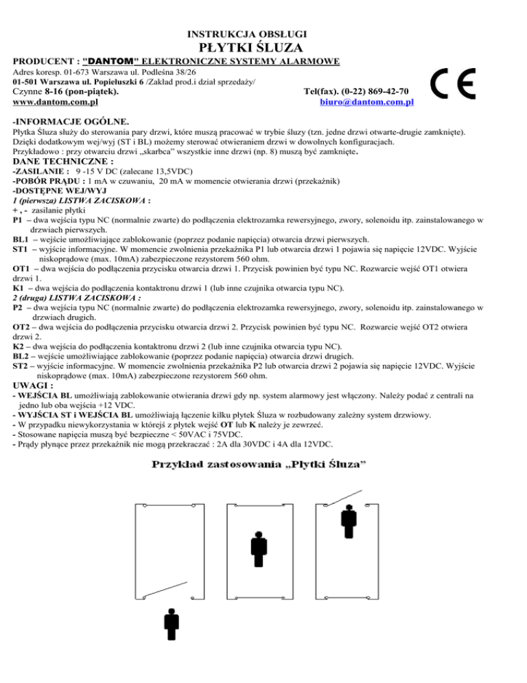 INSTRUKCJA OBSŁUGI PŁYTKI ŚLUZA PRODUCENT : "DANTOM" ELEKTRONICZNE SYSTEMY ALARMOWE Adres koresp. 01-673 Warszawa ul. Podleśna 38/26 01-501 Warszawa ul. Popiełuszki 6 /Zakład prod.i dział sprzedaży/ Czynne 8-16 (pon-piątek). www.dantom.com.pl Tel(fax). (0-22) 869-42-70 [email protected] -INFORMACJE OGÓLNE. Płytka Śluza służy do sterowania pary drzwi, które muszą pracować w trybie śluzy (tzn. jedne drzwi otwarte-drugie zamknięte). Dzięki dodatkowym wej/wyj (ST i BL) możemy sterować otwieraniem drzwi w dowolnych konfiguracjach. Przykładowo : przy otwarciu drzwi „skarbca” wszystkie inne drzwi (np. 8) muszą być zamknięte. DANE TECHNICZNE : -ZASILANIE : 9 -15 V DC (zalecane 13,5VDC) -POBÓR PRĄDU : 1 mA w czuwaniu, 20 mA w momencie otwierania drzwi (przekaźnik) -DOSTĘPNE WEJ/WYJ 1 (pierwsza) LISTWA ZACISKOWA : + , - zasilanie płytki P1 – dwa wejścia typu NC (normalnie zwarte) do podłączenia elektrozamka rewersyjnego, zwory, solenoidu itp. zainstalowanego w drzwiach pierwszych. BL1 – wejście umożliwiające zablokowanie (poprzez podanie napięcia) otwarcia drzwi pierwszych. ST1 – wyjście informacyjne. W momencie zwolnienia przekaźnika P1 lub otwarcia drzwi 1 pojawia się napięcie 12VDC. Wyjście niskoprądowe (max. 10mA) zabezpieczone rezystorem 560 ohm. OT1 – dwa wejścia do podłączenia przycisku otwarcia drzwi 1. Przycisk powinien być typu NC. Rozwarcie wejść OT1 otwiera drzwi 1. K1 – dwa wejścia do podłączenia kontaktronu drzwi 1 (lub inne czujnika otwarcia typu NC). 2 (druga) LISTWA ZACISKOWA : P2 – dwa wejścia typu NC (normalnie zwarte) do podłączenia elektrozamka rewersyjnego, zwory, solenoidu itp. zainstalowanego w drzwiach drugich. OT2 – dwa wejścia do podłączenia przycisku otwarcia drzwi 2. Przycisk powinien być typu NC. Rozwarcie wejść OT2 otwiera drzwi 2. K2 – dwa wejścia do podłączenia kontaktronu drzwi 2 (lub inne czujnika otwarcia typu NC). BL2 – wejście umożliwiające zablokowanie (poprzez podanie napięcia) otwarcia drzwi drugich. ST2 – wyjście informacyjne. W momencie zwolnienia przekaźnika P2 lub otwarcia drzwi 2 pojawia się napięcie 12VDC. Wyjście niskoprądowe (max. 10mA) zabezpieczone rezystorem 560 ohm. UWAGI : - WEJŚCIA BL umożliwiają zablokowanie otwierania drzwi gdy np. system alarmowy jest włączony. Należy podać z centrali na jedno lub oba wejścia +12 VDC. - WYJŚCIA ST i WEJŚCIA BL umożliwiają łączenie kilku płytek Śluza w rozbudowany zależny system drzwiowy. - W przypadku niewykorzystania w którejś z płytek wejść OT lub K należy je zewrzeć. - Stosowane napięcia muszą być bezpieczne < 50VAC i 75VDC. - Prądy płynące przez przekaźnik nie mogą przekraczać : 2A dla 30VDC i 4A dla 12VDC. PRZYKŁADOWE PODŁĄCZENIE DO ZASILANIA PŁYTKI ŚLUZA ZASILACZ 12VDC 12VDC PRZYCISK (zielony) AWARYJNEGO OTWIERANIA DRZWI. 12VDC RYGIEL DRZWI 1 RYGIEL DRZWI 2 P1 PRZYCISK (NC) OTWARCIA DRZWI 1 OT1 P2 PRZYCISK (NC) OTWARCIA DRZWI 2 OT2 KONTAKTRON ZAMONTOWANY W DRZWIACH 1 PODŁĄCZYĆ DO K1. KONTAKTRON ZAMONTOWANY W DRZWIACH 2 PODŁĄCZYĆ DO K2. DRUGIE WEJŚCIE PRZEKAŹNIKA P1 PODŁĄCZ DO MASY. PIERWSZE JEST JUŻ PODŁĄCZONE DO RYGLA DRZWI 1. PODOBNIE POSTĄPIĆ Z P2.