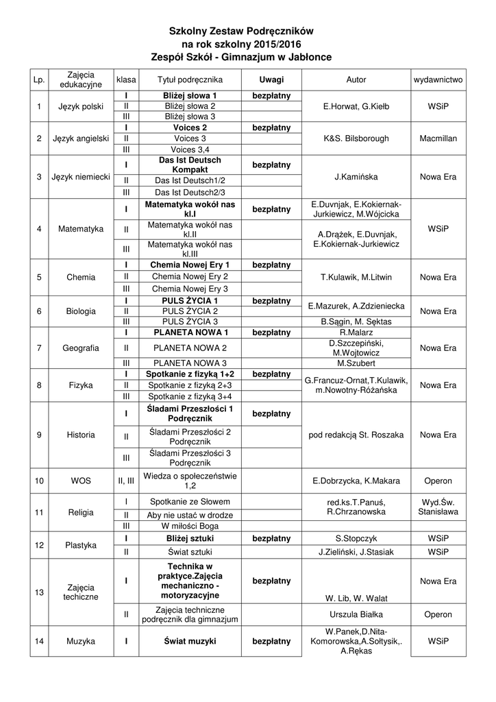 Szkolny Zestaw Podręczników na rok szkolny 2015/2016 Zespół Szkół - Gimnazjum w Jabłonce Lp. Zajęcia edukacyjne 1 Język polski 2 Język angielski 3 Język niemiecki klasa Tytuł podręcznika Uwagi I II III I II III bezpłatny I II Bliżej słowa 1 Bliżej słowa 2 Bliżej słowa 3 Voices 2 Voices 3 Voices 3,4 Das Ist Deutsch Kompakt Das Ist Deutsch1/2 Das Ist Deutsch2/3 Matematyka wokół nas kl.I Matematyka wokół nas kl.II Matematyka wokół nas kl.III Chemia Nowej Ery 1 Chemia Nowej Ery 2 III I II III I Chemia Nowej Ery 3 PULS ŻYCIA 1 PULS ŻYCIA 2 PULS ŻYCIA 3 PLANETA NOWA 1 II PLANETA NOWA 2 III I II III PLANETA NOWA 3 Spotkanie z fizyką 1+2 Spotkanie z fizyką 2+3 Spotkanie z fizyką 3+4 I Śladami Przeszłości 1 Podręcznik I II III I 4 Matematyka II III 5 6 7 8 9 Chemia Biologia Geografia Fizyka Historia II III 10 WOS 11 Religia 12 Plastyka 13 14 Zajęcia techiczne Muzyka Wiedza o społeczeństwie 1,2 I Spotkanie ze Słowem II III I Aby nie ustać w drodze W miłości Boga Bliżej sztuki II Świat sztuki I Technika w praktyce.Zajęcia mechaniczno motoryzacyjne II Zajęcia techniczne podręcznik dla gimnazjum I Świat muzyki wydawnictwo E.Horwat, G.Kiełb WSiP K&S. Bilsborough Macmillan J.Kamińska Nowa Era bezpłatny bezpłatny bezpłatny E.Duvnjak, E.KokiernakJurkiewicz, M.Wójcicka A.Drążek, E.Duvnjak, E.Kokiernak-Jurkiewicz WSiP bezpłatny T.Kulawik, M.Litwin bezpłatny bezpłatny bezpłatny E.Mazurek, A.Zdzieniecka B.Sągin, M. Sęktas R.Malarz D.Szczepiński, M.Wojtowicz M.Szubert Nowa Era Nowa Era Nowa Era G.Francuz-Ornat,T.Kulawik, m.Nowotny-Różańska Nowa Era pod redakcją St. Roszaka Nowa Era E.Dobrzycka, K.Makara Operon red.ks.T.Panuś, R.Chrzanowska Wyd.Św. Stanisława S.Stopczyk WSiP J.Zieliński, J.Stasiak WSiP bezpłatny Śladami Przeszłości 2 Podręcznik Śladami Przeszłości 3 Podręcznik II, III Autor bezpłatny bezpłatny Nowa Era W. Lib, W. Walat bezpłatny Urszula Białka Operon W.Panek,D.NitaKomorowska,A.Sołtysik,. A.Rękas WSiP 15 Edukacja dla bezpieczeństwa III 16 Informatyka I II 17 Wychowanie do I,II,III życia w rodzinie Żyję i działam bezpiecznie Informatyka dla Ciebie Informatyka 2 Wychowanie do życia w rodzinie dla uczniów klas I-III gimnazjum bezpłatny J.Słoma, G.Zając Nowa Era Piotr J. Durka Marek Kołodziej Nowa Era Operon T.Król i inni Rubikon