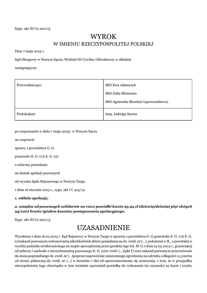 Sygn. akt III Ca 220/15 WYROK W IMIENIU RZECZYPOSPOLITEJ POLSKIEJ Dnia 7 maja 2015 r. Sąd Okręgowy w Nowym Sączu, Wydział III Cywilny Odwoławczy w składzie następującym: Przewodniczący: SSO Ewa Adamczyk SSO Zofia Klisiewicz SSO Agnieszka Skrzekut (sprawozdawca) Protokolant: insp. Jadwiga Sarota po rozpoznaniu w dniu 7 maja 2015r. w Nowym Sączu na rozprawie sprawy z powództwa G. G. przeciwko E. G. (1)i E. G. (2) o ochronę posiadania na skutek apelacji pozwanych od wyroku Sądu Rejonowego w Nowym Targu z dnia 16 stycznia 2015 r., sygn. akt I C 413/14 1. oddala apelację; 2. zasądza od pozwanych solidarnie na rzecz powódki kwotę 95,94 zł (dziewięćdziesiąt pięć złotych 94/100) brutto tytułem kosztów postępowania apelacyjnego. Sygn. akt III Ca 220/15 UZASADNIENIE Wyrokiem z dnia 16.01.2015 r. Sąd Rejonowy w Nowym Targu w sprawie z powództwa G. G.przeciwko E. G. (1)i E. G. (2)zakazał pozwanym wykonywania jakichkolwiek aktów posiadania na dz. ewid. nr (...), położonej w R., a powstałej w wyniku podziału uwidocznionego na mapie sporządzonej przez geodetę mgr inż. M. G.z dnia 13.05.2014 r., graniczącej od północy i zachodu z nieruchomością pozwanego E. G. (1)nr ewid. (...)(pkt I) oraz nakazał pozwanym przywrócenie do stanu poprzedniego dz. ewid. nr (...)poprzez naprawienie zniszczonego ogrodzenia na odcinku o długości 11,5 metra od strony północnej dz. ewid. nr (...) w terminie 7 dni od uprawomocnienia się orzeczenia, z tym, że w przypadku niewypełnienia tego obowiązku w tym terminie upoważnił powódkę do wykonania tej czynności na koszt i ryzyko pozwanych (pkt II). Nadto zasądził od pozwanych solidarnie na rzecz powódki kwotę 529 zł tytułem zwrotu kosztów postępowania, w tym kwotę 312 zł tytułem zwrotu kosztów zastępstwa procesowego (pkt III). Wyrokowi w pkt IV ??? nadał rygor natychmiastowej wykonalności (pkt IV). Sąd Rejonowy ustalił, że dz. ewid. nr (...)powstała z podziału dz. ewid.(...), która to działka jest ujawniona w księdze wieczystej jako własność małżonków E. G. (1)i E. G. (3). Sporna działka stanowi pas gruntu przylegający do działki siedliskowej G. G.i jej męża. Znajduje się ona po zachodniej stronie zabudowań gospodarczych powódki, z tym, że na przedmiot sporu wychodzą wrota, przez które możliwy jest wjazd do budynku gospodarczego od strony przedmiotu sporu. Przedmiot sporu ogrodzony jest od zachodu ogrodzeniem siatkowym na podmurówce betonowej. Podmurówka istnieje również od strony północnej, z tym, że na jej części brak jest aktualnie ogrodzenia siatkowego, a zastąpione jest ono prowizoryczną plastikową siatką, która została założona w wykonaniu postanowienia o udzieleniu zabezpieczenia w niniejszej sprawie. W dalszej części po stronie północnej posesja powódki jest ogrodzona siatką na podmurówce. Od strony wschodniej przedmiot sporu nie ma żadnych granic użytku z dalszą częścią posesji siedliskowej powódki – brak jest granic użytkowania pomiędzy przedmiotem sporu oznaczonym jako dz. ewid. nr (...)a działką powódki i jej męża nr (...)– jest to teren jednolity. Południowo-wschodni narożnik przedmiotu sporu znajduje się w obrębie budynku gospodarczego. Od strony południowej również brak granicy przedmiotu sporu, który przechodzi w sposób niewidoczny w terenie w działkę nr (...), na której położona jest brama wychodząca na drogę publiczną – ulicę (...). Ulica ta w terenie stanowi drogę żwirową, z tym, że taki charakter ma ona do bramy wjazdowej na posesję powódki, a dalej stanowi ona obszar trawiasty z wyraźnymi śladami przejazdów. Na wysokości zachodniego ogrodzenia przedmiotu sporu droga ta jest zastawiona płotem żerdziowym, uniemożliwiającym wjazd z drogi w kierunku zachodnim, tj. w kierunku części działki pozwanego E. G. (1). Dostęp do przedmiotu sporu, wyłączając wrota budynku gospodarczego, odbywa się wyłącznie od strony południowej, tj. od drogi B.. W tym samym kierunku zorientowana jest reszta posesji siedliskowej powódki. Po północnej stronie przedmiotu sporu oraz po stronie zachodniej znajduje się działka i posesja E. G. (1)i jego żony, z tym, że po stronie północnej znajduje się ich działka siedliskowa a od zachodniej – rolna. Posesja siedliskowa pozwanego ogrodzona jest od strony zachodniej, czyli ogrodzenie, które znajduje się w przedłużeniu ogrodzenia zachodniego przedmiotu sporu, przecina działkę pozwanego nr (...) Posesja siedliskowa pozwanego zorientowana jest w stronę północną – w tamtym kierunku zorientowany jest jego dom, od tamtej strony znajduje się brama wychodzącą na inną niż B.drogę. Od strony przedmiotu sporu na posesji pozwanego brak śladów wskazujących na to, że jest ona skomunikowana z przedmiotem sporu. Część posesji pozwanego przylegająca do przedmiotu sporu stanowi kraniec ogrodu pozwanego, nie ma tam żadnej drogi ani ścieżki w kierunku przedmiotu sporu, a jedynie obszar trawiasty. Znajduje się tam słup energetyczny tzw. dwojak, w południowo-zachodniej części posesji pozwanego. Przedmiot sporu w dniu oględzin, przeprowadzonych 10.10. 2014 r. w sprawie o zasiedzenie z wniosku G. i T. G., I Ns 675/14, jawił się jako integralna część posesji powódki i jej męża. W terenie brak granic użytkowania tego terenu z resztą posesji własności powódki. Ogrodzenie siatkowe i podmurówka po północnej stronie przedmiotu sporu ciągnie się dalej na wschód, co sprawia wrażenie, że przedmiot sporu stanowi integralną część posesji powódki, a nie jest połączony z posesją pozwanych. Pozwani ze swojej posesji nie mają bezpośredniego dostępu na przedmiot sporu. Aby dostać się na przedmiot sporu musieliby przejść naokoło, znacznie nakładając drogi. Przy granicach północnych i zachodnich przedmiotu sporu, tj. w pobliżu ogrodzenia znajdują się nasadzenia w postaci drzew. Przy ogrodzeniu od strony zachodniej zn