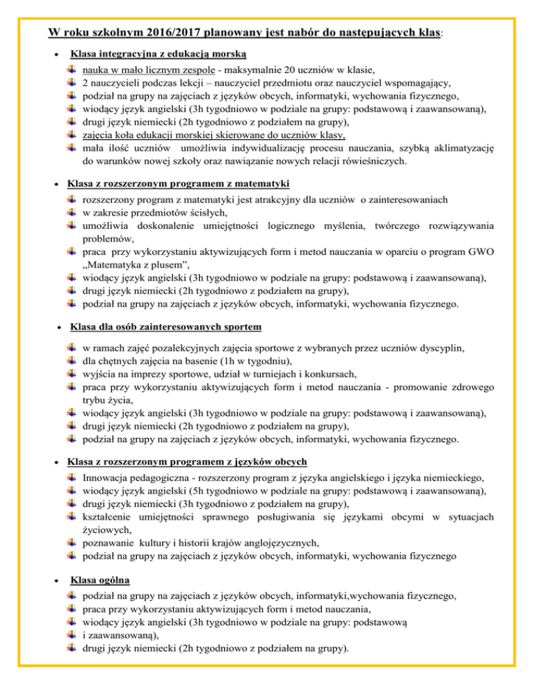 W roku szkolnym 2016/2017 planowany jest nabór do następujących klas: Klasa integracyjna z edukacją morską nauka w mało licznym zespole - maksymalnie 20 uczniów w klasie, 2 nauczycieli podczas lekcji – nauczyciel przedmiotu oraz nauczyciel wspomagający, podział na grupy na zajęciach z języków obcych, informatyki, wychowania fizycznego, wiodący język angielski (3h tygodniowo w podziale na grupy: podstawową i zaawansowaną), drugi język niemiecki (2h tygodniowo z podziałem na grupy), zajęcia koła edukacji morskiej skierowane do uczniów klasy, mała ilość uczniów umożliwia indywidualizację procesu nauczania, szybką aklimatyzację do warunków nowej szkoły oraz nawiązanie nowych relacji rówieśniczych. Klasa z rozszerzonym programem z matematyki rozszerzony program z matematyki jest atrakcyjny dla uczniów o zainteresowaniach w zakresie przedmiotów ścisłych, umożliwia doskonalenie umiejętności logicznego myślenia, twórczego rozwiązywania problemów, praca przy wykorzystaniu aktywizujących form i metod nauczania w oparciu o program GWO „Matematyka z plusem”, wiodący język angielski (3h tygodniowo w podziale na grupy: podstawową i zaawansowaną), drugi język niemiecki (2h tygodniowo z podziałem na grupy), podział na grupy na zajęciach z języków obcych, informatyki, wychowania fizycznego. Klasa dla osób zainteresowanych sportem w ramach zajęć pozalekcyjnych zajęcia sportowe z wybranych przez uczniów dyscyplin, dla chętnych zajęcia na basenie (1h w tygodniu), wyjścia na imprezy sportowe, udział w turniejach i konkursach, praca przy wykorzystaniu aktywizujących form i metod nauczania - promowanie zdrowego trybu życia, wiodący język angielski (3h tygodniowo w podziale na grupy: podstawową i zaawansowaną), drugi język niemiecki (2h tygodniowo z podziałem na grupy), podział na grupy na zajęciach z języków obcych, informatyki, wychowania fizycznego. Klasa z rozszerzonym programem z języków obcych Innowacja pedagogiczna - rozszerzony program z języka angielskiego i języka niemieckiego, wiodący język angielski (5h tygodniowo w podziale na grupy: podstawową i zaawansowaną), drugi język niemiecki (3h tygodniowo z podziałem na grupy), kształcenie umiejętności sprawnego posługiwania się językami obcymi w sytuacjach życiowych, poznawanie kultury i historii krajów anglojęzycznych, podział na grupy na zajęciach z języków obcych, informatyki, wychowania fizycznego Klasa ogólna podział na grupy na zajęciach z języków obcych, informatyki,wychowania fizycznego, praca przy wykorzystaniu aktywizujących form i metod nauczania, wiodący język angielski (3h tygodniowo w podziale na grupy: podstawową i zaawansowaną), drugi język niemiecki (2h tygodniowo z podziałem na grupy).