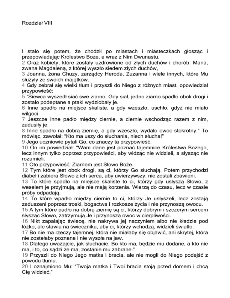 Rozdział VIII I stało się potem, że chodził po miastach i miasteczkach głosząc i przepowiadając Królestwo Boże, a wraz z Nim Dwunastu, 2 Oraz kobiety, które zostały uzdrowione od złych duchów i chorób: Maria, zwana Magdaleną, z której wyszło siedem złych duchów, 3 Joanna, żona Chuzy, zarządcy Heroda, Zuzanna i wiele innych, które Mu służyły ze swoich majątków. 4 Gdy zebrał się wielki tłum i przyszli do Niego z różnych miast, opowiedział przypowieść: 5 “Siewca wyszedł siać swe ziarno. Gdy siał, jedno ziarno spadło obok drogi i zostało podeptane a ptaki wydziobały je. 6 Inne spadło na miejsce skaliste, a gdy wzeszło, uschło, gdyż nie miało wilgoci. 7 Jeszcze inne padło między ciernie, a ciernie wschodząc razem z nim, zadusiły je. 8 Inne spadło na dobrą ziemię, a gdy wzeszło, wydało owoc stokrotny.” To mówiąc, zawołał: “Kto ma uszy do słuchania, niech słucha!” 9 Jego uczniowie pytali Go, co znaczy ta przypowieść. 10 On im powiedział: “Wam dane jest poznać tajemnice Królestwa Bożego, lecz innym tylko poprzez przypowieści, aby widząc nie widzieli, a słysząc nie rozumieli. 11 Oto przypowieść: Ziarnem jest Słowo Boże. 12 Tym które jest obok drogi, są ci, którzy Go słuchają. Potem przychodzi diabeł i zabiera Słowo z ich serca, aby uwierzywszy, nie zostali zbawieni. 13 To które spadło na miejsce skaliste to ci, którzy gdy usłyszą Słowo, z weselem je przyjmują, ale nie mają korzenia. Wierzą do czasu, lecz w czasie próby odpadają. 14 To które wpadło między ciernie to ci, którzy Je usłyszeli, lecz zostają zaduszeni poprzez troski, bogactwa i rozkosze życia i nie przynoszą owocu. 15 A tym które padło na dobrą ziemię są ci, którzy dobrym i szczerym sercem słysząc Słowo, zatrzymują Je i przynoszą owoc w cierpliwości. 16 Nikt zapalając świecę, nie nakrywa jej naczyniem albo nie kładzie pod łóżko, ale stawia na świeczniku, aby ci, którzy wchodzą, widzieli światło. 17 Bo nie ma rzeczy tajemnej, która nie miałaby się objawić, ani skrytej, która nie zostałaby poznana i nie wyszła na jaw. 18 Dlatego uważajcie, jak słuchacie. Bo kto ma, będzie mu dodane, a kto nie ma, i to, co sądzi że ma, zostanie mu zabrane.” 19 Przyszli do Niego Jego matka i bracia, ale nie mogli do Niego podejść z powodu tłumu. 20 I oznajmiono Mu: “Twoja matka i Twoi bracia stoją przed domem i chcą Cię widzieć.” 21 On im odpowiedział: “Moją matką i moimi braćmi są ci, którzy słuchają Słowa Bożego i wypełniają je.” 22 Stało się pewnego dnia, że On oraz Jego uczniowie wsiedli do łodzi i powiedział do nich: “Przeprawmy się za jezioro!”. I odpłynęli. 23 Gdy płynęli, On zasnął. Nad jeziorem rozpętała się nawałnica, zalewając łódź, tak że byli w niebezpieczeństwie. 24 Podchodząc, obudzili Go i powiedzieli: “Mistrzu! Giniemy!” A On wstał i zbeształ wiatr oraz nawałnicę. Ta ucichła i stała się pogoda. 25 Powiedział do nich: “Gdzie jest wasza wiara?” Oni przestraszyli się i dziwili, mówiąc jeden do drugiego: “Jak sądzisz, kim On jest, że rozkazuje wiatrom i jezioru, a słuchają Go?” 26 I przypłynęli do krainy Gerazeńczyków, która znajduje się naprzeciw Galilei. 27 Gdy wyszedł na ląd, wybiegł Mu naprzeciw pewien człowiek, mający od dawna ducha nieczystego. Człowiek ten chodził bez ubrania i nie mieszkał w domu, ale w grobach. 28 Gdy ujrzał Jezusa, upadł przed Nim i wołał wielkim głosem: “Czego chcesz ode mnie, Jezusie, Synu Boga Najwyższego? Proszę Cię, nie męcz mnie!” 29 Gdyż On rozkazał duchowi nieczystemu, aby wyszedł z tego człowieka, bo porywał go od dawna, i wiązano go łańcuchami i strzeżono w pętach, a zrywając więzy bywał zapędzany przez ducha nieczystego na pustynię. 30 Jezus spytał go: “Jak masz na imię?” On powiedział: “Legion”, gdyż weszło w niego wiele złych duchów. 31 I prosiły go, aby im nie kazał iść do czeluści. 32 Było tam wielkie stado świń pasących się na górze i prosiły Go, aby im pozwolił wejść w nie. A On pozwolił im. 33 Duchy nieczyste wyszły więc z człowieka i weszły w świnie, a stado pędem wpadło z urwiska do jeziora i utonęło. 34 Pasterze gdy ujrzeli co się stało, uciekli i dali znać do miasta oraz do wsi. 35 I wyszli, aby oglądać, co się stało. Przyszli do Jezusa i znaleźli człowieka, z którego wyszły duchy nieczyste, siedzącego u Jego nóg, ubranego i przy zdrowych zmysłach, i przestraszyli się. 36 Ci, którzy to widzieli, opowiedzieli im, w jaki sposób został uzdrowiony. 37 Wtedy wielu mieszkańców kraju Gerazeńczyków prosiło Go, aby odszedł od nich, gdyż byli zdjęci wielkim strachem. A On wsiadł do łodzi i wyruszył w drogę powrotną. 38 Człowiek z którego wyszły złe duchy prosił Go, aby mógł przy Nim pozostać. 39 Lecz Jezus odprawił go, mówiąc: “Wróć do twego domu, i opowiadaj, jak wielkie rzeczy uczynił ci Bóg!” I szedł po całym mieście, opowiadając, jak wielkie rzeczy uczynił mu Jezus. 40 Gdy Jezus powrócił, tłum przyjął Go, gdyż wszyscy czekali na Niego. 41 Oto przyszedł człowiek o imieniu Jair, przełożony synagogi. Upadł do nóg Jezusa, prosząc Go, aby przyszedł do jego domu. 42 Miał on córkę jedynaczkę w wieku około dwunastu lat, a ta umierała. I zdarzyło się, gdy szedł, że tłumy ściskały Go. 43 A pewna kobieta od dwunastu lat cierpiała na krwotok. Wydała na lekarzy cały swój majątek, a nikt nie mógł jej wyleczyć. 44 Podeszłą z tyłu i dotknęła skraju Jego szaty, i natychmiast krwotok zatrzymał się. Jezus powiedział: “Kto mnie dotknął?” Gdy wszyscy się tego wypierali, Piotr powiedział: “Mistrzu! Tłumy Cię ściskają i tłoczą się, a Ty mówisz: “Kto Mnie dotknął?”” 46 Jezus powiedział: “Ktoś mnie dotknął, bo Ja wiem, że moc wyszła ze Mnie”. 47 Kobieta widząc, że się nie ukryje, przy