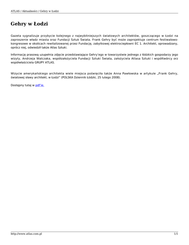ATLAS / Aktualności / Gehry w Łodzi Gehry w Łodzi Gazeta sygnalizuje przybycie kolejnego z najwybitniejszych światowych architektów, goszczącego w Łodzi na zaproszenie władz miasta oraz Fundacji Sztuk Świata. Frank Gehry być może zaprojektuje centrum festiwalowokongresowe w okolicach rewitalizowanej przez Fundację, zabytkowej elektrociepłowni EC 1. Architekt, oprowadzany, oprócz niej, odwiedził także Atlas Sztuki. Informację prasową uzupełnia zdjęcie przedstawiające Gehry’ego w towarzystwie jednego z łódzkich gospodarzy jego wizyty, Andrzeja Walczaka, współzałożyciela Fundacji Sztuki Świata, założyciela Atlasa Sztuki i współtwórcy orz współwłaściciela GRUPY ATLAS. Wizycie amerykańskiego architekta wiele miejsca poświęciła także Anna Pawłowska w artykule „Frank Gehry, światowej sławy architekt, w Łodzi” (POLSKA Dziennik Łódzki, 25 lutego 2008). Dostępny tutaj w pdf’ie. http://www.atlas.com.pl 1/1