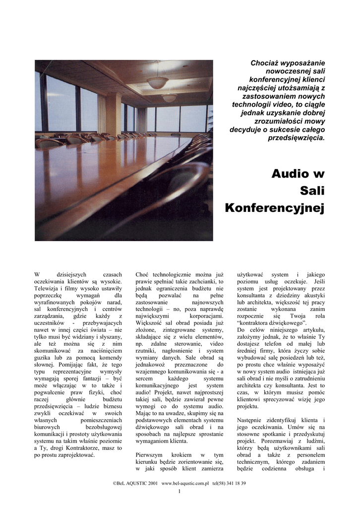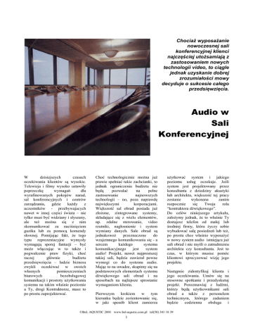 Chociaż wyposażanie nowoczesnej sali konferencyjnej klienci najczęściej utożsamiają z zastosowaniem nowych technologii video, to ciągle jednak uzyskanie dobrej zrozumiałości mowy decyduje o sukcesie całego przedsięwzięcia. Audio w Sali Konferencyjnej W dzisiejszych czasach oczekiwania klientów są wysokie. Telewizja i filmy wysoko ustawiły poprzeczkę wymagań dla wyrafinowanych pokojów narad, sal konferencyjnych i centrów zarządzania, gdzie każdy z uczestników - przebywajacych nawet w innej części świata – nie tylko musi być widziany i słyszany, ale też można się z nim skomunikować za naciśnięciem guzika lub za pomocą komendy słownej. Pomijając fakt, że tego typu reprezentacyjne wymysły wymagają sporej fantazji – być może włączając w to także i pogwałcenie praw fizyki, choć raczej głównie budżetu przedsięwzięcia – ludzie biznesu zwykli oczekiwać w swoich własnych pomieszczeniach biurowych bezobsługowej komunikacji i prostoty użytkowania systemu na takim właśnie poziomie a Ty, drogi Kontraktorze, masz to po prostu zaprojektować. Choć technologicznie można już prawie spełniać takie zachcianki, to jednak ograniczenia budżetu nie będą pozwalać na pełne zastosowanie najnowszych technologii – no, poza naprawdę największymi korporacjami. Większość sal obrad posiada już złożone, zintegrowane systemy, składające się z wielu elementów, np. zdalne sterowanie, video rzutniki, nagłosnienie i system wymiany danych. Sale obrad są jednakowoż przeznaczone do wzajemnego komunikowania się - a sercem każdego systemu komunikacyjnego jest system audio! Projekt, nawet najprostszej takiej sali, będzie zawierał pewne wymogi co do systemu audio. Mając to na uwadze, skupimy się na podstawowych elementach systemu dźwiękowego sali obrad i na sposobach na najlepsze sprostanie wymaganiom klienta. Pierwszym krokiem w tym kierunku będzie zorientowanie się, w jaki sposób klient zamierza użytkować system i jakiego poziomu usług oczekuje. Jeśli system jest projektowany przez konsultanta z dziedziny akustyki lub architekta, większość tej pracy zostanie wykonana zanim rozpocznie się Twoja rola “kontraktora dźwiękowego”. Do celów niniejszego artykułu, założymy jednak, że to właśnie Ty dostajesz telefon od małej lub średniej firmy, która życzy sobie wybudować salę posiedzeń lub też, po prostu chce właśnie wyposażyć w nowy system audio istniejąca już sali obrad i nie myśli o zatrudnieniu architekta czy konsultanta. Jest to czas, w którym musisz pomóc klientowi sprecyzować wizję jego projektu. Następnie zidentyfikuj klienta i jego oczekiwania. Umów się na stosowne spotkanie i przedyskutuj projekt. Porozmawiaj z ludźmi, którzy będą użytkownikami sali obrad a także z personelem technicznym, którego zadaniem będzie codzienna obsługa i ©BeL AQUSTIC 2001 www.bel-aqustic.com.pl tel(58) 341 18 39 1 Rys 1. Przykład fal stojących. użytkowanie systemu audio. Każdy z Twoich rozmówców przedstawi zapewne inne oczekiwania co do funkcji, które system ma spełniać. Rozwiej wszelkie nierealistyczne oczekiwania i pomóż klientowi określić, czego tak naprawdę oczekuje. Zadawaj mnóstwo pytań ! Żeby zaprojektować i zainstalować taki system, który spełni wymagania klienta, absolutnie niezbędne jest ustalenie w jaki sposób pomieszczenie będzie użytkowane? Jakie ma rozmiary? Jak jest zbudowane? Z czego wykonane są ściany, podłoga i sufit? Czy pomieszczenie jest wielofunkcyjne? Czy można podzielić pomieszczenie tak by pomieściło kilka spotkań jednocześnie? Jakie systemy prezentacji będą w użyciu? Czy przewiduje się prowadzenie zdalnych konferencji? A co z video? itp... Dość powszechnie w salach konferencyjnych odtwarzane są nagrane materiały audiowizualne, oglądane programy telewizyjne i satelitarne, stosuje się nagłośnienie prelegentów oraz prowadzi sie video- i telekonferencje. Zasugeruj zastosowania znane Ci z doświadczenia, tak by upewnić się, że klient o niczym istotnym nie zapomniał. Jeśli przyjdzie Ci instalować system w istniejącym pomieszczeniu, sprawdź je dokładnie. Jeśli pomieszczenie istnieje tylko na desce kreślarskiej, porozmawiaj z architektem i projektantami. Jedną z zasadniczych spraw przy pracy z dźwiękiem jest określenie odległości jaką ma on pokonywać. Może nagłośnienie nie jest wcale konieczne? Pamiętaj o podstawowych zasadach, na przykład: ile głośników będzie trzeba zastosować i jak najlepiej je rozmieścić? Sale o niskich sufitach będą potrzebować zwykle więcej głośników do zapewnienia dostatecznego pokrycia, niż sale wysokie. Zaskakujące, ale sale średniej wielkości zwykle cechują lepsze własności akustyczne niż sale małe i duże. Istniejące sale posiedzeń lub pomieszczenia biurowe, przeznaczone do adaptacji na sale obrad, będą mieć zapewne ściany pokryte tynkiem, płytą gipsowokartonową lub panelami, podłogi wyłożone wykładziną dywanową a sufit płytkami dźwiękochłonnymi. Nowsze pomieszczenia będą zapewne posiadać nowoczesne elementy wystroju wliczając w to ściany ze szkła, marmurowe podłogi, wysokie sufity i wielkie stoły o twardej powierzchni. Pamiętaj, że każda z tych powierzchni pochłania lub odbija fale dźwiękowe w inny sposób! Charakterystyki tłumienia dźwięku w pomieszczeniu zmieniają się wraz z długością fali dźwiękowej. Odbicia dźwięku mogą powodować, że fale dźwiękowe nieco przesunięte w fazie - będą znosić się wzajemnie dając w efekcie tzw. “martwe punkty”. W podobny sposób fale dźwiękowe mogą się dodawać, co może powodować niestabilność systemu a w konsekwencji powstawanie sprzężeń lub miejsc, w których dźwięk będzie bardziej skoncentrowany. W dodatku, fala dźwiękowa może wielokrotnie odbijać się między parą płaskich, równoległych powierzchni ścian, wywołując efekt fali stojącej o częs