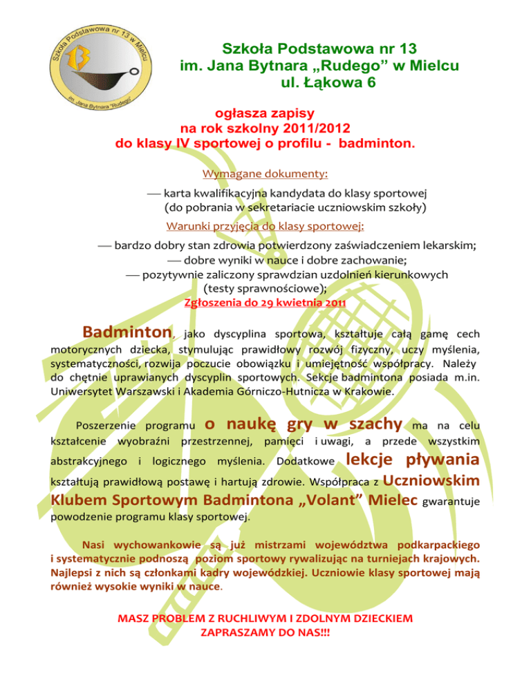 Szkoła Podstawowa nr 13 im. Jana Bytnara „Rudego” w Mielcu ul. Łąkowa 6 ogłasza zapisy na rok szkolny 2011/2012 do klasy IV sportowej o profilu - badminton. Wymagane dokumenty: ⎯ karta kwalifikacyjna kandydata do klasy sportowej (do pobrania w sekretariacie uczniowskim szkoły) Warunki przyjęcia do klasy sportowej: ⎯ bardzo dobry stan zdrowia potwierdzony zaświadczeniem lekarskim; ⎯ dobre wyniki w nauce i dobre zachowanie; ⎯ pozytywnie zaliczony sprawdzian uzdolnień kierunkowych (testy sprawnościowe); Zgłoszenia do 29 kwietnia 2011 Badminton, jako dyscyplina sportowa, kształtuje całą gamę cech motorycznych dziecka, stymulując prawidłowy rozwój fizyczny, uczy myślenia, systematyczności, rozwija poczucie obowiązku i umiejętność współpracy. Należy do chętnie uprawianych dyscyplin sportowych. Sekcje badmintona posiada m.in. Uniwersytet Warszawski i Akademia Górniczo‐Hutnicza w Krakowie. Poszerzenie programu o naukę gry w szachy ma na celu kształcenie wyobraźni przestrzennej, pamięci i uwagi, a przede wszystkim abstrakcyjnego i logicznego myślenia. Dodatkowe lekcje pływania kształtują prawidłową postawę i hartują zdrowie. Współpraca z Uczniowskim Klubem Sportowym Badmintona „Volant” Mielec gwarantuje powodzenie programu klasy sportowej. Nasi wychowankowie są już mistrzami województwa podkarpackiego i systematycznie podnoszą poziom sportowy rywalizując na turniejach krajowych. Najlepsi z nich są członkami kadry wojewódzkiej. Uczniowie klasy sportowej mają również wysokie wyniki w nauce. MASZ PROBLEM Z RUCHLIWYM I ZDOLNYM DZIECKIEM ZAPRASZAMY DO NAS!!!