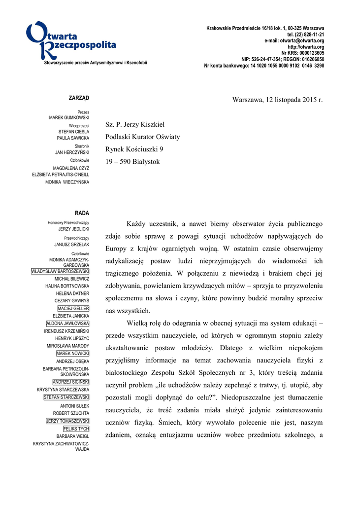 Stowarzyszenie przeciw Antysemityzmowi i Ksenofobii ZARZĄD Krakowskie Przedmieście 16/18 lok. 1, 00-325 Warszawa tel. (22) 828-11-21 e-mail: [email protected] http://otwarta.org Nr KRS: 0000123605 NIP: 526-24-47-354; REGON: 016266850 Nr konta bankowego: 14 1020 1055 0000 9102 0146 3298 Warszawa, 12 listopada 2015 r. Prezes MAREK GUMKOWSKI Wiceprezesi STEFAN CIEŚLA PAULA SAWICKA Skarbnik JAN HERCZYŃSKI Członkowie MAGDALENA CZYŻ ELŻBIETA PETRAJTIS-O’NEILL Sz. P. Jerzy Kiszkiel Podlaski Kurator Oświaty Rynek Kościuszki 9 19 – 590 Białystok MONIKA WIECZYŃSKA RADA Honorowy Przewodniczący JERZY JEDLICKI Przewodniczący JANUSZ GRZELAK Członkowie MONIKA ADAMCZYKGARBOWSKA WŁADYSŁAW BARTOSZEWSKI MICHAŁ BILEWICZ HALINA BORTNOWSKA HELENA DATNER CEZARY GAWRYŚ MACIEJ GELLER ELŻBIETA JANICKA ALDONA JAWŁOWSKA IRENEUSZ KRZEMIŃSKI HENRYK LIPSZYC MIROSŁAWA MARODY MAREK NOWICKI Każdy uczestnik, a nawet bierny obserwator życia publicznego zdaje sobie sprawę z powagi sytuacji uchodźców napływających do Europy z krajów ogarniętych wojną. W ostatnim czasie obserwujemy radykalizację postaw ludzi nieprzyjmujących do wiadomości ich tragicznego położenia. W połączeniu z niewiedzą i brakiem chęci jej zdobywania, powielaniem krzywdzących mitów – sprzyja to przyzwoleniu społecznemu na słowa i czyny, które powinny budzić moralny sprzeciw nas wszystkich. Wielką rolę do odegrania w obecnej sytuacji ma system edukacji – przede wszystkim nauczyciele, od których w ogromnym stopniu zależy ukształtowanie postaw młodzieży. Dlatego z wielkim niepokojem ANDRZEJ OSĘKA przyjęliśmy informacje na temat zachowania nauczyciela fizyki z BARBARA PETROZOLINSKOWROŃSKA białostockiego Zespołu Szkół Społecznych nr 3, który treścią zadania ANDRZEJ SICIŃSKI KRYSTYNA STARCZEWSKA STEFAN STARCZEWSKI ANTONI SUŁEK ROBERT SZUCHTA JERZY TOMASZEWSKI FELIKS TYCH BARBARA WEIGL KRYSTYNA ZACHWATOWICZWAJDA uczynił problem „ile uchodźców należy zepchnąć z tratwy, tj. utopić, aby pozostali mogli dopłynąć do celu?”. Niedopuszczalne jest tłumaczenie nauczyciela, że treść zadania miała służyć jedynie zainteresowaniu uczniów fizyką. Śmiech, który wywołało polecenie nie jest, naszym zdaniem, oznaką entuzjazmu uczniów wobec przedmiotu szkolnego, a świadectwem niedojrzałości, której ignorowanie może prowadzić do moralnego zobojętnienia na ludzką krzywdę. Nelson Mandela mówił, że „edukacja jest najpotężniejszą bronią, której możemy użyć, aby zmienić świat”. Dlatego zwracamy się do Pana nie tylko o wyciągnięcie konsekwencji wobec pedagoga, ale przede wszystkim z prośbą o zainicjowanie działań edukacyjnych, zarówno wobec uczniów jak i dla nauczycieli, które uniemożliwią szerzenie się i propagowanie takich postaw. W obecnej sytuacji potrzeba rzetelnej informacji i rzeczowej dyskusji jest potrzebą palącą. Marek Gumkowski Prezes Stowarzyszenia Otwarta Rzeczpospolita