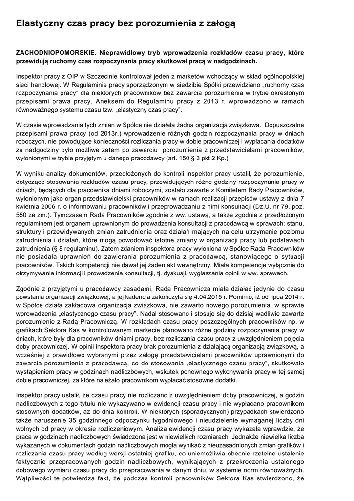 Elastyczny czas pracy bez porozumienia z załogą ZACHODNIOPOMORSKIE. Nieprawidłowy tryb wprowadzenia rozkładów czasu pracy, które przewidują ruchomy czas rozpoczynania pracy skutkował pracą w nadgodzinach. Inspektor pracy z OIP w Szczecinie kontrolował jeden z marketów wchodzący w skład ogólnopolskiej sieci handlowej. W Regulaminie pracy sporządzonym w siedzibie Spółki przewidziano „ruchomy czas rozpoczynania pracy” dla niektórych pracowników bez zawarcia porozumienia w trybie określonym przepisami prawa pracy. Aneksem do Regulaminu pracy z 2013 r. wprowadzono w ramach równoważnego systemu czasu tzw. „elastyczny czas pracy”. W czasie wprowadzania tych zmian w Spółce nie działała żadna organizacja związkowa. Dopuszczalne przepisami prawa pracy (od 2013r.) wprowadzenie różnych godzin rozpoczynania pracy w dniach roboczych, nie powodujące konieczności rozliczania pracy w dobie pracowniczej i wypłacania dodatków za nadgodziny było możliwe zatem po zawarciu porozumienia z przedstawicielami pracowników, wyłonionymi w trybie przyjętym u danego pracodawcy (art. 150 § 3 pkt 2 Kp.). W wyniku analizy dokumentów, przedłożonych do kontroli inspektor pracy ustalił, że porozumienie, dotyczące stosowania rozkładów czasu pracy, przewidujących różne godziny rozpoczynania pracy w dniach, będących dla pracownika dniami roboczymi, zostało zawarte z Komitetem Rady Pracowników, wyłonionym jako organ przedstawicielski pracowników w ramach realizacji przepisów ustawy z dnia 7 kwietnia 2006 r. o informowaniu pracowników i przeprowadzaniu z nimi konsultacji (Dz.U. nr 79, poz. 550 ze zm.). Tymczasem Rada Pracowników zgodnie z ww. ustawą, a także zgodnie z przedłożonym regulaminem jest organem uprawnionym do prowadzenia konsultacji z pracodawcą w sprawach: stanu, struktury i przewidywanych zmian zatrudnienia oraz działań mających na celu utrzymanie poziomu zatrudnienia i działań, które mogą powodować istotne zmiany w organizacji pracy lub podstawach zatrudnienia (§ 8 regulaminu). Zatem zdaniem inspektora pracy wyłoniona w Spółce Rada Pracowników nie posiadała uprawnień do zawierania porozumienia z pracodawcą, stanowiącego o sytuacji pracowników. Takich kompetencji nie dawał jej żaden akt wewnętrzny. Miała kompetencje wyłącznie do otrzymywania informacji i prowadzenia konsultacji, tj. dyskusji, wygłaszania opinii w ww. sprawach. Zgodnie z przyjętymi u pracodawcy zasadami, Rada Pracownicza miała działać jedynie do czasu powstania organizacji związkowej, a jej kadencja zakończyła się 4.04.2015 r. Pomimo, iż od lipca 2014 r. w Spółce działa zakładowa organizacja związkowa, nie zawarto nowego porozumienia, w sprawie wprowadzenia „elastycznego czasu pracy”. Nadal stosowano i stosuje się do dzisiaj wadliwie zawarte porozumienie z Radą Pracowniczą. W rozkładach czasu pracy poszczególnych pracowników np. w grafikach Sektora Kas w kontrolowanym markecie planowano różne godziny rozpoczynania pracy w dniach, które były dla pracowników dniami pracy, bez rozliczania czasu pracy z uwzględnieniem pojęcia doby pracowniczej. W opinii inspektora pracy brak porozumienia z działającą organizacją związkową, a wcześniej z prawidłowo wybranymi przez załogę przedstawicielami pracowników uprawnionymi do zawarcia porozumienia z pracodawcą, co do stosowania „elastycznego czasu pracy”, skutkowało wystąpieniem pracy w godzinach nadliczbowych, wskutek ponownego wykonywania pracy w tej samej dobie pracowniczej, za które należało pracownikom wypłacać stosowne dodatki. Inspektor pracy ustalił, że czasu pracy nie rozliczano z uwzględnieniem doby pracowniczej, a godzin nadliczbowych z tego tytułu nie wykazywano w ewidencji czasu pracy i nie wypłacano pracownikom stosownych dodatków, aż do dnia kontroli. W niektórych (sporadycznych) przypadkach stwierdzono także naruszenie 35 godzinnego odpoczynku tygodniowego i nieudzielenie wymaganej liczby dni wolnych od pracy w okresie rozliczeniowym. Analiza ewidencji czasu pracy wykazała wprawdzie, że praca w godzinach nadliczbowych świadczona jest w niewielkich rozmiarach. Jednakże niewielka liczba wykazanych w dokumentach godzin nadliczbowych mogła wynikać z nieuzasadnionych zmian grafików i rozliczania czasu pracy według wersji ostatniej grafiku, co uniemożliwia obecnie rzetelne ustalenie faktycznie przepracowanych godzin nadliczbowych, wynikających z przekroczenia ustalonego dobowego wymiaru czasu pracy do przepracowania w danym dniu, w systemie norm równoważnych. Wątpliwości te potwierdza fakt, że podczas kontroli pracowników Sektora Kas stwierdzono, że szczegółowe rozkłady czasu pracy poszczególnych pracowników (grafiki) sporządzane na okres jednego miesiąca podawane były do wiadomości pracowników, bez zachowania art. 129 § 3 Kodeksu pracy, a także postanowień Regulaminu pracy (mniej korzystnych niż przepisy Kodeksu pracy). Grafiki były wielokrotnie zmieniane (nawet kilkanaście razy w ciągu miesiąca). Niejednokrotnie podawane były do wiadomości pracowników „z dnia na dzień”, bez żadnego szczególnego uzasadnienia. Ostatnia wersja grafiku (np. 19) jako „grafik wykonywany” odpowiadała zapisom w ewidencji czasu pracy. Inspektor pracy stwierdził zatem, że tak sporządzane grafiki, dla systemu równoważnych norm czasu pracy, z możliwością wydłużenia dobowego wymiaru czasu pracy do 12 godzin, nie mogą stanowić podstawy do prawidłowego rozliczenia czasu pracy pracowników w danym okresie rozliczeniowym. Ponadto zmiany rozkładu czasu pracy w grafikach, następowały generalnie bez żadnego wcześniejszego uzgodnienia, porozumienia z pracownikami i bez uwzględnienia potrzeb pracowników, co mocno dezorganizowało ich życie osobiste i rodzinne. W wyniku stwierdzonych nieprawidłowości inspektor pracy skierował wystąpienie do pracodawcy Centrali Spółki w Warszawie, zawierające 9 wniosków, mi