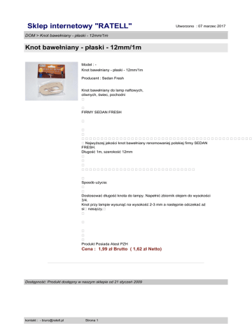 Sklep internetowy "RATELL" Utworzono : 07 marzec 2017 DOM > Knot bawełniany - płaski - 12mm/1m Knot bawełniany - płaski - 12mm/1m Model : Knot bawełniany - płaski - 12mm/1m Producent : Sedan Fresh Knot bawełniany do lamp naftowych, oliwnych, świec, pochodni � � FIRMY SEDAN FRESH � � � ��������������������������������������������� �Najwyższej jakości knot bawełniany renomowaniej polskiej firmy SEDAN FRESH. Długość 1m, szerokość 12mm � � � ������������������������������ � Sposób użycia: � � Dostosować długość knota do lampy. Napełnić zbiornik olejem do wysokości 3/4. Knot przy lampie wysunąć na wysokość 2-3 mm a następnie odczekać aż si�nasączy.� � � � � � Produkt Posiada Atest PZH Cena : 1,99 zł Brutto ( 1,62 zł Netto) Dostępność: Produkt dostępny w naszym sklepie od 21 styczeń 2009 kontakt : - [email protected] Strona 1
