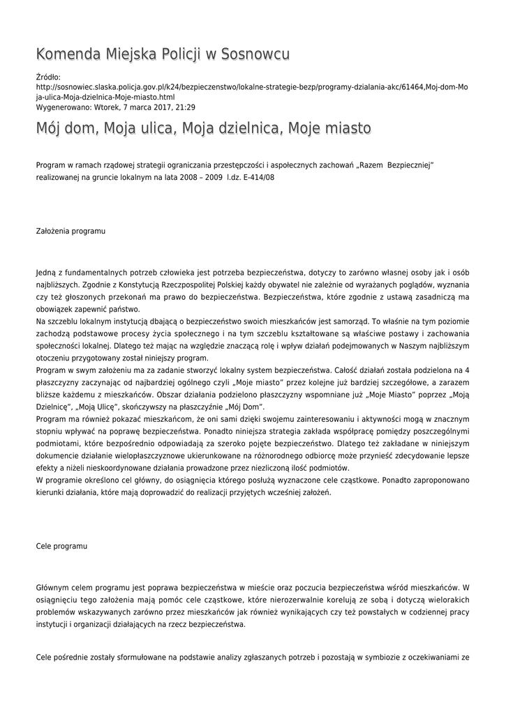 Komenda Miejska Policji w Sosnowcu Źródło: http://sosnowiec.slaska.policja.gov.pl/k24/bezpieczenstwo/lokalne-strategie-bezp/programy-dzialania-akc/61464,Moj-dom-Mo ja-ulica-Moja-dzielnica-Moje-miasto.html Wygenerowano: Wtorek, 7 marca 2017, 21:29 Mój dom, Moja ulica, Moja dzielnica, Moje miasto Program w ramach rządowej strategii ograniczania przestępczości i aspołecznych zachowań „Razem Bezpieczniej” realizowanej na gruncie lokalnym na lata 2008 – 2009 l.dz. E-414/08 Założenia programu Jedną z fundamentalnych potrzeb człowieka jest potrzeba bezpieczeństwa, dotyczy to zarówno własnej osoby jak i osób najbliższych. Zgodnie z Konstytucją Rzeczpospolitej Polskiej każdy obywatel nie zależnie od wyrażanych poglądów, wyznania czy też głoszonych przekonań ma prawo do bezpieczeństwa. Bezpieczeństwa, które zgodnie z ustawą zasadniczą ma obowiązek zapewnić państwo. Na szczeblu lokalnym instytucją dbającą o bezpieczeństwo swoich mieszkańców jest samorząd. To właśnie na tym poziomie zachodzą podstawowe procesy życia społecznego i na tym szczeblu kształtowane są właściwe postawy i zachowania społeczności lokalnej. Dlatego też mając na względzie znaczącą rolę i wpływ działań podejmowanych w Naszym najbliższym otoczeniu przygotowany został niniejszy program. Program w swym założeniu ma za zadanie stworzyć lokalny system bezpieczeństwa. Całość działań została podzielona na 4 płaszczyzny zaczynając od najbardziej ogólnego czyli „Moje miasto” przez kolejne już bardziej szczegółowe, a zarazem bliższe każdemu z mieszkańców. Obszar działania podzielono płaszczyzny wspomniane już „Moje Miasto” poprzez „Moją Dzielnicę”, „Moją Ulicę”, skończywszy na płaszczyźnie „Mój Dom”. Program ma również pokazać mieszkańcom, że oni sami dzięki swojemu zainteresowaniu i aktywności mogą w znacznym stopniu wpływać na poprawę bezpieczeństwa. Ponadto niniejsza strategia zakłada współpracę pomiędzy poszczególnymi podmiotami, które bezpośrednio odpowiadają za szeroko pojęte bezpieczeństwo. Dlatego też zakładane w niniejszym dokumencie działanie wielopłaszczyznowe ukierunkowane na różnorodnego odbiorcę może przynieść zdecydowanie lepsze efekty a niżeli nieskoordynowane działania prowadzone przez niezliczoną ilość podmiotów. W programie określono cel główny, do osiągnięcia którego posłużą wyznaczone cele cząstkowe. Ponadto zaproponowano kierunki działania, które mają doprowadzić do realizacji przyjętych wcześniej założeń. Cele programu Głównym celem programu jest poprawa bezpieczeństwa w mieście oraz poczucia bezpieczeństwa wśród mieszkańców. W osiągnięciu tego założenia mają pomóc cele cząstkowe, które nierozerwalnie korelują ze sobą i dotyczą wielorakich problemów wskazywanych zarówno przez mieszkańców jak również wynikających czy też powstałych w codziennej pracy instytucji i organizacji działających na rzecz bezpieczeństwa. Cele pośrednie zostały sformułowane na podstawie analizy zgłaszanych potrzeb i pozostają w symbiozie z oczekiwaniami ze strony społeczności lokalnej miasta Sosnowca. Do zadań cząstkowych zaliczono min: ● zwiększenie poczucia bezpieczeństwa mieszkańców miasta; ● skrócenie czasu oczekiwania na interwencję; ● zahamowanie oraz ograniczenie ilości przestępstw i wykroczeń popełnianych w środkach komunikacji; ● poprawę bezpieczeństwa w ruchu drogowym; ● wzrost zaufania oraz poprawa wizerunku instytucji działających na rzecz bezpieczeństwa publicznego; ● edukację przedstawicieli różnego rodzaju grup społecznych szczególnie narażonych na stanie się ofiarą; ● rozwój i promocję alternatywnych sposobów spędzania wolnego czasu; ● odpowiednie - adekwatne do potrzeb kierowanie sił policyjnych w stosunku do występujących zagrożeń; ● ograniczenie ilości wykroczeń o charakterze chuligańskim oraz najbardziej uciążliwych dla społeczności lokalnej; ● stałą współpraca pomiędzy dzielnicowym a zarządcą budynków. ● Podmioty zaangażowane w realizację programu Niniejszy Program w głównej mierze realizowany jest będzie przez funkcjonariuszy Komendy Miejskiej Policji w Sosnowcu. Jednakże biorąc pod uwagę posiadane kompetencje i uprawnienia, ktorymi dysponuja policjanci należy wskazać, iż bez zaangażowania innych podmiotów, a zwłaszcza adresatów programu żadna formacja nie jest w stanie w pełni zapobiec wystepowaniu niekorzystnych zjawisk. Dlatego też niezwykle istotne jest zaangażowanie społeczności lokalnej, uświadomienie mieszkańców, że oni nie tylko mogą a wręcz powinni swoimi działaniami wpływać na poziom bezpieczeństwa. Bardzo istotne jest również wsparcie i wkład władz lokalnych gdzyż pomąc zwłaszcza finansowa której udzielają przy tego typu przedsięwzięciach jest bardzo ważnym elementem. W momencie tym nie sposób pominąć miejscowej Straży Miejskiej, która bardzo aktywnie włącza się w realizację tego rodzaju przedsięwzięć. Jest to o tyle istotna formacja, że posiadane przez nią kompetencje i uprawnienia uzupełnianiją się z posiadanymi przez Policję. Promocja programu Niezwykle istotną rolą programu jest jego odpowiednie nagłośnienie w lokalnych mediach a za razem dotarcie z treściami programowymi do jak największej ilości odbiorców, przedstawienie i przybliżenie im głównych założeń programu jak również metod i środków użytych do osiągnięcia wyznaczonych celów. Można więc użyć sformułowania, że promocja omawianego przedsięwzięcia jest jego integralną i nierozerwalną częścią i jednocześnie bardzo ważnym elementem działań programowych. Ocena realizacji programu Ocena stopnia realizacji założeń zawartych w programie będzie odbywać się w systemie półrocznym z tym jednak zastrzeżeniem, że pierwsze podsumowanie nastąpi po pierwszym półroczu 20