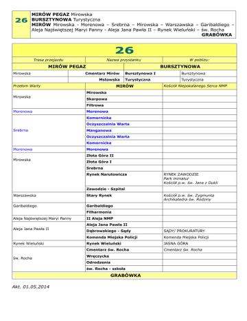 26 MIRÓW PEGAZ Mirowska BURSZTYNOWA Turystyczna MIRÓW Mirowska - Morenowa – Srebrna – Mirowska – Warszawska – Garibaldiego – Aleja Najświętszej Maryi Panny - Aleja Jana Pawła II – Rynek Wieluński – św. Rocha GRABÓWKA 26 Trasa przejazdu Nazwa przystanku MIRÓW PEGAZ Mirowska W pobliżu: BURSZTYNOWA Cmentarz Mirów Mstowska Bursztynowa I Bursztynowa Turystyczna Turystyczna MIRÓW Przełom Warty Kościół Niepokalanego Serca NMP Mirowska Mirowska Skarpowa Filtrowa Morenowa Morenowa Komornicka Oczyszczalnia Warta Srebrna Manganowa Oczyszczalnia Warta Komornicka Morenowa Morenowa Złota Góra II Mirowska Złota Góra I Srebrna Rynek Narutowicza RYNEK ZAWODZIE Park miniatur Kościół p.w. św. Jana z Dukli Zawodzie - Szpital Warszawska Stary Rynek Garibaldiego Garibaldiego Kościół p.w. św. Zygmunta Archikatedra św. Rodziny Filharmonia Aleja Najświętszej Maryi Panny Aleja Jana Pawła II Rynek Wieluński św. Rocha II Aleja NMP Aleja Jana Pawła II Dąbrowskiego - Sądy SĄDY/ PROKURATURY Komenda Miejska Policji Komenda Miejska Policji Rynek Wieluński JASNA GÓRA Cmentarz św. Rocha Cmentarz św. Rocha Wręczycka Odrodzenia św. Rocha - szkoła GRABÓWKA Akt. 01.05.2014 26 GRABÓWKA św. Rocha – Rynek Wieluński – Aleja Jana Pawła II – Aleja Kościuszki - Aleja Najświętszej Maryi Panny – Piłsudskiego – Katedralna - Warszawska – Mirowska – Srebrna – Morenowa – Mirowska MIRÓW Turystyczna – BURSZTYNOWA Mirowska - MIRÓW PEGAZ 26 Trasa przejazdu Nazwa przystanku W pobliżu: GRABÓWKA św. Rocha - szkoła Odrodzenia św. Rocha Wręczycka Rynek Wieluński Aleja Jana Pawła II Cmentarz św. Rocha Cmentarz św. Rocha Rynek Wieluński JASNA GÓRA Komenda Miejska Policji Komenda Miejska Policji Dąbrowskiego - Sądy SĄDY/ PROKURATURY Aleja Jana Pawła II Aleja Najświętszej Maryi Panny II Aleja NMP Katedralna Katedralna Stary Rynek Plac Daszyńskiego Kościół św. Zygmunta Zawodzie - Szpital Mirowska Rynek Narutowicza RYNEK ZAWODZIE Kościół p.w. św. Jana z Dukli Srebrna Złota Góra I Złota Góra II Morenowa Morenowa Komornicka Oczyszczalnia Warta Srebrna Manganowa Oczyszczalnia Warta Komornicka Morenowa Morenowa Filtrowa Mirowska Skarpowa Mirowska Przełom Warty MIRÓW Mirowska Mstowska Cmentarz Mirów BURSZTYNOWA Kościół Niepokalanego Serca NMP Turystyczna Turystyczna Bursztynowa I Bursztynowa MIRÓW PEGAZ