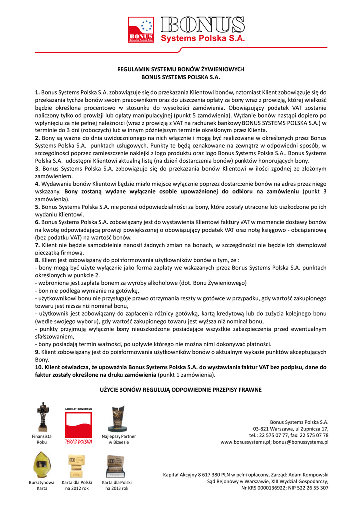 REGULAMIN SYSTEMU BONÓW ŻYWIENIOWYCH BONUS SYSTEMS POLSKA S.A. 1. Bonus Systems Polska S.A. zobowiązuje się do przekazania Klientowi bonów, natomiast Klient zobowiązuje się do przekazania tychże bonów swoim pracownikom oraz do uiszczenia opłaty za bony wraz z prowizją, której wielkość będzie określona procentowo w stosunku do wysokości zamówienia. Obowiązujący podatek VAT zostanie naliczony tylko od prowizji lub opłaty manipulacyjnej (punkt 5 zamówienia). Wydanie bonów nastąpi dopiero po wpłynięciu za nie pełnej należności (wraz z prowizją z VAT na rachunek bankowy BONUS SYSTEMS POLSKA S.A.) w terminie do 3 dni (roboczych) lub w innym późniejszym terminie określonym przez Klienta. 2. Bony są ważne do dnia uwidocznionego na nich włącznie i mogą być realizowane w określonych przez Bonus Systems Polska S.A. punktach usługowych. Punkty te będą oznakowane na zewnątrz w odpowiedni sposób, w szczególności poprzez zamieszczenie naklejki z logo produktu oraz logo Bonus Systems Polska S.A.. Bonus Systems Polska S.A. udostępni Klientowi aktualną listę (na dzień dostarczenia bonów) punktów honorujących bony. 3. Bonus Systems Polska S.A. zobowiązuje się do przekazania bonów Klientowi w ilości zgodnej ze złożonym zamówieniem. 4. Wydawanie bonów Klientowi będzie miało miejsce wyłącznie poprzez dostarczenie bonów na adres przez niego wskazany. Bony zostaną wydane wyłącznie osobie upoważnionej do odbioru na zamówieniu (punkt 3 zamówienia). 5. Bonus Systems Polska S.A. nie ponosi odpowiedzialności za bony, które zostały utracone lub uszkodzone po ich wydaniu Klientowi. 6. Bonus Systems Polska S.A. zobowiązany jest do wystawienia Klientowi faktury VAT w momencie dostawy bonów na kwotę odpowiadającą prowizji powiększonej o obowiązujący podatek VAT oraz notę księgowo - obciążeniową (bez podatku VAT) na wartość bonów. 7. Klient nie będzie samodzielnie nanosił żadnych zmian na bonach, w szczególności nie będzie ich stemplował pieczątką firmową. 8. Klient jest zobowiązany do poinformowania użytkowników bonów o tym, że : - bony mogą być użyte wyłącznie jako forma zapłaty we wskazanych przez Bonus Systems Polska S.A. punktach określonych w punkcie 2. - wzbroniona jest zapłata bonem za wyroby alkoholowe (dot. Bonu Żywieniowego) - bon nie podlega wymianie na gotówkę, - użytkownikowi bonu nie przysługuje prawo otrzymania reszty w gotówce w przypadku, gdy wartość zakupionego towaru jest niższa niż nominał bonu, - użytkownik jest zobowiązany do zapłacenia różnicy gotówką, kartą kredytową lub do zużycia kolejnego bonu (wedle swojego wyboru), gdy wartość zakupionego towaru jest wyższa niż nominał bonu, - punkty przyjmują wyłącznie bony nieuszkodzone posiadające wszystkie zabezpieczenia przed ewentualnym sfałszowaniem, - bony posiadają termin ważności, po upływie którego nie można nimi dokonywać płatności. 9. Klient zobowiązany jest do poinformowania użytkowników bonów o aktualnym wykazie punktów akceptujących Bony. 10. Klient oświadcza, że upoważnia Bonus Systems Polska S.A. do wystawiania faktur VAT bez podpisu, dane do faktur zostały określone na druku zamówienia (punkt 1 zamówienia). UŻYCIE BONÓW REGULUJĄ ODPOWIEDNIE PRZEPISY PRAWNE Finansista Roku Bursztynowa Karta Najlepszy Partner w Biznesie Karta dla Polski na 2012 rok Karta dla Polski na 2013 rok Bonus Systems Polska S.A. 03-821 Warszawa, ul Żupnicza 17, tel.: 22 575 07 77, fax: 22 575 07 78 www.bonussystems.pl; [email protected] Kapitał Akcyjny 8 617 380 PLN w pełni opłacony, Zarząd: Adam Kompowski Sąd Rejonowy w Warszawie, XIII Wydział Gospodarczy; Nr KRS 0000136922; NIP 522 26 55 307