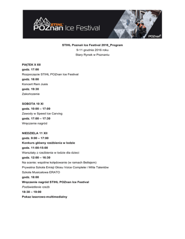 STIHL Poznań Ice Festival 2016_Program 9-11 grudnia 2016 roku Stary Rynek w Poznaniu PIĄTEK 9 XII godz. 17:00 Rozpoczęcie STIHL POZnan Ice Festival godz. 18:00 Koncert Reni Jusis godz. 19:30 Zakończenie SOBOTA 10 XI godz. 10:00 – 17:00 Zawody w Speed Ice Carving godz. 17:00 – 17:30 Wręczenie nagród NIEDZIELA 11 XII godz. 9:00 – 17:00 Konkurs główny rzeźbienia w lodzie godz. 11:00-15:00 Warsztaty z rzeźbienia w lodzie dla dzieci godz. 12:00 – 16:30 Na scenie: wspólne kolędowanie (w ramach Betlejem) Prywatna Szkoła Emisji Głosu Voice Complete i Willa Talentów Szkoła Musicalowa ERATO godz. 18:00 Wręczenie nagród STIHL POZnan Ice Festival Podświetlenie rzeźb 18:30 – 19:00 Pokaz laserowo-multimedialny