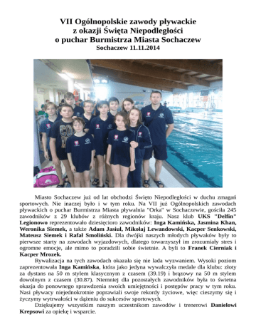VII Ogólnopolskie zawody pływackie z okazji Święta Niepodległości o puchar Burmistrza Miasta Sochaczew Sochaczew 11.11.2014 Miasto Sochaczew już od lat obchodzi Święto Niepodległości w duchu zmagań sportowych. Nie inaczej było i w tym roku. Na VII już Ogólnopolskich zawodach pływackich o puchar Burmistrza Miasta pływalnia "Orka" w Sochaczewie, gościła 245 zawodników z 29 klubów z różnych regionów kraju. Nasz klub UKS "Delfin" Legionowo reprezentowało dziesięcioro zawodników: Inga Kamińska, Jasmina Khan, Weronika Siemek, a także Adam Jasiul, Mikołaj Lewandowski, Kacper Senkowski, Mateusz Siemek i Rafał Smoliński. Dla dwójki naszych młodych pływaków były to pierwsze starty na zawodach wyjazdowych, dlatego towarzyszył im zrozumiały stres i ogromne emocje, ale mimo to poradzili sobie świetnie. A byli to Franek Cierniak i Kacper Mrozek. Rywalizacja na tych zawodach okazała się nie lada wyzwaniem. Wysoki poziom zaprezentowała Inga Kamińska, która jako jedyna wywalczyła medale dla klubu: złoty za dystans na 50 m stylem klasycznym z czasem (39.19) i brązowy na 50 m stylem dowolnym z czasem (30.87). Niemniej dla pozostałych zawodników była to świetna okazja do ponownego sprawdzenia swoich umiejętności i postępów pracy w tym roku. Nasi pływacy niejednokrotnie poprawiali swoje rekordy życiowe, więc cieszymy się i życzymy wytrwałości w dążeniu do sukcesów sportowych. Dziękujemy wszystkim naszym uczestnikom zawodów i trenerowi Danielowi Krepsowi za opiekę i wsparcie.