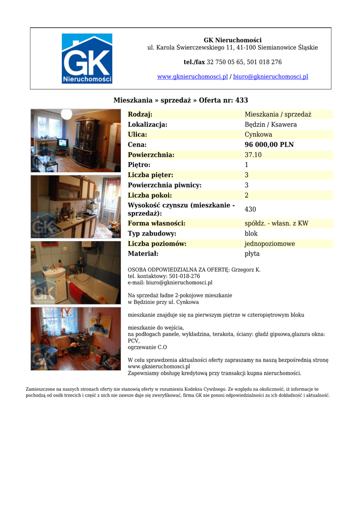 GK Nieruchomości ul. Karola Świerczewskiego 11, 41-100 Siemianowice Śląskie tel./fax 32 750 05 65, 501 018 276 www.gknieruchomosci.pl / [email protected] Mieszkania » sprzedaż » Oferta nr: 433 Rodzaj: Mieszkania / sprzedaż Lokalizacja: Będzin / Ksawera Ulica: Cynkowa Cena: 96 000,00 PLN Powierzchnia: 37.10 Piętro: 1 Liczba pięter: 3 Powierzchnia piwnicy: 3 Liczba pokoi: 2 Wysokość czynszu (mieszkanie sprzedaż): 430 Forma własności: spółdz. - własn. z KW Typ zabudowy: blok Liczba poziomów: jednopoziomowe Materiał: płyta OSOBA ODPOWIEDZIALNA ZA OFERTĘ: Grzegorz K. tel. kontaktowy: 501-018-276 e-mail: [email protected] Na sprzedaż ładne 2-pokojowe mieszkanie w Będzinie przy ul. Cynkowa mieszkanie znajduje się na pierwszym piętrze w czteropiętrowym bloku mieszkanie do wejścia, na podłogach panele, wykładzina, terakota, ściany: gładź gipsowa,glazura okna: PCV, ogrzewanie C.O W celu sprawdzenia aktualności oferty zapraszamy na naszą bezpośrednią stronę www.gknieruchomosci.pl Zapewniamy obsługę kredytową przy transakcji kupna nieruchomości. Zamieszczone na naszych stronach oferty nie stanowią oferty w rozumieniu Kodeksu Cywilnego. Ze względu na okoliczność, iż informacje te pochodzą od osób trzecich i część z nich nie zawsze daje się zweryfikować, firma GK nie ponosi odpowiedzialności za ich dokładność i aktualność.