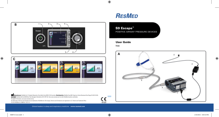 B 1 2 3 4 S9 Escape™ POSITIVE AIRWAY PRESSURE DEVICES User Guide Polski 5 6 A 3 C 2 5 4 1 Manufacturer: ResMed Ltd 1 Elizabeth Macarthur Drive Bella Vista NSW 2153 Australia. Distributed by: ResMed Corp 9001 Spectrum Center Boulevard San Diego CA 92123 USA. ResMed (UK) Ltd 96 Milton Park Abingdon Oxfordshire OX14 4RY UK. See www.resmed.com for other ResMed locations worldwide. For patent information, see www.resmed.com/ip. S9, S9 Escape, SlimLine and ClimateLine are trademarks of ResMed Ltd. S9, Escape, SlimLine and ClimateLine are registered in U.S. Patient and Trademark Office. © 2012 ResMed Ltd. 368874/1 2012-10 Global leaders in sleep and respiratory medicine 368874 Cover.indd 1 www.resmed.com 2/10/2012 3:03:52 PM 368874.book Page 101 Wednesday, October 3, 2012 8:37 AM Polski Wskazania dla stosowania urządzenia S9 Escape System CPAP S9 Escape jest przeznaczony do leczenia obturacyjnego bezdechu sennego (OBS) u pacjentów ważących ponad 30 kg. System CPAP S9 Escape jest przeznaczony do użytku domowego i szpitalnego. Przeciwwskazania Dodatnie ciśnienie w drogach oddechowych może być przeciwwskazane dla niektórych pacjentów cierpiących na następujące schorzenia: • ciężka pęcherzowa choroba płuc • odma opłucnowa • patologicznie niskie ciśnienie krwi • odwodnienie • wyciek płynu mózgowo-rdzeniowego, niedawny zabieg chirurgiczny czaszki lub uraz. Działania niepożądane Pacjenci powinni zgłaszać lekarzowi prowadzącemu nietypowe bóle w klatce piersiowej, silne bóle głowy lub nasilenie duszności. Ostra infekcja górnych dróg oddechowych może wymagać tymczasowego przerwania terapii. Podczas terapii z zastosowaniem urządzenia mogą wystąpić następujące skutki uboczne: • suchość w nosie, ustach lub gardle • krwawienie z nosa • wzdęcia • dyskomfort uszu lub zatok • podrażnienie oczu • wysypka na skórze. Maski i nawilżacze Informacje o zalecanych maskach i nawilżaczach dostępne są w witrynie internetowej www.resmed.com na stronie Products (Produkty) pod nagłówkiem Service & Support (Obsługa i serwis). Informacje dotyczące korzystania z maski i nawilżacza zamieszczone są w podręczniku dostarczonym z maską lub nawilżaczem. Konfiguracja Patrz ilustracja A. 1. Do gniazdka zasilania na tylnym panelu urządzenia S9 włożyć wtyczkę prądu stałego. 2. Podłączyć przewód zasilający do zasilacza. 101 Polski 368874.book Page 102 Wednesday, October 3, 2012 8:37 AM 3. Podłączyć drugi koniec przewodu zasilającego do gniazdka zasilania. 4. Jeden koniec rury przewodzącej powietrze zamocować mocno do wylotu powietrza. 5. Podłączyć maskę z osprzętem do wolnego końca rury przewodzącej powietrze. Panel kontrolny Patrz ilustracja B. Na panelu kontrolnym urządzenia S9 znajdują się następujące elementy: 1. 2. 3. 4. 5. 6. Przycisk Start/Stop: Rozpoczyna lub przerywa leczenie. Menu główne Ekran LCD Menu informacyjne*: Umożliwia przegląd danych statystycznych snu pacjenta. Menu konfiguracji*: Umożliwia pacjentowi zmianę ustawień. Pokrętło przyciskowe: Obracanie pokrętłem umożliwia pacjentowi przewijanie przez składniki menu i zmianę ustawień. Naciśnięcie pokrętła pozwala na wejście do menu i potwierdzenie wybranych ustawień. *Jeśli klinicysta aktywował funkcję S9 Essentials, menu Informacja i Konfiguracja będą nieczynne. Nawigowanie w menu Patrz ilustracja C. Mówiąc ogólnie, w celu nawigowania po menu: 1. 2. 3. 4. Obrócić aż do podświetlenia żądanego parametru na niebiesko. Nacisnąć . Wybór zostanie podświetlony w kolorze pomarańczowym. Obrócić aż do podświetlenia żądanego ustawienia. Celem potwierdzenia wyboru nacisnąć . Powraca niebieski kolor ekranu. Rozpoczęcie pracy 1. 2. 3. 4. 5. Upewnić się, że podłączono zasilanie. W razie potrzeby dostosować czas stopniowego narastania. Założyć maskę w sposób opisany w instrukcji użytkowania maski. W celu rozpoczęcia terapii, po prostu nacisnąć . Należy położyć się i ułożyć rurę przewodzącą powietrze w taki sposób, aby mogła się swobodnie przemieszczać przy zmianie pozycji w czasie snu. 6. W celu zakończenia terapii nacisnąć . 102 Polski 368874.book Page 103 Wednesday, October 3, 2012 8:37 AM Czyszczenie i konserwacja Codziennie: Wyjąć rurę przewodzącą powietrze, pociągając za uchwyty palcowe na mankiecie. Powiesić w czystym, suchym miejscu do czasu ponownego użycia. Uwagi: • Nie wolno wieszać rury przewodzącej powietrze w miejscu, gdzie będzie ona narażona na bezpośrednie działanie promieni słonecznych, ponieważ rura może z czasem ulec zesztywnieniu, a w końcu popękać. • Rury przewodzącej powietrze nie wolno prać w pralce ani myć w zmywarce. Co tydzień: 1. Odłączyć rurę przewodzącą powietrze od urządzenia S9 oraz od maski. 2. Rurę przewodzącą powietrze umyć w ciepłej wodzie, stosując łagodny detergent. 3. Dokładnie wypłukać, powiesić i pozostawić do wyschnięcia. 4. Przed następnym użyciem rurę przewodzącą powietrze podłączyć ponownie do wylotu powietrza i maski. Co miesiąc: 1. Powierzchnię urządzenia S9 przetrzeć wilgotną ściereczką zamoczoną w roztworze łagodnego detergentu. 2. Sprawdzić, czy filtr powietrza nie jest zablokowany kurzem lub zanieczyszczeniami i nie ma dziur. W razie potrzeby, wymienić filtr powietrza. Wymiana filtra powietrza: Filtr powietrza należy wymieniać co sześć miesięcy (lub w razie potrzeby częściej). 1. Zdjąć osłonę filtra powietrza z tyłu urządzenia S9. 2. Usunąć i wyrzucić zużyty filtr powietrza. 3. Włożyć nowy filtr powietrza ResMed, upewniając się że jest on ułożony płasko w osłonie filtru powietrza. 4. Ponownie założyć osłonę filtra powietrza. Uwagi: • Należy dopilnować, aby filtr powietrza i jego osłona były zawsze założone. • Filtru powietrza nie należy myć. Filtr powietrza nie nadaje się do mycia ani ponownego użycia. Wykrywanie i usuwanie usterek W 