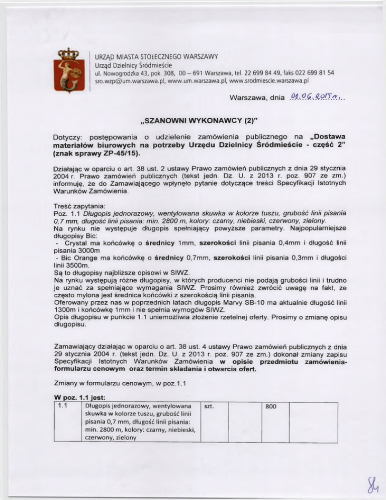 URZĄD MIASTA STOŁECZNEGO WARSZAWY Urząd Dzielnicy Śródmieście ul. Nowogrodzka 43, pok. 308, 00 - 691 Warszawa, tel. 22 699 84 49, faks 022 699 81 54 sro.wzp@ um.warszawa.pl, w w w .um .w arszaw a.pl,www.srodmiescie.warszawa.pl W arszawa, dnia 04.0.6. £ o /T /r* „SZANOW NI W Y K O N A W C Y (2)” Dotyczy: postępowania o udzielenie zam ówienia publicznego na „Dostawa m ateriałów biurowych na potrzeby Urzędu Dzielnicy Śródm ieście - część 2” (znak spraw y ZP-45/15). Działając w oparciu o art. 38 ust. 2 ustawy Prawo zamówień publicznych z dnia 29 stycznia 2004 r. Prawo zamówień publicznych (tekst jedn. Dz. U. z 2013 r. poz. 907 ze zm.) informuję, że do Zamawiającego wpłynęło pytanie dotyczące treści Specyfikacji Istotnych Warunków Zamówienia. Treść zapytania: Poz. 1.1 Długopis jednorazowy, wentylowana skuwka w kolorze tuszu, grubość linii pisania 0,7 mm, długość linii pisania: min. 2800 m, kolory: czarny, niebieski, czerwony, zielony. Na rynku nie występuje długopis spełniający powyższe parametry. Najpopularniejsze długopisy Bic: - Crystal ma końcówkę o średnicy 1mm, szerokości linii pisania 0,4mm i długość linii pisania 3000m - Bic Orange ma końcówkę o średnicy 0,7mm, szerokości linii pisania 0,3mm i długości linii 3500m. Są to długopisy najbliższe opisowi w SIWZ. Na rynku występują różne długopisy, w których producenci nie podają grubości linii i trudno je uznać za spełniające wymagania SIWZ. Prosimy również zwrócić uwagę na fakt, że często mylona jest średnica końcówki z szerokością linii pisania. Oferowany przez nas w poprzednich latach długopis Marvy SB-10 ma aktualnie długość linii 1300m i końcówkę 1mm i nie spełnia wymogów SIWZ. Opis długopisu w punkcie 1.1 uniemożliwia złożenie rzetelnej oferty. Prosimy o zmianę opisu długopisu. Zamawiający działając w oparciu o art. 38 ust. 4 ustawy Prawo zamówień publicznych z dnia 29 stycznia 2004 r. (tekst jedn. Dz. U. z 2013 r. poz. 907 ze zm.) dokonał zmiany zapisu Specyfikacji Istotnych Warunków Zamówienia w opisie przedmiotu zamówieniaformularzu cenowym oraz termin składania i otwarcia ofert. Zmiany w formularzu cenowym, w poz. 1.1 W poz. 1 .1 jest: 1.1 Długopis jednorazowy, wentylowana skuwka w kolorze tuszu, grubość linii pisania 0,7 mm, długość linii pisania: min. 2800 m, kolory: czarny, niebieski, czerwony, zielony szt. 800 VIa być: 1.1 Długopis jednorazowy, w entylowana szt. 800 skuwka w kolorze tuszu, średnica końcówki 0,7 mm, długość linii pisania: min. 2800 m, kolory: czarny, _________ niebieski, c zerw o n y, zielony_______________ W załączeniu poprawiony i obowiązujący formularz cenowy. Część X. Miejsce oraz termin składania i otwarcia ofert otrzymuje brzmienie: 1. Ofertę należy złożyć w siedzibie zamawiającego w Warszawie, ul. Nowogrodzka 43, w Kancelarii Ogólnej, nie później niż w dniu 09.06.2015r. do godz. 10:00 2. Zamawiający otworzy koperty z ofertami w dniu 09.06.2015r. o godz. 10:30 w Sali Rady przy ul. Nowogrodzkiej 43 w Warszawie. Część IX. Opis sposobu przygotowywania ofert, pkt 1 b) i 10 otrzymują brzmienie: 1b) Próbki. Wykonawca wraz z ofertą złoży próbki wszystkich artykułów wymienionych w Formularzu cenowym (załącznik do umowy). Każda próbka artykułu musi być oznaczona, zgodnie z numerem pozycji opisanym w Formularzu cenowym. Wykonawca złoży po jednej próbce dla każdego artykułu. Próbki należy umieścić w zamkniętym opakowaniu. Opakowanie musi być opisane: „Próbki do postępowania: Dostawa materiałów biurowych na potrzeby Urzędu Dzielnicy Śródmieście - część 2” (znak sprawy ZP-45/15), nie otwierać przed godziną 10:30 dnia 09.06.2015r.” oraz mieć oznaczenie (nazwę i adres) Wykonawcy. Załączone próbki będą podstawą do oceny w kryterium parametry techniczno-użytkowe. 10. Wykonawca powinien umieścić ofertę w kopercie lub nieprzezroczystym opakowaniu zamkniętym w sposób trwały, które będzie zaadresowane do Zamawiającego oraz będzie posiadać następujące oznaczenie: oferta na - „Dostawa materiałów biurowych na potrzeby Urzędu Dzielnicy Śródmieście - część 2” (znak sprawy ZP-45/15), nie otwierać przed godziną 10:30 dnia 09.06.2015r. g łó w n y s p e c j a l is t a Wydzi: NACZELNIK Pub Marek Chabiera