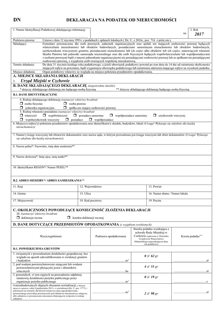 DEKLARACJA NA PODATEK OD NIERUCHOMOŚCI DN 1. Numer Identyfikacji Podatkowej składającego informację 2. Rok na 2017 .................................................................................................... Podstawa prawna: Ustawa z dnia 12 stycznia 1991r. o podatkach i opłatach lokalnych ( Dz. U. z 2016r., poz. 716 z późn.zm.). Składający: Formularz przeznaczony dla osób prawnych, jednostek organizacyjnych oraz spółek nie mających osobowości prawnej będących właścicielami nieruchomości lub obiektów budowlanych, posiadaczami samoistnymi nieruchomości lub obiektów budowlanych, użytkownikami wieczystymi gruntów, posiadaczami nieruchomości lub ich części albo obiektów lub ich części, stanowiących własność Skarbu Państwa lub jednostki samorządu terytorialnego oraz dla osób fizycznych będących współwłaścicielami lub współposiadaczami z osobami prawnymi bądź z innymi jednostkami organizacyjnymi nie posiadającymi osobowości prawnej lub ze spółkami nie posiadającymi osobowości prawnej, z wyjątkiem osób tworzących wspólnotę mieszkaniową. Termin składania: Do dnia 31 stycznia każdego roku podatkowego, a jeżeli obowiązek podatkowy powstał po tym dniu do 14 dni od zaistnienia okoliczności mających wpływ na powstanie, bądź wygaśnięcie obowiązku podatkowego lub zaistnienia zdarzenia mającego wpływ na wysokość podatku. Miejsce składania: Organ podatkowy właściwy ze względu na miejsce położenia przedmiotów opodatkowania. A. MIEJSCE SKŁADANIA DEKLARACJI 3. Urząd Miejski w Czchowie B. DANE SKŁADAJĄCEGO DEKLARACJĘ (niepotrzebne skreślić) * dotyczy składającego deklarację nie będącego osobą fizyczną ** dotyczy składającego deklarację będącego osobą fizyczną B.1. DANE IDENTYFIKACYJNE 4. Rodzaj składającego deklarację (zaznaczyć właściwy kwadrat) osoba fizyczna osoba prawna jednostka organizacyjna spółka nie mająca osobowości prawnej 5. Rodzaj własności posiadania (zaznaczyć właściwy kwadrat) właściciel współwłaściciel posiadacz samoistny współposiadacz samoistny użytkownik wieczysty współużytkownik wieczysty posiadacz współposiadacz 6. Miejsce/a (adres/y) położenia przedmiotów opodatkowania oraz identyfikator/y działek, budynków, lokali (Uwaga! Wykazuje się odrębnie dla każdej nieruchomości) 7. Numer/y księgi wieczystej lub zbioru/ów dokumentów oraz nazwa sądu, w którym prowadzona jest księga wieczysta lub zbiór dokumentów (Uwaga! Wykazuje się odrębnie dla każdej nieruchomości) 8. Nazwa pełna*/ Nazwisko, imię data urodzenia** 9. Nazwa skrócona*/ Imię ojca, imię matki** 10. Identyfikator REGON*/ Numer PESEL** B.2. ADRES SIEDZIBY*/ ADRES ZAMIESZKANIA** 11. Kraj 12. Województwo 13. Powiat 14. Gmina 15. Ulica 16. Numer domu / Numer lokalu 17. Miejscowość 18. Kod pocztowy 19. Poczta C. OKOLICZNOŚCI POWODUJĄCE KONIECZNOŚĆ ZŁOŻENIA DEKLARACJI 20. (zaznaczyć właściwy kwadrat) deklaracja roczna korekta deklaracji rocznej D. DANE DOTYCZĄCE PRZEDMIOTÓW OPODATKOWANIA (z wyjątkiem zwolnionych) Wyszczególnienie Podstawa opodatkowania Stawka podatku wynikająca z uchwały Rady Miejskiej w Czchowie (ogłoszona w Dzienniku Urzędowym Województwa Małopolskiego poprzedzającym dany rok podatkowy) Kwota podatku*** D.1. POWIERZCHNIA GRUNTÓW 1. związanych z prowadzeniem działalności gospodarczej, bez względu na sposób zakwalifikowania w ewidencji gruntów i budynków 2. pod wodami powierzchniowymi stojącymi lub wodami powierzchniowymi płynącymi jezior i zbiorników sztucznych 3. pozostałych, w tym zajętych na prowadzenie odpłatnej statutowej działalności pożytku publicznego przez organizacje pożytku publicznego 4.niezabudowanych objętych obszarem rewitalizacji, o którym mowa w ustawie z dnia 9 października 2015 r. o rewitalizacji (Dz. U. poz. 1777), i położonych na terenach, dla których miejscowy plan zagospodarowania przestrzennego przewiduje przeznaczenie pod zabudowę mieszkaniową, usługową albo zabudowę o przeznaczeniu mieszanym obejmującym wyłącznie te rodzaje zabudowy 0 zł 62 gr ............................................zł ............................................m2 4 zł 51 gr ............................................zł ............................................ha 0 zł 19 gr ............................................m2 ............................................m2 ............................................z 2 zł 98 gr ............................................zł D.2. POWIERZCHNIA UŻYTKOWA BUDYNKÓW LUB ICH CZĘŚCI1 1. mieszkalnych – ogółem ............................................m2 w tym: - o wysokości powyżej 2,20m 0 zł 45 gr ............................................zł ............................................m2 0 zł 23 gr - o wysokości od 1,40m do 2,20m ............................................zł ............................................m2 2. związanych z prowadzeniem działalności gospodarczej oraz części budynków mieszkalnych zajętych na prowadzenie działalności gospodarczej 3. związanych z prowadzeniem działalności gospodarczej w zakresie obrotu kwalifikowanym materiałem siewnym 4. związanych z udzielaniem świadczeń zdrowotnych, w rozumieniu przepisów o działalności leczniczej, zajętych przez podmioty udzielające tych świadczeń 5. pozostałe w tym: - budynki rekreacji indywidualnej 14 zł 60 gr ............................................zł ............................................m2 7 zł 20 gr ............................................zł ............................................m2 4 zł 61 gr ............................................zł ............................................m2 7 zł 62 gr ............................................zł ............................................m2 4 zł 00 gr - inne ............................................zł ............................................m2 D.3. BUDOWLE2 (warto