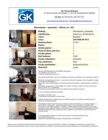 GK Nieruchomości ul. Karola Świerczewskiego 11, 41-100 Siemianowice Śląskie tel./fax 32 750 05 65, 501 018 276 www.gknieruchomosci.pl / [email protected] Mieszkania » sprzedaż » Oferta nr: 581 Rodzaj: Mieszkania / sprzedaż Lokalizacja: Katowice / Śródmieście Ulica: Bratków Cena: 260 000,00 PLN Powierzchnia: 47.00 Piętro: 2 Liczba pięter: 2 Powierzchnia piwnicy: 4 Liczba pokoi: 3 Rok budowy: 1960 Forma własności: własność Typ zabudowy: blok Liczba poziomów: jednopoziomowe Materiał: cegła OSOBA ODPOWIEDZIALNA ZA OFERTĘ: Grzegorz K. tel. kontaktowy: 501-018-276 e-mail: [email protected] Na sprzedaż komfortowe, słoneczne 3 pokojowe mieszkanie, znajdujące się w śródmieściu Katowic. Mieszkanie po kapitalnym remoncie - zastosowano materiały o podwyższonym standardzie, nadaje się od razu do zamieszkania. lokal mieści się na drugim piętrze w niskim (2 piętrowym) budynku z cegły oddanym do użytku ok 1960r Mieszkanie o powierzchni 47,6m2 składa się z salonu z kuchnią w aneksie, dwóch niezależnych pokoi, łazienki z WC i przedpokoju. do lokalu przynależy balkon i piwnica.Do dyspozycji mieszkańców suszarnia w cenie mieszkania zabudowa kuchenna. ogrzewanie centralne z sieci, w mieszkaniu zainstalowano również alarm. Budynek położony przy spokojnej ulicy, na ogrodzonej działce, z możliwością parkowania na prywatnej, zamykanej posesji. Niewątpliwym atutem nieruchomości jest bardzo atrakcyjna lokalizacja – w centrum Katowic, a jednocześnie w kameralnej - reprezentacyjnej dzielnicy, tuż przy Katedrze. W okolicy Park Kościuszki, liczne punkty handlowo - usługowe, świetne połączenia komunikacyjne zarówno dla zmotoryzowanych (dogodny dojazd do autostrady A4), jak i korzystających z komunikacji miejskiej. Mieszkanie idealne dla osób szukających ciszy i spokoju, a równocześnie chcących pozostać w centrum miasta. W celu sprawdzenia aktualności oferty zapraszamy na naszą bezpośrednią stronę www.gknieruchomosci.pl Zapewniamy obsługę kredytową przy transakcji kupna nieruchomości. Zamieszczone na naszych stronach oferty nie stanowią oferty w rozumieniu Kodeksu Cywilnego. Ze względu na okoliczność, iż informacje te pochodzą od osób trzecich i część z nich nie zawsze daje się zweryfikować, firma GK nie ponosi odpowiedzialności za ich dokładność i aktualność.