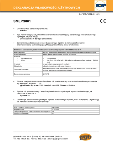 DEKLARACJA WŁAŚCIWOŚCI UŻYTKOWYCH DoP SMLPS001 str. 1 / 5 SMLPS001 Unikatowy kod identyfikacji produktu: SMLPS Typ, numer seryjny lub jakikolwiek inny element umożliwiający identyfikację cech produktu wg wymagań Artykułu 11(4): Zobacz aneks 1 do tego dokumentu Zamierzone zastosowanie wyrobu budowlanego zgodnie z mającą zastosowanie zharmonizowaną techniczną specyfikacją przewidzianą przez producenta: Zamierzone zastosowanie/zastosowania wyrobu budowlanego zgodnie z ETAG 020 części: 1 - 4 Rodzaj wyrobu: Materiał bazowy Materiał: Koszulka wkręta Wkręt Trwałość Obciążenie Łącznik tworzywowy do montażu wielopunktowych zamocowań nienośnych. Beton, pełne i perforowane podłoże murowane - Poliamid PA6 Stal (fy,k ≥ 450 MPa, fu,k ≥ 580 MPa) ocynkowana ≥ 5µm zgodnie z EN ISO 4042 w warunkach wewnętrznych, suchych obciążenia statyczne lub quasi-statyczne Odporność ogniowa: R90 (jeśli dopuszczalne obciążenie [FRK / (M.F)] wynosi ≤ 0,8 kN – przy braku stałego obciążenia wyciągającego osiowo. Zakres temperaturowy 24/40°C Nazwa, zarejestrowana nazwa handlowa lub znak towarowy oraz adres kontaktowy producenta wg wymagań Artykułu 11 (5): pgb-Polska sp. z o.o. – Ul. Jondy 5 – 44-100 Gliwice – Polska System lub systemy oceny i weryfikacji właściwości użytkowych wyrobu budowlanego jak określone w aneksie V: System 2+ Deklaracja właściwości użytkowych wyrobu budowlanego wydana przez Europejską Organizację ds. Aprobat Technicznych jak poniżej: ETA - 10/0392 wydana przez: Na podstawie: Certyfikat Zgodności 1488-CPD-0230Z wydany przez: Zgodnie z systemem: ITB Polska ETAG 020 ITB 2+ -------------------------------------------------------------------------------------------------------------------------------------pgb –Polska sp. z o.o. | Jondy 5 | 44-100 Gliwice | Polska Tel. +32 330 26 10 | Fax +32 330 26 20 | [email protected] DEKLARACJA WŁAŚCIWOŚCI UŻYTKOWYCH DoP SMLPS001 str. 2 / 5 Deklarowane właściwości – Istotne parametry – Właściwości Parametry instalacyjne 1 d0 hnom ds lg ls Nominalna średnica otworu wierconego Nominalna długość koszulki Średnica wkręta Długość gwintu wkręta Długość wkręta [mm] [mm] [mm] [mm] [mm] Ø8 Ø 10 Ø 12 Ø 14 8 10 12 14 60 6 60 65-120 70 8 70 75-160 60 8 60 65-160 70 40 70 75-200 Deklarowane właściwości w odniesieniu do ETAG 020 części: 1 - 4 Ø8 Ø 10 Ø 12 Ø 14 7,25 13,74 13,74 22,97 1,54 1,54 1,54 1,54 3,28 1,28 6,98 1,28 6,98 1,28 13,16 1,28 11,35 1,28 28,69 1,28 28,69 1,28 57,59 1,28 [mm] 100 100 100 100 [mm] 120 120 100 140 100 140 100 140 [mm] 60 140 60 85 60 85 60 85 [mm] 100 140 100 140 100 140 100 140 [kN] 0,6 0,9 0,9 1,5 0,9 1,5 0,9 1,5 1,8 0,35 0,32 1,8 0,59 0,37 1,8 0,59 0,71 1,8 0,59 0,69 0,50 0,66 0,80 0,70 0,51 0,23 0,85 0,45 0,85 0,38 0,85 0,46 0,34 0,67 0,57 0,69 Wkręt NRk,s Ms VRk,s Ms MRk,s Ms Wytrzymałość charakterystyczna na wyrywanie Częściowy współczynnik bezpieczeństwa wytrzymałości charakterystycznej na wyrywanie Wytrzymałość charakterystyczna na ścinanie Częściowy współczynnik bezpieczeństwa wytrzymałości charakterystycznej na ścinanie Wytrzymałość charakterystyczna na zginanie Częściowy współczynnik bezpieczeństwa wytrzymałości charakterystycznej na zginanie [kN] [-] [kN] [-] [Nm] [-] Beton hmin smin cmin ccr,N NRk,p,cr Mc F N0,cr N∞,cr F V0 V∞ 1 Minimalna grubość elementu betonowego Minimalny rozstaw łączników Beton ≥ C16/20 Beton C12/15 Minimalna odległość łącznika od krawędzi Beton ≥ C16/20 Beton C12/15 Odległość krytyczna łącznika od krawędzi Beton ≥ C16/20 Beton C12/15 Wytrzymałość charakterystyczna na wyrywanie w spękanym betonie: C12/15 C16/20 Częściowy współczynnik bezpieczeństwa Rozciąganie pod wpływem sił wyrywających Krótkoterminowe przemieszczenie pod wpływem sił wyrywających: Długoterminowe przemieszczenie pod wpływem sił wyrywających: Rozciąganie pod wpływem sił ścinających Krótkoterminowe przemieszczenie pod wpływem sił ścinających: Długoterminowe przemieszczenie pod wpływem sił ścinających [-] [kN] [mm] [mm] [kN] [mm] [mm] Wkręt i koszulka są nierozłącznymi elementami i powinny być pakowane i dystrybuowane jako całość. -------------------------------------------------------------------------------------------------------------------------------------pgb –Polska sp. z o.o. | Jondy 5 | 44-100 Gliwice | Polska Tel. +32 330 26 10 | Fax +32 330 26 20 | [email protected] DEKLARACJA WŁAŚCIWOŚCI UŻYTKOWYCH DoP SMLPS001 str. 3 / 5 Deklarowane właściwości w odniesieniu do ETAG 020 części: 1 - 4 Ø8 Ø 10 Ø 12 Ø 14 120 250 120 - 120 - Mur wykonany z cegły (proszę użyć kategorii “b” i “c”) hmin smin cmin Smin1 Smin2 FRk Mc F N0,cr N∞,cr F V0 Minimalna grubość cegły: Cegła pełna HD 250x120x65 EN771-12 Cegła perforowana pionowo Porotherm 25 P+W, EN 771-13 Minimalny rozstaw łączników w wypadku montażu pojedynczych kotew: Minimalna odległość łącznika od krawędzi w wypadku montażu pojedynczych kotew: Minimalny rozstaw łączników dla grupy kotew4 Obciążenia montowane prostopadle do krawędzi Obciążenia montowane równolegle do krawędzi Wytrzymałość charakterystyczna na wyrywanie w podłożu murowanym: Cegła pełna HD 250x120x65 EN771-1 Cegła perforowana pionowo Porotherm 25 P+W, EN 771-1 Częściowy współczynnik bezpieczeństwa Przemieszczenie pod wpływem sił wyrywających: Cegła pełna HD 250x120x65 EN771-1 Cegła perforowana pionowo Porotherm 25 P+W, EN 771-1 Krótkoterminowe przemieszczenie pod wpływem sił wyrywających: Cegła pełna HD 250x120x65 EN771-1 Cegła perforowana pionowo Porotherm 25 P+W, EN 771-1 Długoterminowe przemieszczenie pod wpływem sił wyrywających: Cegła pełna HD 250x120x65 EN771-1 Cegła perforowana pionowo Porotherm 25 P+W, EN 771-1 [mm] 120 250 [mm] 250 250 250 250 [mm] 100 100 100 100 [mm] 200 200 200 200 400 400 400 400 0,6 1,5 3,5 3,5 0,5 