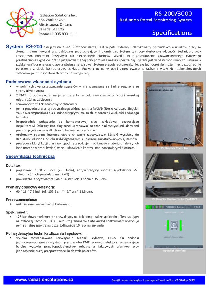 System RS-200 ! " # ! $ % % % ' %' * + !" ! % , !" ( % ! Podstawowe własno ci systemu • % - % & % & • ' # # • • . / % 2 • % 0 1"23 0 1 " % 3 # % # * + • , , % * * ! " ) .4 % % • % ! Specyfikacja techniczna Detektor: • #)5 .677 88 • 6 ( 5 9/ : .9 Wymiary obudowy detektora: • <7 : ./ : =( ! .6 (6 Przedwzmacniacz: • & !. : 96(= : ;6(6 : ./(; ! ! ! Spektrometr: • . / ' ' 2 > ?1 > ' % # ? .7 Koincydencyjna technika zliczania impulsów: • # ' @ # & # ! 1 '! > ?1 % ! ( % & # & ) # VPM (Vehicle Presence Module) - wykrywanie obecno ci pojazdów: • > ?1 ' # 677 A ! B & # ( # % ' # ! Zintegrowany kontroler i opcjonalny moduł DataCenter: • • • • • • OBUDOWA KONTROLERA5 CPU: PAMI WEWN TRZNA: INTERFEJS U YTKOWNIKA: SYSTEM OPERACYJNY: $ & POŁ CZENIA ZEWN TRZNE: ,"* % ( .688 & @ % ' / ?C ') % ' DE - @ % $ ) (B "C(2? 1 % ! Komponenty systemu: ! # .677 6 & ' . . . . ! ! ! & #) & 9 ! & % # 67 ' 5 %! Opcje wyposa enia i usług: • • • • • • • • • • DODATKOWE DETEKTORY: .677 6 STANDARDOWA OBUDOWA DETEKTORA: EKRAN DOTYKOWY: .6882? 1 & DRUKARKA: % +" CZUJNIKI OPTYCZNE: UPS: % KABEL: INSTALACJA I URUCHOMIENIE: #) !$ % * + CZ CI ZAMIENNE: '# 2 SZKOLENIE: % % ' & # & # ' ,"* @ ( % , % & % ( "* 5 " , , ! Urz dzenia, które powinien zapewni klient: . . . . . ! ! B " & # (# ,"* % 4 & % ! Podł czenia które powinien zapewni klient: • • INTERNET: B % 5 % ZASILANIE: ;7 2467 A * & * ! # & ,"* @ * + , % '