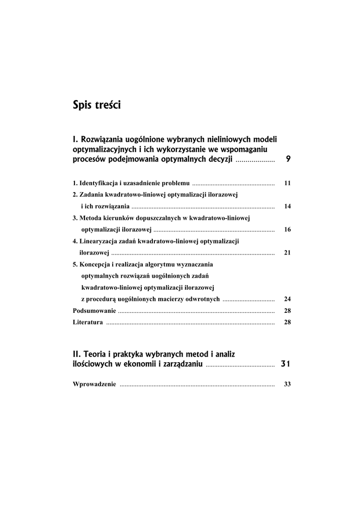 Spis treści I. Rozwiązania uogólnione wybranych nieliniowych modeli optymalizacyjnych i ich wykorzystanie we wspomaganiu procesów podejmowania optymalnych decyzji .................... 9 1. Identyfikacja i uzasadnienie problemu ................................................. 11 2. Zadania kwadratowo-liniowej optymalizacji ilorazowej i ich rozwiązania ..................................................................................... 14 3. Metoda kierunków dopuszczalnych w kwadratowo-liniowej optymalizacji ilorazowej ........................................................................ 16 4. Linearyzacja zadań kwadratowo-liniowej optymalizacji ilorazowej ................................................................................................. 21 5. Koncepcja i realizacja algorytmu wyznaczania optymalnych rozwiązań uogólnionych zadań kwadratowo-liniowej optymalizacji ilorazowej z procedurą uogólnionych macierzy odwrotnych ............................... 24 Podsumowanie ............................................................................................. 28 Literatura .................................................................................................... 28 II. Teoria i praktyka wybranych metod i analiz ilościowych w ekonomii i zarządzaniu ......................................... 31 Wprowadzenie ............................................................................................ 33 1. Niezdeterminowane modele oceny projektów inwestycyjnych – zarządzanie ryzykiem ............................................. 35 Wstęp ....................................................................................................................... 35 1.1. Niezdeterminowane modele oceny efektywności ekonomicznej projektów inwestycyjnych ................................................................................................. 37 Podsumowanie ......................................................................................................... 44 Literatura .................................................................................................................. 44 2. Dzielenie sekretu – kryptograficzne narzędzie procesu zarządzania i kontroli ............................................................. 45 Wprowadzenie ......................................................................................................... 45 2.1. Podstawy teoretyczne ........................................................................................ 46 2.2. Schematy dzielenia sekretu ............................................................................... 49 Podsumowanie ......................................................................................................... 56 Literatura .................................................................................................................. 57 3. Wykorzystanie strategii zabezpieczających w zarządzaniu portfelem inwestycji kapitałowych ......................................................... 58 Wstęp ....................................................................................................................... 58 3.1. Instrumenty pochodne jako narzędzie wspomagające proces decyzyjny .......... 60 3.2. Zastosowanie instrumentów pochodnych i ich rola w zarządzaniu kapitałem inwestycyjnym................................................................................................... 64 3.3. Rynek instrumentów pochodnych w Polsce ...................................................... 66 3.4. Modele wyceny instrumentów pochodnych ...................................................... 67 3.5. Wybrane modyfikacje modelu Blacka-Scholesa ............................................ 76 Podsumowanie ......................................................................................................... 80 Literatura .................................................................................................................. 81 4. Analiza własności modeli regresji opartych na sieciach neuronowych .......................................................................................... 82 Wprowadzenie ......................................................................................................... 82 4.1. Ogólna postać modelu regresji opartego na sieciach neuronowych .................. 82 6 4.2. Badanie odporności modelu na występowanie szumu w zbiorze uczącym ............................................................................................ 85 4.3. Badanie odporności modelu na występowanie wartości oddalonych w zbiorze uczącym .......................................................... 87 Podsumowanie ......................................................................................................... 88 Literatura .................................................................................................................. 88 5. Kodowanie zmiennych objaśniających mierzonych na słabych skalach w metodzie wektorów nośnych ........................... 90 Wprowadzenie ......................................................................................................... 90 5.1. Metoda wektorów nośnych ................................................................................ 91 5.2. Kodowanie nominalnych zmiennych objaśniających ....................................... 95 5.3. Eliminacja zmiennych nieistotnych .................................................................. 97 5.4 Analiza dla zbioru german credit ............................................................. 98 Podsumowanie ......................................................................................................... 102 Literatura .................................................................................................................. 102 6. Analiza taksonomiczna rozwoju gospodarczego Polski i krajów Unii Eur