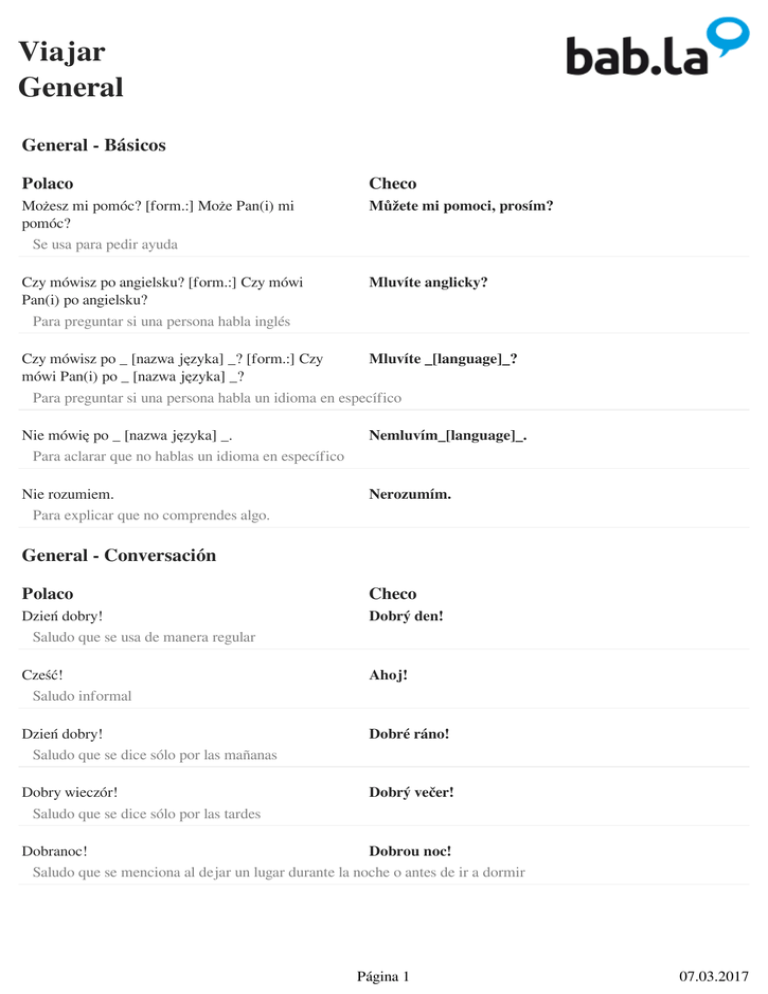 Viajar General General - Básicos Polaco Checo Możesz mi pomóc? [form.:] Może Pan(i) mi pomóc? Se usa para pedir ayuda Můžete mi pomoci, prosím? Czy mówisz po angielsku? [form.:] Czy mówi Pan(i) po angielsku? Para preguntar si una persona habla inglés Mluvíte anglicky? Czy mówisz po _ [nazwa języka] _? [form.:] Czy Mluvíte _[language]_? mówi Pan(i) po _ [nazwa języka] _? Para preguntar si una persona habla un idioma en específico Nie mówię po _ [nazwa języka] _. Para aclarar que no hablas un idioma en específico Nemluvím_[language]_. Nie rozumiem. Para explicar que no comprendes algo. Nerozumím. General - Conversación Polaco Checo Dzień dobry! Saludo que se usa de manera regular Dobrý den! Cześć! Saludo informal Ahoj! Dzień dobry! Saludo que se dice sólo por las mañanas Dobré ráno! Dobry wieczór! Saludo que se dice sólo por las tardes Dobrý večer! Dobranoc! Dobrou noc! Saludo que se menciona al dejar un lugar durante la noche o antes de ir a dormir Página 1 07.03.2017 Viajar General Jak się masz? [form.:] Jak się Pan(i) ma? Jak se máš? Pregunta amable para conocer cómo se encuentra la otra persona Dobrze, dziękuję. Respuesta amable a la pregunta ¿cómo estás? Dobře, díky. Jak się nazywasz? [form.:] Jak się Pan(i) nazywa? Para preguntar el nombre de la persona Jak se jmenuješ? Nazywam się ___. Para decir tu nombre a otra persona. Jmenuji se ___. Skąd pochodzisz? [form.:] Skąd Pan(i) pochodzi? Para preguntar el país de origen de una persona Odkud jsi? Pochodzę z ___. Para responder acerca de tu país de origen Jsem z ___. Ile masz lat? [form.:] Ile ma Pan(i) lat? Para preguntar la edad de una persona Kolik to je let? Mam ___ lat(a). Para decir tu edad. Je mi __ (let). Tak Respuesta positiva Ano Nie Respuesta negativa Ne Proszę Palabra que denota amabilidad Prosím Proszę bardzo! tady prosím! Se usa para expresar el momento en que una persona entrega algo a otra persona Dziękuję. Para agradecer a alguien Děkuji. Página 2 07.03.2017 Viajar General Dziękuję bardzo. Para mostrar profundo agradecimiento. Moc děkuji. Proszę bardzo! / Nie ma za co! Respuesta amable para "Gracias". Není zač. Przepraszam. Para disculparse. Omlouvám se. Przepraszam. Para atraer la atención de otra persona. Promiňte. Nic się nie stało. Para responder al aceptar una disculpa. To je v pořádku. Nie ma sprawy. Para responder al aceptar una disculpa. V pořádku. Uwaga! Para prevenir del peligro a otra persona. Pozor! Jestem głodny/-a. Para expresar la sensación de hambre. Mám hlad. Chce mi się pić. Para expresar cuando estás sediento. Mám žízeň. Jestem zmęczony/-a. Para expresar la sensación de cansancio. Jsem unavený(á). Źle się czuję. Je mi špatně. Para decir que te encuentras enfermo o mal de salud. Nie wiem. Nevím. Para explicar que no sabes la respuesta a una pregunta. Miło było cię poznać. [form.:] Miło było Těšilo mě. Panią/Pana poznać. Se dice cuando nos despedimos de alguien después de vernos por primera vez. Página 3 07.03.2017 Viajar General Do widzenia! Se dice cuando nos despedimos de alguien. Na shledanou! General - Quejas Polaco Checo Chciał(a)bym złożyć skargę. Forma amable de dar a conocer tu queja. Chtěl bych podat stížnost. Kto tu rządzi? Para saber quién es el responsable. Kdo to tu má na starost? To jest absolutnie niedopuszczalne! Para expresar tu descontento. To je naprosto nepřijatelné! Żądam zwrotu pieniędzy! Para pedir la devolución de tu dinero. Chci zpátky moje peníze! Czekamy ponad godzinę. Para quejarte de largas esperas. Čekáme tady už hodinu. General - Quejas ofensivas Polaco Checo To jedzenie smakuje jak gówno! Toto jídlo chutná jako hovno! Forma grosera para mostrar tu desagrado por la comida. Ten napój/drink smakuje jak szczyny! To pití chutná jako chcanky! Forma grosera para mostrar tu descontento por las bebidas. To miejsce to obrzydliwa nora! Toto místo je díra! Forma grosera para mostrar tu descontento por algún lugar. Ten samochód to wrak! To auto je vrak! Forma grosera de mostrar tu descontento por el coche. Obsługa jest do dupy! Ta služba je na hovno! Forma grosera de mostrar tu descontento por el servicio. Página 4 07.03.2017 Viajar General To jest totalne zdzierstwo! Quejarte de manera grosera por precios muy altos. To je naprostá zlodějna! Gówno prawda! To je krávovina! Mostrar tu incredulidad por un comentario de forma grosera. Kretyn/Kretynka! Jste pěkný debil! Criticar la inteligencia de una persona para insultarla. Gówno wiesz! Ty víš hovno! Criticar el conocimiento de una persona para insultarla. Odwal się! Odprejskni! Forma insultante para pedir a una persona que se vaya inmediatamente. Załatwmy to na zewnątrz! Pojďme to vyřešit ven! Pedir a una persona que salgan de algún lugar para pelear. Página 5 Powered by TCPDF (www.tcpdf.org) 07.03.2017