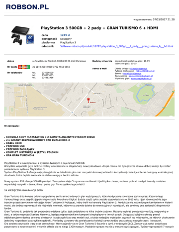 wygenerowano 07/03/2017 21:38 PlayStation 3 500GB + 2 pady + GRAN TURISMO 6 + HDMI cena 1249 zł dostępność Dostępny platforma PlayStation 3 odnośnik 5a8www.robson.pl/produkt,16797,playstation_3_500gb___2_pady___gran_turismo_6___hd.html Adres ul.Powstańców Śląskich 106D/200 01-466 Warszawa Nr konta 25 1140 2004 0000 3702 4553 9550 Nr telefonów tel. 224096600 tel. 730305005 tel. 224361966 Godziny otwarcia poniedziałek-piątek w godz. 11-19 sobota w godz. 10-15 Adres e-mail Oferta sklepu : [email protected] Pytania techniczne : [email protected] Serwis : [email protected] Zamówienia : [email protected] Wymiana gier : [email protected] W zestawie: ● ● ● ● ● ● ● KONSOLA SONY PLAYSTATION 3 Z ZAINSTALOWANYM DYSKIEM 500GB 2 x CZARNY BEZPRZEWODOWY PAD DUALSHOCK 3 KABEL HDMI PRZEWÓD USB PRZEWÓD ZASILAJĄCY KOMPLET INSTRUKCJI W JĘZYKU POLSKIM GRA GRAN TURISMO 6 PlayStation 3 w nowej formie, z dyskiem twardym o pojemności 500 GB. Wszystkie wspaniałe gry i funkcje zostały umieszczone w eleganckiej, nowej obudowie, dzięki czemu nie było jeszcze równie dobrej okazji, by zostać posiadaczem systemu PlayStation 3. System PlayStation 3 oferuje najwyższą jakość w dziedzinie gier oraz rozrywki domowej w bardzo korzystanej cenie i jest teraz dostępny w atrakcyjnej obudowie, która będzie zwracała na siebie uwagę w twoim salonie. Nowy system PS3 oferuje 500 GB pamięci. Ten system daje Ci ogromne możliwości i jeśli tylko chcesz, możesz pobrać na dysk twardy mnóstwo wspaniałej rozrywki – dema, filmy i pełne gry. Tu wszystko się pomieści! 24 MIESIĘCZNA GWARANCJA SONY Gran Turismo 6 to kolejna odsłona popularnej serii samochodowych gier wyścigowych, która tradycyjnie stworzona została przez Kazunoriego Yamauchiego oraz zespół z japońskiego studia Polyphony Digital. Szósta część cyklu została zapowiedziana w 2013 roku i jest równocześnie jego trzecim przedstawicielem (wliczając Gran Turisomo 5 Prologue), który trafił na konsolę PlayStation 3. Produkcja nie jest milowym kamieniem w historii marki, ale twórcy wprowadzili do niej wiele nowinek, którym co prawda daleko do rewolucyjnych rozwiązań, ale powinny one zadowolić długoletnich fanów. Gran Turismo 6, podobnie jak poprzednia odsłona cyklu, jest podzielone na kilka trybów zabawy. Możemy wybrać pojedynczy wyścig, rozgrywkę w sieci, a także rozpocząć karierę kierowcy, będącą odpowiednikiem kampanii singleplayer w innych grach. Osiągając kolejne sukcesy powoli odblokowujemy dostęp do coraz droższych i szybszych klas oraz modeli aut, a także rodzajów wyścigów, wyzwań lub mistrzostw, za których ukończenie jesteśmy nagradzani zastrzykiem gotówki. Pieniędzy używamy do powiększenia kolekcji samochodów oraz zakupu nowych części i ulepszeń. Gra zawiera wszystkie trasy oraz samochody, które pojawiły się w Gran Turismo 5 (łącznie z tymi z wydanych DLC). Zestaw aut został dodatkowo poszerzony o nowe modele i w sumie składa się na niego 1200 maszyn. Podobnie sprawa ma się z trasami wyścigowymi. Twórcy wprowadzili 7 nowych lokacji, posiadających różne konfiguracje i długości dróg. Znaczącą nowinką jest np. pojawienie się po raz pierwszy w serii sławnego brytyjskiego toru Silverstone. Kolejne maszyny i trasy znajdziemy w publikowanych zestawach DLC. Jeżeli chodzi o model jazdy wprowadzono zupełnie nowy silnik fizyczny, odpowiadający za aerodynamikę, pracę kół oraz zachowanie się zawieszenia. Długoletni wyjadacze Gran Turismo z pewnością docenią zmianę i zauważą różnice. Deweloperzy postawili także większy nacisk na modyfikowanie pojazdów i wpływanie na ich osiągi. Ułatwi to zapewne zupełnie nowy, przejrzysty i bardziej intuicyjny interfejs użytkownika. Oprawa nie uległa znaczącym zmianom w stosunku do piątej części. Co prawda, wprowadzono pewne zmiany do silnika graficznego, ale największą przeszkodą w osiągnięciu lepszych doznań wizualnych jest oczywiście moc PlayStation 3, które na długo przez premierą Gran Turismo 6 odstawało już wydajnością od przeciętnych gamingowych komputerów PC. Mimo wszystko, talent Japończyków sprawia, że gra jest jedną z najlepiej wyglądających produkcji na tę platformę.