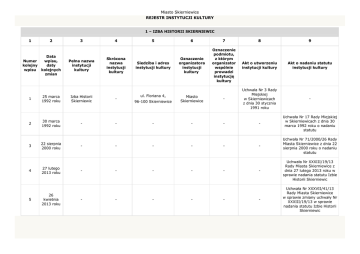 Miasto Skierniewice REJESTR INSTYTUCJI KULTURY 1 – IZBA HISTORII SKIERNIEWIC 1 2 Data Numer wpisu, kolejny daty wpisu kolejnych zmian 1 25 marca 1992 roku 2 30 marca 1992 roku 3 22 sierpnia 2000 roku 4 5 27 lutego 2013 roku 26 kwietnia 2013 roku 3 Pełna nazwa instytucji kultury Izba Historii Skierniewic - - - - 4 Skrócona nazwa instytucji kultury - - - - - 5 Siedziba i adres instytucji kultury ul. Floriana 4, 96-100 Skierniewice - - - - 6 7 8 9 Oznaczenie organizatora instytucji kultury Oznaczenie podmiotu, z którym organizator wspólnie prowadzi instytucję kultury Akt o utworzeniu instytucji kultury Akt o nadaniu statutu instytucji kultury - Uchwała Nr 3 Rady Miejskiej w Skierniewicach z dnia 30 stycznia 1991 roku - - Uchwała Nr 17 Rady Miejskiej w Skierniewicach z dnia 30 marca 1992 roku o nadaniu statutu - Uchwała Nr 71/2000/26 Rady Miasta Skierniewice z dnia 22 sierpnia 2000 roku o nadaniu statutu - Uchwała Nr XXXIII/19/13 Rady Miasta Skierniewice z dnia 27 lutego 2013 roku w sprawie nadania statutu Izbie Historii Skierniewic - Uchwała Nr XXXVII/41/13 Rady Miasta Skierniewice w sprawie zmiany uchwały Nr XXXIII/19/13 w sprawie nadania statutu Izbie Historii Skierniewic Miasto Skierniewice - - - - - - - - Miasto Skierniewice 2 – MIEJSKI OŚRODEK KULTURY 1 Numer kolejny wpisu 1 2 Data wpisu, daty kolejnych zmian 25 marca 1992 roku 3 Pełna nazwa instytucji kultury Miejski Ośrodek Kultury 4 Skrócona nazwa instytucji kultury MOK 5 Siedziba i adres instytucji kultury ul. Mszczonowska 40, 96-100 Skierniewice 6 7 8 9 Oznaczenie organizatora instytucji kultury Oznaczenie podmiotu, z którym organizator wspólnie prowadzi instytucję kultury Akt o utworzeniu instytucji kultury Akt o nadaniu statutu instytucji kultury - Uchwała Nr 80 Miejskiej Rady Narodowej w Skierniewicach z dnia 26 kwietnia 1982 roku - Miasto Skierniewice 2 7 października 1994 roku - - - - - - Uchwała Nr 17 Rady Miejskiej w Skierniewicach z dnia 7 października 1994 roku w sprawie nadania statutu Miejskiemu Ośrodkowi Kultury w Skierniewicach 3 22 listopada 1997 roku - - ul. Wita Stwosza 2/4, - - - - - Uchwała Nr 17/98/40 Rady Miejskiej w Skierniewicach z dnia 4 marca 1998 roku w sprawie zmian w statucie Miejskiego Ośrodka Kultury w Skierniewicach 4 4 marca 1998 roku 96-100 Skierniewice - - - - - 5 22 sierpnia 2000 roku - - - - - - Uchwała Nr 78/2000/26 Rady Miasta Skierniewice z dnia 22 sierpnia 2000 roku w sprawie zmian w statucie Miejskiego Ośrodka Kultury w Skierniewicach 6 24 listopada 2005 roku - - - - - - Uchwała Nr XLVIII/142/05 Rady Miasta Skierniewice z dnia 24 listopada 2005 roku Miasto Skierniewice w sprawie nadania statutu Miejskiemu Ośrodkowi Kultury w Skierniewicach 7 8 27 kwietnia 2012 roku 4 kwietnia 2015 roku - Centrum Kultury i Sztuki w Skierniewicach - CKiS - ul. Reymonta 33, 96-100 Skierniewice - - - - - Uchwała Nr XXIII/50/12 z dnia 27 kwietnia 2012 roku zmieniająca uchwałę w sprawie przyjęcia statutu Miejskiego Ośrodka Kultury w Skierniewicach - Uchwała Nr XVI/155/2015 Rady Miasta Skierniewice z dnia 30 września 2015 roku w sprawie zmiany uchwały Nr XIV/123/2015 Rady Miasta Skierniewice z dnia 20 sierpnia 2015 roku w sprawie przyjęcia statutu Centrum Kultury i Sztuki w Skierniewicach Miasto Skierniewice 3 – MŁODZIEŻOWE CENTRUM KULTURY 1 2 Data Numer wpisu, kolejny daty wpisu kolejnych zmian 1 2 25 marca 1992 roku 25 marca 1992 roku 3 Pełna nazwa instytucji kultury Wojewódzki Dom Kultury - 4 Skrócona nazwa instytucji kultury WDK - 5 Siedziba i adres instytucji kultury ul. Reymonta 33, 96-100 Skierniewice - 6 7 8 9 Oznaczenie organizatora instytucji kultury Oznaczenie podmiotu, z którym organizator wspólnie prowadzi instytucję kultury Akt o utworzeniu instytucji kultury Akt o nadaniu statutu instytucji kultury - Zarządzenie Nr 28 Wojewody Skierniewickiego z dnia 1 sierpnia 1975 roku w sprawie określenia zakładów oraz instytucji upowszechniania kultury i sztuki podchodzących pod bezpośredni nadzór organu administracji stopnia wojewódzkiego oraz ustalenia zasad ich funkcjonowania Zarządzenie Nr 13/76 Wojewody Skierniewickiego z dnia 9 marca 1976 roku w sprawie nadania statutu Wojewódzkiemu Domowi Kultury i Wojewódzkiej Bibliotece Publicznej w Skierniewicach - Uchwała Nr XIII/87/86 Wojewódzkiej Rady Narodowej w Skierniewicach w sprawie zatwierdzenia statutu organizacyjnego Wojewódzkiego Domu Kultury w Skierniewicach Wojewoda Skierniewicki - - 3 28 maja 1992 roku - - - - - - Zarządzenie Nr 29 Wojewody Skierniewickiego z dnia 28 maja 1992 roku w sprawie nadania statutu Wojewódzkiemu Domowi Kultury w Skierniewicach 4 22 lutego 1999 roku Młodzieżowe Centrum Kultury MCK - Miasto Skierniewice - Uchwała Nr 21/99/5 Rady Miejskiej w Skierniewicach w - Miasto Skierniewice sprawie wprowadzenia zmian w statucie miasta 5 6 7 22 sierpnia 2000 roku 27 stycznia 2012 roku 31 stycznia 2013 roku - - - - - - - - - - - - - - Uchwała Nr 70/2000/26 Rady Miasta Skierniewice z dnia 22 sierpnia 2000 roku w sprawie zmian w statucie Młodzieżowego Centrum Kultury - Uchwała Nr XX/14/12 Rady Miasta Skierniewice z dnia 27 stycznia 2012 roku w sprawie zamiaru likwidacji instytucji kultury pod nazwą Młodzieżowe Centrum Kultury w Skierniewicach - - Uchwała Nr XXXII/12/13 Rady Miasta Skierniewice z dnia 31 stycznia 2013 roku w sprawie likwidacji instytucji kultury pod nazwą Młodzieżowe Centrum Kultury w Skierniewicach - Miasto Skierniewice 4 – MIEJSKA BIBLIOTEKA PUBLICZNA 1 Numer kolejny wpisu 1 2 Data wpisu, daty kolejnych zmian 25 marca 1992 roku 2 22 lutego 1999 roku 3 30 września 1999 roku 3 Pełna nazwa instytucji kultury Wojewódzka Biblioteka Publiczna Miejska Biblioteka Publiczna - 4 Skrócona nazwa instytucji kultury WBM 5 Siedziba i adres instytucji kultury ul. Mszczonowska 43a, 96-100 Skierniewice MBP - - - 6 7 8 9 Oznaczenie organizatora instytucji kultury Oznaczenie podmiotu, z którym organizator wspólnie prowadzi instytucję kultury Akt o utworzeniu 