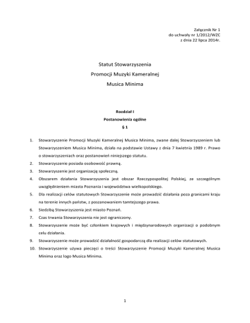 Załącznik Nr 1 do uchwały nr 1/2012/WZC z dnia 22 lipca 2014r. Statut Stowarzyszenia Promocji Muzyki Kameralnej Musica Minima Rozdział I Postanowienia ogólne § 1 1. Stowarzyszenie Promocji Muzyki Kameralnej Musica Minima, zwane dalej Stowarzyszeniem lub Stowarzyszeniem Musica Minima, działa na podstawie Ustawy z dnia 7 kwietnia 1989 r. Prawo o stowarzyszeniach oraz postanowień niniejszego statutu. 2. Stowarzyszenie posiada osobowość prawną. 3. Stowarzyszenie jest organizację społeczną. 4. Obszarem działania Stowarzyszenia jest obszar Rzeczypospolitej Polskiej, ze szczególnym uwzględnieniem miasta Poznania i województwa wielkopolskiego. 5. Dla realizacji celów statutowych Stowarzyszenie może prowadzić działania poza granicami kraju na terenie innych państw, z poszanowaniem tamtejszego prawa. 6. Siedzibą Stowarzyszenia jest miasto Poznań. 7. Czas trwania Stowarzyszenia nie jest ograniczony. 8. Stowarzyszenie może być członkiem krajowych i międzynarodowych organizacji o podobnym celu działania. 9. Stowarzyszenie może prowadzić działalność gospodarczą dla realizacji celów statutowych. 10. Stowarzyszenie używa pieczęci o treści Stowarzyszenie Promocji Muzyki Kameralnej Musica Minima oraz logo Musica Minima. 1 Rozdział II Cele i środki działania § 2 1. Podstawowe cele stowarzyszenia są następujące: a) promowanie i upowszechnianie kultury oraz sztuki, ze szczególnym uwzględnieniem muzyki kameralnej, b) promowanie i wspieranie działalności zespołów kameralnych, wykonujących muzykę wokalną, instrumentalną, oraz wokalno – instrumentalną w kraju i za granicą, c) podejmowanie działań związanych z szeroko pojmowaną edukacja kulturalną i pobudzaniem aktywności twórczej, a w szczególności muzycznej, d) popularyzacja wiedzy oraz Polskich osiągnięć naukowych i artystycznych w zakresie muzyki w kraju i za granicą, e) podejmowanie działań promujących integrację muzyki kameralnej z innymi dziedzinami sztuki, f) 2. promowanie polskiej muzyki wokalnej oraz wokalno-‐instrumentalnej za granicą. Stowarzyszenie realizuje swoje cele poprzez: a) organizację koncertów, spotkań, festiwali, konkursów, wystaw, dyskusji, imprez kulturalnych oraz zapewnienie promocji tych wydarzeń, b) organizację kursów, warsztatów i szkoleń związanych z wykonawstwem muzyki kameralnej w Polsce i za granicą, c) wspieranie i popularyzowanie działalności wybranych zespołów kameralnych, d) organizowanie wyjazdów artystycznych (tournée) oraz szkoleniowych (warsztaty, kursy) dla utalentowanych zespołów muzycznych, wykonujących muzykę kameralną, e) działalność twórcą członków stowarzyszenia, f) sporządzanie nagrań dźwiękowych i audiowizualnych, g) sprzedaż detaliczną nagrań dźwiękowych i audiowizualnych prowadzoną w wyspecjalizowanych sklepach oraz przez Internet, h) prowadzenie działalności wydawniczej, i) prowadzenie działalności promocyjnej, j) współpracę z władzami samorządowymi, oświatowymi, kościelnymi, instytucjami, fundacjami, stowarzyszeniami, osobami prawnymi oraz osobami fizycznymi, k) współpracę ze środkami masowego przekazu, l) współpracę ze środowiskiem muzycznym w RP oraz poza jej granicami, 2 m) współdziałanie z organizacjami zagranicznymi o podobnych celach w dziedzinie upowszechniania kultury muzycznej, n) pozyskiwanie środków na realizację celów statutowych Stowarzyszenia. Rozdział III Członkostwo § 3 Członkowie Stowarzyszenia dzielą się na: a) Zwyczajnych b) Honorowych § 4 1. Członkami zwyczajnymi mogą być pełnoletni obywatele polscy, polskie osoby prawne, jak również pełnoletni cudzoziemcy i zagraniczne podmioty prawne dopuszczone do działania na terytorium Rzeczypospolitej Polskiej zgodnie z odrębnymi przepisami. 2. Członkiem zwyczajnym może zostać osoba wskazana w § 4 ust. 1 niniejszego statutu , która złoży deklarację przystąpienia do Stowarzyszenia (deklaracja członkowska). 3. Decyzję w sprawie przyjęcia w poczet członków Stowarzyszenia, na podstawie złożonej deklaracji członkowskiej podejmuje Zarząd, zwykłą większością głosów na pierwszym posiedzeniu po złożeniu deklaracji członkowskiej. 4. Członek zwyczajny ma prawo do: a) czynnego i biernego prawa wyborczego do władz Stowarzyszenia, b) uczestniczenia we wszystkich zebraniach i zabierania głosu we wszystkich sprawach Stowarzyszenia oraz zgłaszania swoich uwag i wniosków dotyczących działalności Stowarzyszenia, 5. c) oceny pracy władz Stowarzyszenia, d) brania udziału we wszelkich formach działalności Stowarzyszenia. Członek zwyczajny ma obowiązek: a) przestrzegać statutu i uchwał władz Stowarzyszenia, respektować decyzje Zarządu i Walnego Zgromadzenia, b) aktywnie uczestniczyć w działalności Stowarzyszenia i przyczyniać się do realizacji jego celów statutowych, c) opłacać regularnie składki członkowskie, określone przez Walne Zebranie. 3 6. Członek zwyczajny, który wykazuje szczególne zaangażowanie w działalność Stowarzyszenia, ze względu na trudna sytuację majątkową może być zwolniony przez Zarząd z obowiązku opłacenia składki. 4 § 5 1. Członkiem honorowym może zostać osoba fizyczna, szczególnie zasłużona dla Stowarzyszenia. 2. Tytuł członka honorowego nadaje i odbiera Walne Zebranie Członków na wniosek Zarządu. 3. Członek honorowy ma prawo do: a) czynnego i biernego prawa wyborczego do władz Stowarzyszenia, b) uczestniczenia we wszystkich zebraniach i zabierania głosu we wszystkich sprawach Stowarzyszenia oraz zgłaszania swoich uwag i wniosków dotyczących działalności Stowarzyszenia, c) oceny pracy władz Stowarzyszenia, d) brania udziału we wszelkich formach działalności Stowarzyszenia. 4. Członek honorowy ma obowiązek przestrzegać postanowień statutu i uchwał władz Stowarzyszenia. 5. Członek honorowy zwolniony z obowiązku opłacania składek. § 6 1. Członkostwo wygasa na skutek: a) dobrowolnego wyst