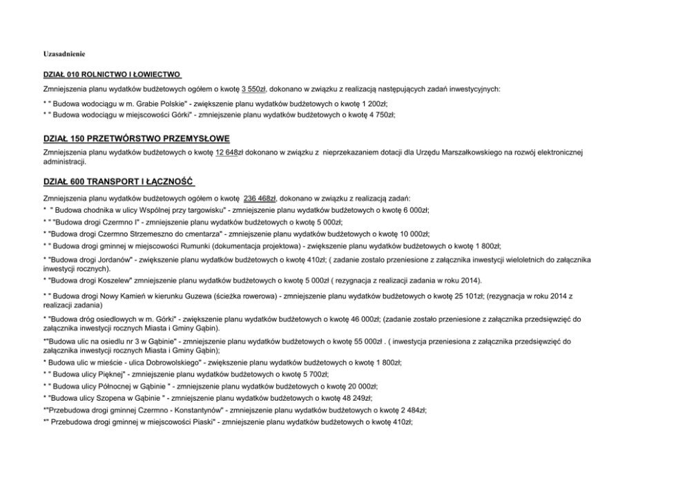 Uzasadnienie DZIAŁ 010 ROLNICTWO I ŁOWIECTWO Zmniejszenia planu wydatków budżetowych ogółem o kwotę 3 550zł, dokonano w związku z realizacją następujących zadań inwestycyjnych: * " Budowa wodociągu w m. Grabie Polskie" - zwiększenie planu wydatków budżetowych o kwotę 1 200zł; * " Budowa wodociągu w miejscowości Górki" - zmniejszenie planu wydatków budżetowych o kwotę 4 750zł; DZIAŁ 150 PRZETWÓRSTWO PRZEMYSŁOWE Zmniejszenia planu wydatków budżetowych o kwotę 12 648zł dokonano w związku z nieprzekazaniem dotacji dla Urzędu Marszałkowskiego na rozwój elektronicznej administracji. DZIAŁ 600 TRANSPORT I ŁĄCZNOŚĆ Zmniejszenia planu wydatków budżetowych ogółem o kwotę 236 468zł, dokonano w związku z realizacją zadań: * " Budowa chodnika w ulicy Wspólnej przy targowisku" - zmniejszenie planu wydatków budżetowych o kwotę 6 000zł; * " "Budowa drogi Czermno I" - zmniejszenie planu wydatków budżetowych o kwotę 5 000zł; * "Budowa drogi Czermno Strzemeszno do cmentarza" - zmniejszenie planu wydatków budżetowych o kwotę 10 000zł; * " Budowa drogi gminnej w miejscowości Rumunki (dokumentacja projektowa) - zwiększenie planu wydatków budżetowych o kwotę 1 800zł; * "Budowa drogi Jordanów" - zwiększenie planu wydatków budżetowych o kwotę 410zł; ( zadanie zostalo przeniesione z załącznika inwestycji wieloletnich do załącznika inwestycji rocznych). * "Budowa drogi Koszelew" zmniejszenie planu wydatków budżetowych o kwotę 5 000zł ( rezygnacja z realizacji zadania w roku 2014). * " Budowa drogi Nowy Kamień w kierunku Guzewa (ścieżka rowerowa) - zmniejszenie planu wydatków budżetowych o kwotę 25 101zł; (rezygnacja w roku 2014 z realizacji zadania) * "Budowa dróg osiedlowych w m. Górki" - zwiększenie planu wydatków budżetowych o kwotę 46 000zł; (zadanie zostało przeniesione z załącznika przedsięwzięć do załącznika inwestycji rocznych Miasta i Gminy Gąbin). *"Budowa ulic na osiedlu nr 3 w Gąbinie" - zmniejszenie planu wydatków budżetowych o kwotę 55 000zł . ( inwestycja przeniesiona z załącznika przedsięwzięć do załącznika inwestycji rocznych Miasta i Gminy Gąbin); * Budowa ulic w mieście - ulica Dobrowolskiego" - zwiększenie planu wydatków budżetowych o kwotę 1 800zł; * " Budowa ulicy Pięknej" - zmniejszenie planu wydatków budżetowych o kwotę 5 700zł; * " Budowa ulicy Północnej w Gąbinie " - zmniejszenie planu wydatków budżetowych o kwotę 20 000zł; * "Budowa ulicy Szopena w Gąbinie " - zmniejszenie planu wydatków budżetowych o kwotę 48 249zł; *"Przebudowa drogi gminnej Czermno - Konstantynów" - zmniejszenie planu wydatków budżetowych o kwotę 2 484zł; *" Przebudowa drogi gminnej w miejscowości Piaski" - zmniejszenie planu wydatków budżetowych o kwotę 410zł; * "Przebudowa drogi gminnej w Nowym Wymyślu"- zmniejszenie planu wydatków budżetowych o kwotę 5 349zł; (przeniesienie planu z załącznika przedsięwzięć do załącznika inwestycji rocznych) * "Zagospodarowanie ulic na osiedlu Wojska Polskiego w Gąbinie" - zwiększenie planu wydatków budżetowych o kwotę 120 000zł; (nowa inwestycja); * w związku z odejściem na emeryturę pracownika zajmującego się sprawami dróg zmniejszono plan wydatków budżetowych na wydatki osobowe niezaliczane do wynagrodzeń o kwotę 420zł oraz opłaty z tytułu zakupu usług telekomunikacyjnych świadczonych w stacjonarnej publicznej sieci telefonicznej o kwotę 500zł; * "Budowa drogi - Grabie Polskie- zmniejszenie planu wydatków budżetowych o kwotę 20 000zł; *"Budowa drogi Kępina Plebanka Czermno(ścieżka) - zmniejszenie planu wydatków budżetowych o kwotę 58 000zł; (rezygnacja z realizacji zadania); * "Budowa ulic wraz z kanalizacją deszczową na Osiedlu Pisarzy w Gąbinie - zmniejszenie planu wydatków budżetowych o kwotę 100 000zł * w związku z koniecznością zabezpieczenia środków na zakup usług remontowych na drogach gminnych - zwiększenie planu wydatków budżetowych o kwotę 20 000zł; * różne opłaty i składki - zmniejszenie planu wydatków budżetowych o kwotę 20 000zł; (wyłączenie gruntów pod drogi gminne); * transport zbiorowy ( linia autobusowa nr 21) - dostosowanie planu do projektu aneksu do porozumienia z KMP Płock - zwiększenie planu wydatków budżetowych o kwotę 735zł, * Dotacja dla Powiatu Płockiego na budowę drogi w Strzemesznie- zmniejszenie planu wydatków budżetowych o kwotę 40 000zł; DZIAŁ 700 GOSPODARKA MIESZKANIOWA Zmniejszenia planu wydatków budżetowych ogółem o kwotę 62 460zł, dokonano w związku: * z mniejszą niż pierwotnie planowano wypłatą odszkodowań dla osób fizycznych za działki pod drogi gminne - zmniejszenie planu wydatków budżetowych o kwotę 60 000zł; * z mniejszymi niż pierwotnie planowano wydatkami na zakupy inwestycyjne jednostek budżetowych - zakup gruntów - zmniejszenie planu wydatków budżetowych o kwotę 2 460zł; Dokonano również przesunięcia środków w kwocie 2 000zł z zakupu usług pozostałych na zakup materiałów i wyposażenia do budynków będących własnością MiG Gąbin. DZIAŁ 710 DZIAŁALNOŚĆ USŁUGOWA Zmniejszenia planu wydatków budżetowych o kwotę 35 000zł dokonano w związku z rezygnacją z realizacji wykonania w roku 2014 planów zagospodarowania przestrzennego. DZIAŁ 750 ADMINISTRACJA PUBLICZNA Zwiększenia planu wydatków budżetowych ogółem o kwotę 32 644zł dokonano na podstawie : * konieczności zabezpieczenia środków na zakup materiałów i wyposażenia do Urzędu MiG Gąbin - zwiększenie planu wydatków budżetowych o kwotę 8 000zł; * konieczności zabezpieczenia środków na zakup usług pozostałych do Urzędu MiG Gąbin - zwiększenie planu wydatków budżetowych o kwotę 4 000zł; * konieczności zabezpieczenia środków na opłaty z tytułu zakupu usług telekomunikacyjnych świadczonych w stacjonarnej publicznej sieci telefonicznej - zwiększenie planu wydatków budże