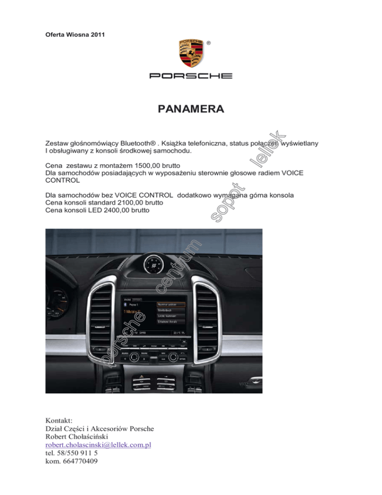 Oferta Wiosna 2011 PANAMERA Zestaw głośnomówiący Bluetooth® . Książka telefoniczna, status połączeń wyświetlany I obsługiwany z konsoli środkowej samochodu. Cena zestawu z montażem 1500,00 brutto Dla samochodów posiadających w wyposażeniu sterownie głosowe radiem VOICE CONTROL Dla samochodów bez VOICE CONTROL dodatkowo wymagana górna konsola Cena konsoli standard 2100,00 brutto Cena konsoli LED 2400,00 brutto Kontakt: Dział Części i Akcesoriów Porsche Robert Chołaściński [email protected] tel. 58/550 911 5 kom. 664770409