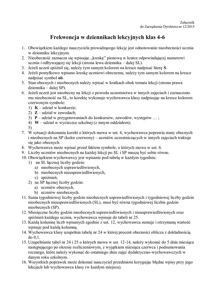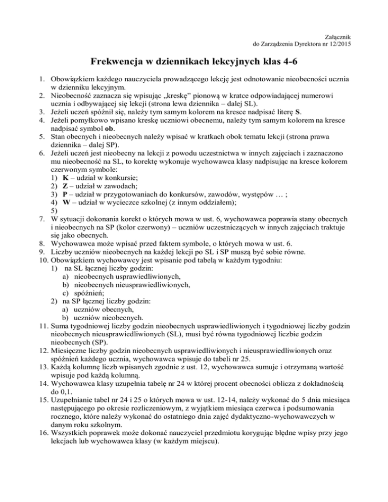 Załącznik do Zarządzenia Dyrektora nr 12/2015 Frekwencja w dziennikach lekcyjnych klas 4-6 1. Obowiązkiem każdego nauczyciela prowadzącego lekcję jest odnotowanie nieobecności ucznia w dzienniku lekcyjnym. 2. Nieobecność zaznacza się wpisując „kreskę” pionową w kratce odpowiadającej numerowi ucznia i odbywającej się lekcji (strona lewa dziennika – dalej SL). 3. Jeżeli uczeń spóźnił się, należy tym samym kolorem na kresce nadpisać literę S. 4. Jeżeli pomyłkowo wpisano kreskę uczniowi obecnemu, należy tym samym kolorem na kresce nadpisać symbol ob. 5. Stan obecnych i nieobecnych należy wpisać w kratkach obok tematu lekcji (strona prawa dziennika – dalej SP). 6. Jeżeli uczeń jest nieobecny na lekcji z powodu uczestnictwa w innych zajęciach i zaznaczono mu nieobecność na SL, to korektę wykonuje wychowawca klasy nadpisując na kresce kolorem czerwonym symbole: 1) K – udział w konkursie; 2) Z – udział w zawodach; 3) P – udział w przygotowaniach do konkursów, zawodów, występów … ; 4) W – udział w wycieczce szkolnej (z innym oddziałem); 5) 7. W sytuacji dokonania korekt o których mowa w ust. 6, wychowawca poprawia stany obecnych i nieobecnych na SP (kolor czerwony) – uczniów uczestniczących w innych zajęciach traktuje się jako obecnych. 8. Wychowawca może wpisać przed faktem symbole, o których mowa w ust. 6. 9. Liczby uczniów nieobecnych na każdej lekcji po SL i SP muszą być sobie równe. 10. Obowiązkiem wychowawcy jest wpisanie pod tabelą w każdym tygodniu: 1) na SL łącznej liczby godzin: a) nieobecnych usprawiedliwionych, b) nieobecnych nieusprawiedliwionych, c) spóźnień; 2) na SP łącznej liczby godzin: a) uczniów obecnych, b) uczniów nieobecnych. 11. Suma tygodniowej liczby godzin nieobecnych usprawiedliwionych i tygodniowej liczby godzin nieobecnych nieusprawiedliwionych (SL), musi być równa tygodniowej liczbie godzin nieobecnych (SP). 12. Miesięczne liczby godzin nieobecnych usprawiedliwionych i nieusprawiedliwionych oraz spóźnień każdego ucznia, wychowawca wpisuje do tabeli nr 25. 13. Każdą kolumnę liczb wpisanych zgodnie z ust. 12, wychowawca sumuje i otrzymaną wartość wpisuje pod każdą kolumną. 14. Wychowawca klasy uzupełnia tabelę nr 24 w której procent obecności oblicza z dokładnością do 0,1. 15. Uzupełnianie tabel nr 24 i 25 o których mowa w ust. 12-14, należy wykonać do 5 dnia miesiąca następującego po okresie rozliczeniowym, z wyjątkiem miesiąca czerwca i podsumowania rocznego, które należy wykonać do ostatniego dnia zajęć dydaktyczno-wychowawczych w danym roku szkolnym. 16. Wszystkich poprawek może dokonać nauczyciel przedmiotu korygując błędne wpisy przy jego lekcjach lub wychowawca klasy (w każdym miejscu).