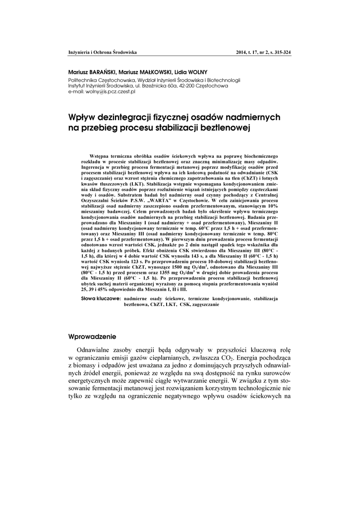 Inżynieria i Ochrona Środowiska 2014, t. 17, nr 2, s. 315-324 Mariusz BARAŃSKI, Mariusz MAŁKOWSKI, Lidia WOLNY Politechnika Częstochowska, Wydział Inżynierii Środowiska i Biotechnologii Instytut Inżynierii Środowiska, ul. Brzeźnicka 60a, 42-200 Częstochowa e-mail: [email protected] Wpływ dezintegracji fizycznej osadów nadmiernych na przebieg procesu stabilizacji beztlenowej Wstępna termiczna obróbka osadów ściekowych wpływa na poprawę biochemicznego rozkładu w procesie stabilizacji beztlenowej oraz znaczną minimalizację masy odpadów. Ingerencja w przebieg procesu fermentacji metanowej poprzez modyfikację osadów przed procesem stabilizacji beztlenowej wpływa na ich końcową podatność na odwadnianie (CSK i zagęszczanie) oraz wzrost stężenia chemicznego zapotrzebowania na tlen (ChZT) i lotnych kwasów tłuszczowych (LKT). Stabilizacja wstępnie wspomagana kondycjonowaniem zmienia skład fizyczny osadów poprzez rozluźnienie wiązań istniejących pomiędzy cząsteczkami wody i osadów. Substratem badań był nadmierny osad czynny pochodzący z Centralnej Oczyszczalni Ścieków P.S.W. „WARTA” w Częstochowie. W celu zainicjowania procesu stabilizacji osad nadmierny zaszczepiono osadem przefermentowanym, stanowiącym 10% mieszaniny badawczej. Celem prowadzonych badań było określenie wpływu termicznego kondycjonowania osadów nadmiernych na przebieg stabilizacji beztlenowej. Badania przeprowadzono dla Mieszaniny I (osad nadmierny + osad przefermentowany), Mieszaniny II (osad nadmierny kondycjonowany termicznie w temp. 60°C przez 1,5 h + osad przefermentowany) oraz Mieszaniny III (osad nadmierny kondycjonowany termicznie w temp. 80°C przez 1,5 h + osad przefermentowany). W pierwszym dniu prowadzenia procesu fermentacji odnotowano wzrost wartości CSK, jednakże po 2 dniu nastąpił spadek tego wskaźnika dla każdej z badanych próbek. Efekt obniżenia CSK stwierdzono dla Mieszaniny III (80°C 1,5 h), dla której w 4 dobie wartość CSK wynosiła 143 s, a dla Mieszaniny II (60°C - 1,5 h) wartość CSK wyniosła 123 s. Po przeprowadzeniu procesu 10-dobowej stabilizacji beztlenowej najwyższe stężenie ChZT, wynoszące 1500 mg O2/dm3, odnotowano dla Mieszaniny III (80°C - 1,5 h) przed procesem oraz 1355 mg O2/dm3 w drugiej dobie prowadzenia procesu dla Mieszaniny II (60°C - 1,5 h). Po przeprowadzeniu procesu stabilizacji beztlenowej ubytek suchej materii organicznej wyrażony za pomocą stopnia przefermentowania wyniósł 25, 39 i 45% odpowiednio dla Mieszanin I, II i III. Słowa kluczowe: nadmierne osady ściekowe, termiczne kondycjonowanie, stabilizacja beztlenowa, ChZT, LKT, CSK, zagęszczanie Wprowadzenie Odnawialne zasoby energii będą odgrywały w przyszłości kluczową rolę w ograniczaniu emisji gazów cieplarnianych, zwłaszcza CO2. Energia pochodząca z biomasy i odpadów jest uważana za jedno z dominujących przyszłych odnawialnych źródeł energii, ponieważ ze względu na swą dostępność na rynku surowców energetycznych może zapewnić ciągłe wytwarzanie energii. W związku z tym stosowanie fermentacji metanowej jest rozwiązaniem korzystnym technologicznie nie tylko ze względu na ograniczenie negatywnego wpływu osadów ściekowych na 316 M. Barański, M. Małkowski, L. Wolny środowisko, ale również pod względem ekonomiki procesu, dając możliwość pozyskania potencjalnego źródła czystej energii, jakim jest biogaz [1-3]. Ideą procesów mających na celu preparowanie osadów ściekowych przed ich fermentacją jest doprowadzenie do rozerwania błony komórkowej oraz rozpadu komórek mikroorganizmów. Przebieg procesu stabilizacji beztlenowej może zależeć również od stosowanej metody kondycjonowania [4, 5]. Zastosowanie termicznej obróbki osadów przed procesem mezofilowej stabilizacji beztlenowej powoduje rozdrobnienie i zniszczenie komórek mikroorganizmów osadu nadmiernego, co wpływa na wzrost ich biodegradowalności [6-8]. W wyniku zachodzącej hydrolizy termicznej osadów już na etapie procesu kondycjonowania następuje wzrost wartości chemicznego zapotrzebowania tlenu (ChZT) oraz generowanie lotnych kwasów tłuszczowych (LKT), co wpływa bezpośrednio na przebieg hydrolizy biologicznej, stanowiącej pierwszą fazę stabilizacji beztlenowej [9]. Skutkiem takich działań jest uwolnienie z wnętrza komórek organicznych składników, które stanowią substrat dla heterotroficznej biomasy. Woda związana biologicznie wewnątrz komórek zostaje w wyniku kondycjonowania osadów uwolniona, co umożliwia uzyskanie wyższej efektywności odwadniania po procesach stabilizacyjnych [10]. Jak podają Zheng i inni [8] oraz Tanaka i inni [11], w wyniku termicznego kondycjonowania osadów obserwuje się znaczny wzrost podatności osadów nadmiernych na biodegradację, co wpływa na stopień ich przefermentowania oraz intensywność produkcji biogazu. W wyniku zachodzącej hydrolizy termicznej osadów już na etapie kondycjonowania następuje generowanie lotnych kwasów tłuszczowych (LKT). Uzyskana wartość LKT determinuje przebieg hydrolizy biologicznej, stanowiącej pierwszą fazę stabilizacji beztlenowej. Zwiększenie szybkości wytwarzania LKT oraz wzrost ich wartości w kolejnych dobach kwaśnej fermentacji wpływa bezpośrednio na efektywność procesu stabilizacji, tj. wzrost produkcji biogazu oraz stopień przefermentowania [12-14]. Celem przeprowadzonych badań było określenie wpływu wstępnej obróbki osadów nadmiernych, poprzez zastosowanie metody termicznej, na efektywność i przebieg procesu stabilizacji beztlenowej. 1. Część doświadczalna Podstawowym substratem badań był nadmierny osad czynny (90%) oraz osad przefermentowany (10%), pełniący rolę zaszczepu. Osady pobrano z Centralnej Oczyszczalni Ścieków P.S.W. „WARTA” w Częstochowie. Ogólną charakterystykę osadów nadmiernych oraz przefermentowanych przedstawiono w tabeli 1. W pierwszym etapie badań jako kryterium oceny prze