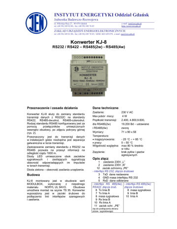 INSTYTUT ENERGETYKI Oddział Gdańsk Jednostka Badawczo-Rozwojowa ul. Mikołaja Reja 27, 80-870 Gdańsk tel. (48 58) 349 82 00, fax: (48 58) 349 76 85 e-mail: [email protected] http://www.ien.gda.pl ZAKŁAD URZĄDZEŃ ENERGOELEKTRONICZNYCH tel. (48 58) 349 81 00, fax: (48 58) 349 76 85, GSM: 602 639 079, e-mail: [email protected] Konwerter KJ-8 RS232 / RS422 – RS485(2w) - RS485(4w) Przeznaczenie i zasada działania Konwerter KJ-8 służy do zamiany standardu transmisji danych z RS232C na standardy RS422, RS485-dwudrut, RS485-czterodrut. Rodzaj standardu RS485 konfigurowany jest za pomocą przełączników umieszczonych wewnątrz obudowy, po zdjęciu pokrywy górnej (rys. 2). Przeznaczony jest do transmisji danych w instalacjach gdzie niezbędna jest separacja galwaniczna w torze transmisji. Zastosowanie zamiany standardu z RS232 na RS485 pozwala na przesył informacji na odległość rzędu 1000 m. Diody LED umieszczone obok zacisków sygnałowych i zasilających sygnalizują obecność odpowiadających im impulsów w torach transmisji. Dioda zielona – obecność zasilania urządzenia. Budowa KJ-8 montowany jest w obudowie serii MODULBOX, wykonanej z niepalnego materiału NORYL UL 94VO. Obudowa umożliwia montaż na szynie TS 35. Konwerter wyposażony jest w zaciski śrubowe do podłączenia linii interfejsów szeregowych i zasilania. Dane techniczne: Zasilanie: Max pobór mocy: Prędkość transmisji: dla RS485(2w) i RS485(4w) Wymiary: Temperatura: • magazynowania: • pracy: Wilgotność względna: Zapylenie: 230 V AC 4W 2.400, 4.800,9.600, 19.200 Bd – ustawiane zworą 71 x 90 x 58 - 25 °C ÷ + 85 °C 0 ÷ 50 °C max 80 % średnio w roku brak pyłów i gazów agresywnych Opis złącz 1 zasilanie 230V „L” 2 zasilanie 230V „N” 12 zacisk ochronny „PE” - interfejs RS 232; złącza śrubowe 3 TxD dane nadawane 4 GND masa interfejsu RS 232 5 RxD dane odbierane - interfejs RS 485(4w), - interfejs RS 485(2w); RS422; złącza śrub. złącza śrubowe 6 Tx linia B 8 masa sygnałowa 7 Tx linia A 9 linia B 8 masa sygnałowa 10 linia A 9 Rx linia B 10 Rx linia A 11 zacisk ochr. „PE” (np.do podłączenia ekranu przew. sygnałowego) 1 2 12 3 4 5 RS232 L N PE Tx Rx ~230V 3,5VA Tx PE B A Konwerter KJ - 8 11 6 GND 7 8 Rx B A 9 10 RS485(2w) RS485(4w) lub RS422 1 2 3 4 5 6 7 8 Rys.1. Schemat blokowy konwertera KJ – 8. 2.400 9.600 4.800 19.200 Rys. 2. Konfiguracja konwertera po zdjęciu pokrywy. 10 +Vc2 J1 J3 9 J2 GND2 Rys. 3. Konfiguracja terminatorów linii. Zwory J1, J2, J3 instalować tylko w konwerterach na końcach linii. Instalowanie zworek w pozostałych konwerterach dołączonych wzdłuż linii może powodować ich niewłaściwe działanie. Rys. 4. Wymiary konwertera KJ – 8.
