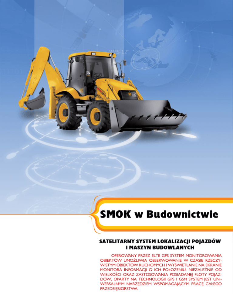 SMOK w Budownictwie SATELITARNY SYSTEM LOKALIZACJI POJAZDÓW I MASZYN BUDOWLANYCH OFEROWANY PRZEZ ELTE GPS SYSTEM MONITOROWANIA OBIEKTÓW UMO¯LIWIA OBSERWOWANIE W CZASIE RZECZYWISTYM OBIEKTÓW RUCHOMYCH I WYŒWIETLANIE NA EKRANIE MONITORA INFORMACJI O ICH PO£O¯ENIU. NIEZALE¯NIE OD WIELKOŒCI ORAZ ZASTOSOWANIA POSIADANEJ FLOTY POJAZDÓW, OPARTY NA TECHNOLOGII GPS I GSM SYSTEM JEST UNIWERSALNYM NARZÊDZIEM WSPOMAGAJ¥CYM PRACÊ CA£EGO PRZEDSIÊBIORSTWA. SMOK w Budownictwie Oferowany przez Elte GPS System Monitorowania Obiektów Kraków (SMOK) umo¿liwia obserwowanie w czasie rzeczywistym obiektów ruchomych i wyœwietlanie na ekranie monitora na mapach cyfrowych bie¿¹cych informacji o ich po³o¿eniu. Niezale¿nie od wielkoœci oraz zastosowania posiadanej floty pojazdów, oparty na technologii GPS i GSM system jest uniwersalnym narzêdziem wspomagaj¹cym pracê ca³ego przedsiêbiorstwa. Zastosowanie systemu SMOK w budownictwie umo¿liwia kontrolowanie czasu pracy operatorów maszyn, jak równie¿ s³u¿y weryfikacji zleconych zadañ. Sta³y monitoring zwiêksza bezpieczeñstwo pracowników i sprzêtu. Dziêki optymalizacji wykorzystania zasobów ludzkich i technicznych oraz poprzez bie¿¹ce rejestrowanie zu¿ycia paliwa, satelitarny system monitorowania pozwala obni¿yæ koszty utrzymania floty pojazdów. System ten zatem poleciæ mo¿na wszystkim przedsiêbiorstwom organizuj¹cym i wykonuj¹cym roboty budowlane. Na system SMOK sk³ada siê: • sterownik ET -GPS-GSM, zwany równie¿ komputerem pok³adowym, • aplikacje: GPS Monitor i Rejestr GPS. Sterownik GPS mo¿e wspó³pracowaæ z ró¿nymi urz¹dzeniami lub czujnikami zainstalowanymi dodatkowo w pojeŸdzie, co pozwala kontrolowaæ wszystkie istotne parametry eksploatacyjne pojazdów. Istnieje tak¿e mo¿liwoœæ zdalnego sterowania prac¹ urz¹dzeñ. Dla przedsiêbiorstw prowadz¹cych dzia³alnoœæ budowlan¹ szczególnie polecane s¹ nastêpuj¹ce akcesoria pojazdowe: 1. Urz¹dzenia s³u¿¹ce do kontroli czasu pracy: • identyfikator operatora pojazdu w formie pastylki Dallas, karty bezstykowej, klucza kodowego b¹dŸ mo¿liwoœæ wpisywania swojego kodu (pozwala na sprawne generowanie kart kierowców i zestawianie zapisów pracy sprzêtu z danymi konkretnych pracowników). 2. U rz¹dzenie pomiarowo - sygnalizacyjne s³u¿¹ce do kontroli paliwa w zbiorniku: • mikroprocesorowa sonda, • procesorowy analizator poziomu paliwa, • czujnik otwarcia „korka” wlewu paliwa. 3. Ponadto, Elte GPS oferuje szereg innych akcesoriów, takich jak np.: zestaw g³oœno-mówi¹cy, czy interfejs do magistrali CAN (umo¿liwiaj¹cy monitorowanie i rejestrowanie wielu parametrów zwi¹zanych z bie¿¹c¹ eksploatacj¹ pojazdu przez podpiêcie do fabrycznie montowanych czujników). Wdro¿enie satelitarnego systemu lokalizacji obiektów ruchomych w przedsiêbiorstwach budowlanych znacz¹co u³atwia sprawne zarz¹dzanie personelem i zapleczem sprzêtowym. Poprzez bie¿¹c¹ rejestracjê i archiwizacjê pozycji geograficznej maszyn, czasu i sposobu realizacji pracy, iloœci postojów, pustych przebiegów oraz pomiar poziomu paliwa w zbiorniku SMOK stanowi bogate Ÿrodlo informacji na potrzeby logistyczne i administracyjne firmy. Rozleg³a baza danych stanowi dla przedsiêbiorcy podstawê planowania i u³atwia sprawne zarz¹dzanie personelem i zapleczem technicznym. System, zapewniaj¹c sta³y nadzór nad u¿ytkowanym sprzêtem wp³ywa na zwiêkszenie efektywnoœci i wydajnoœci pracy obs³ugi technicznej. • czujnik pracy sprzêtu (instalowany na pojeŸdzie, wszêdzie tam gdzie zachodzi potrzeba rejestracji pracy wyszczególnionego urz¹dzenia np. lemiesza, ³y¿ki, haka za³adowczego itp.), ELTE GPS Sp. z o.o. 30-688 Kraków ul. Medyczna 13 tel. 12 659 20 98, fax 12 659 17 88 [email protected] http://elte.systemygps.com.pl S¹d Rejonowy dla Krakowa-Œródmieœcia Wydzia³ XI Gospodarczy Krajowego Rejestru S¹dowego KR S 0000253803 NIP 679-288-48-50, Kapita³ zak³adowy 50 000 z³.