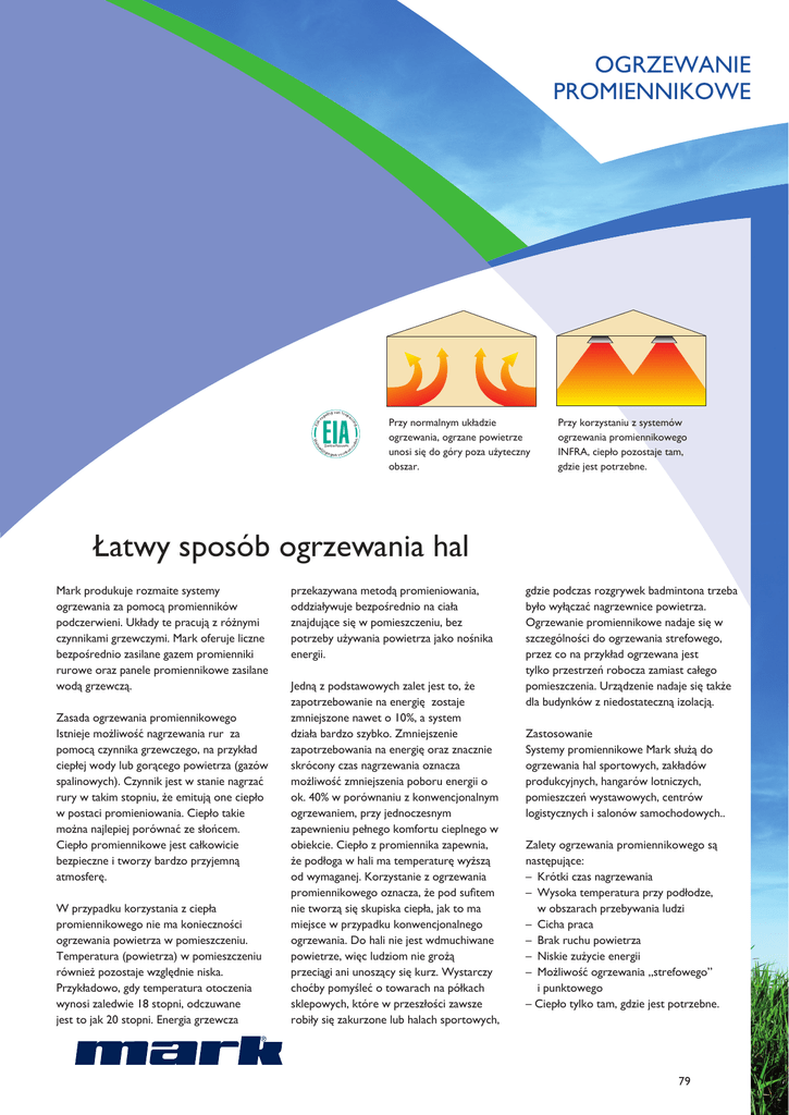 OGRZEWANIE PROMIENNIKOWE Przy normalnym układzie ogrzewania, ogrzane powietrze unosi się do góry poza użyteczny obszar. Przy korzystaniu z systemów ogrzewania promiennikowego INFRA, ciepło pozostaje tam, gdzie jest potrzebne. Łatwy sposób ogrzewania hal Mark produkuje rozmaite systemy ogrzewania za pomocą promienników podczerwieni. Układy te pracują z różnymi czynnikami grzewczymi. Mark oferuje liczne bezpośrednio zasilane gazem promienniki rurowe oraz p anele promiennikowe zasilane wodą g rzewczą. Zasada ogrzewania promiennikowego Istnieje możliwość nagrzewania rur za pomocą c zynnika grzewczego, na przykład ciepłej wody lub gorącego powietrza (gazów spalinowych). Czynnik jest w stanie nagrzać rury w takim stopniu, że emitują one ciepło w postaci promieniowania. Ciepło takie można najlepiej porównać ze słońcem. Ciepło promiennikowe jest całkowicie bezpieczne i tworzy bardzo przyjemną atmosferę. W przypadku korzystania z ciepła promiennikowego nie ma konieczności ogrzewania powietrza w pomieszczeniu. Temperatura (powietrza) w pomieszczeniu również pozostaje względnie niska. Przykładowo, gdy temperatura otoczenia wynosi zaledwie 18 stopni, odczuwane jest to jak 20 stopni. Energia grzewcza przekazywana metodą promieniowania, oddziaływuje bezpośrednio na ciała znajdujące się w p omieszczeniu, bez potrzeby używania p owietrza jako nośnika energii. Jedną z podstawowych zalet jest to, że zapotrzebowanie na energię zostaje zmniejszone nawet o 10%, a system działa bardzo szybko. Zmniejszenie zapotrzebowania na energię oraz znacznie skrócony czas nagrzewania oznacza możliwość zmniejszenia poboru energii o ok. 40% w porównaniu z konwencjonalnym ogrzewaniem, przy jednoczesnym zapewnieniu pełnego komfortu cieplnego w obiekcie. Ciepło z promiennika zapewnia, że podłoga w hali ma temperaturę wyższą od wymaganej. Korzystanie z ogrzewania promiennikowego oznacza, że pod sufitem nie tworzą się skupiska ciepła, jak to ma miejsce w przypadku konwencjonalnego ogrzewania. Do hali nie jest wdmuchiwane powietrze, więc ludziom nie grożą przeciągi ani unoszący się kurz. Wystarczy choćby pomyśleć o towarach na półkach sklepowych, które w przeszłości zawsze robiły się zakurzone lub halach sportowych, gdzie podczas rozgrywek badmintona trzeba było wyłączać nagrzewnice powietrza. Ogrzewanie promiennikowe nadaje się w szczególności do ogrzewania strefowego, przez co na przykład ogrzewana jest tylko przestrzeń robocza zamiast całego pomieszczenia. Urządzenie nadaje się także dla budynków z niedostateczną izolacją. Zastosowanie Systemy promiennikowe Mark służą do ogrzewania hal sportowych, zakładów produkcyjnych, hangarów lotniczych, pomieszczeń wystawowych, centrów logistycznych i salonów samochodowych.. Zalety ogrzewania promiennikowego są następujące: – Krótki czas nagrzewania – Wysoka temperatura przy podłodze, w obszarach przebywania ludzi – Cicha praca – Brak ruchu powietrza – Niskie zużycie energii – Możliwość ogrzewania „strefowego” i punktowego – Ciepło tylko tam, gdzie jest potrzebne. 79