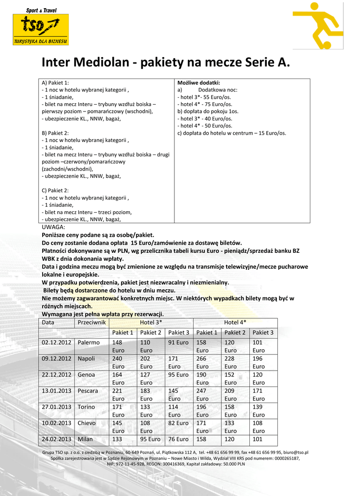 Inter Mediolan - pakiety na mecze Serie A. A) Pakiet 1: - 1 noc w hotelu wybranej kategorii , - 1 śniadanie, - bilet na mecz Interu – trybuny wzdłuż boiska – pierwszy poziom – pomarańczowy (wschodni), - ubezpieczenie KL., NNW, bagaż, B) Pakiet 2: - 1 noc w hotelu wybranej kategorii , - 1 śniadanie, - bilet na mecz Interu – trybuny wzdłuż boiska – drugi poziom –czerwony/pomarańczowy (zachodni/wschodni), - ubezpieczenie KL., NNW, bagaż, Możliwe dodatki: a) Dodatkowa noc: - hotel 3*- 55 Euro/os. - hotel 4* - 75 Euro/os. b) dopłata do pokoju 1os. - hotel 3* - 40 Euro/os. - hotel 4* - 50 Euro/os. c) dopłata do hotelu w centrum – 15 Euro/os. C) Pakiet 2: - 1 noc w hotelu wybranej kategorii , - 1 śniadanie, - bilet na mecz Interu – trzeci poziom, - ubezpieczenie KL., NNW, bagaż, UWAGA: Poniższe ceny podane są za osobę/pakiet. Do ceny zostanie dodana opłata 15 Euro/zamówienie za dostawę biletów. Płatności dokonywane są w PLN, wg przelicznika tabeli kursu Euro - pieniądz/sprzedaż banku BZ WBK z dnia dokonania wpłaty. Data i godzina meczu mogą być zmienione ze względu na transmisje telewizyjne/mecze pucharowe lokalne i europejskie. W przypadku potwierdzenia, pakiet jest niezwracalny i niezmienialny. Bilety będą dostarczone do hotelu w dniu meczu. Nie możemy zagwarantować konkretnych miejsc. W niektórych wypadkach bilety mogą być w różnych miejscach. Wymagana jest pełna wpłata przy rezerwacji. Data Przeciwnik Hotel 3* Hotel 4* 02.12.2012 Palermo 09.12.2012 Napoli 22.12.2012 Genoa 13.01.2013 Pescara 27.01.2013 Torino 10.02.2013 Chievo 24.02.2013 Milan Pakiet 1 Pakiet 2 Pakiet 3 Pakiet 1 Pakiet 2 Pakiet 3 148 Euro 240 Euro 164 Euro 221 Euro 171 Euro 145 Euro 133 110 Euro 202 Euro 127 Euro 183 Euro 133 Euro 108 Euro 95 Euro 91 Euro 158 Euro 266 Euro 190 Euro 247 Euro 196 Euro 171 Euro 158 120 Euro 228 Euro 152 Euro 209 Euro 158 Euro 133 Euro 120 101 Euro 196 Euro 120 Euro 171 Euro 139 Euro 108 Euro 101 171 Euro 95 Euro 145 Euro 114 Euro 82 Euro 76 Euro Grupa TSO sp. z o.o. z siedzibą w Poznaniu, 60-649 Poznań, ul. Piątkowska 112 A, tel. +48 61 656 99 99, fax +48 61 656 99 95, [email protected] Spółka zarejestrowana jest w Sądzie Rejonowym w Poznaniu – Nowe Miasto i Wilda, Wydział VIII KRS pod numerem: 0000265187, NIP: 972-11-45-928, REGON: 300416369, Kapitał zakładowy: 50.000 PLN Euro 10.03.2013 Bologna 30.03.2013 Juventus 07.04.2013 Atalanta 21.04.2013 Parma 08.05.2013 Lazio 19.05.2013 Udinese 135 Euro 183 Euro 158 Euro 135 Euro 171 Euro 171 Euro 97 Euro 78 Euro 145 Euro 120 Euro 97 Euro 120 Euro 95 Euro 133 Euro 133 Euro 114 Euro 114 Euro 78 Euro Euro Euro Euro 158 Euro 209 Euro 183 Euro 158 Euro 196 Euro 196 Euro 120 Euro 171 Euro 145 Euro 120 Euro 158 Euro 158 Euro 101 Euro 145 Euro 120 Euro 101 Euro 139 Euro 139 Euro Grupa TSO sp. z o.o. z siedzibą w Poznaniu, 60-649 Poznań, ul. Piątkowska 112 A, tel. +48 61 656 99 99, fax +48 61 656 99 95, [email protected] Spółka zarejestrowana jest w Sądzie Rejonowym w Poznaniu – Nowe Miasto i Wilda, Wydział VIII KRS pod numerem: 0000265187, NIP: 972-11-45-928, REGON: 300416369, Kapitał zakładowy: 50.000 PLN