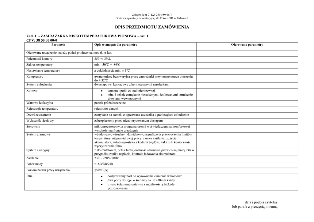 Załącznik nr 2- DZ-2501/59/15/1 Dostawa aparatury laboratoryjnej do PIWet-PIB w Puławach OPIS PRZEDMIOTU ZAMÓWIENIA Zad. 1 - ZAMRAŻARKA NISKOTEMPERATUROWA PIONOWA – szt. 1 CPV: 38 50 00 00-0 Parametr Opis wymagań dla parametru Oferowane parametry Oferowane urządzenie: należy podać producenta, model, nr kat. Pojemność komory 850 +/-3%L Zakres temperatury min. -50ºC ÷ -86ºC Nastawianie temperatury z dokładnością min. ± 1ºC Kompresory gwarantujące bezawaryjną pracę zamrażarki przy temperaturze otoczenia do + 32ºC dwuetapowy, kaskadowy z hermetycznymi sprężarkami System chłodzenia Warstwa izolacyjna komora i półki ze stali nierdzewnej min. 4 sekcje zamykane niezależnymi, izolowanymi termicznie drzwiami wewnętrznymi panele próżnioszczelne Rejestracja temperatury rejestrator danych Drzwi zewnętrzne zamykane na zamek, z ogrzewaną uszczelką ograniczającą oblodzenie Wyłącznik sieciowy zabezpieczony przed nieautoryzowanym dostępem Sterownik Zasilanie mikroprocesorowy, z programatorem i wyświetlaczem na komfortowej wysokości na froncie urządzenia wbudowany, wizualny i dźwiękowy, sygnalizacja przekroczenia limitów temperatury, nieprawidłowej pracy, zaniku zasilania, zużycia akumulatora, autodiagnostyka z kodami błędów, wskaźnik konieczności wyczyszczenia filtra z akumulatorem, pełna funkcjonalność alarmowa przez co najmniej 24h w przypadku zaniku napięcia, kontrola ładowania akumulatora 230 ~ 250V/50Hz Pobór mocy ≤18 kWh/24h Poziom hałasu pracy urządzenia ≤50dB(A) Komora System alarmowy System awaryjny Inne podgrzewany port do wyrównania ciśnienia w komorze dwa porty dostępu o średnicy ok. 20-30mm każdy trwałe koła samonastawne z możliwością blokady i poziomowania .…………………………… data i podpis czytelny lub parafa z pieczęcią imienną Załącznik nr 2- DZ-2501/59/15/1 Dostawa aparatury laboratoryjnej do PIWet-PIB w Puławach Wyposażenie wszystkie sekcje zamrażarki wyposażone w stelaże szufladowe na kriopudełka, w tym 2 sekcje ze stelażami na pidełka o wysokości 75mm, pozostałe sekcje ze stelażami na pudełka o wysokości 50mm. Pozostałe wymiary pudełek – ok. 131x131mm. Pozostałe gwarancja: min. 24 miesiące instrukcja w języku polskim montaż, instalacja, pierwsze uruchomienie i szkolenie personelu w miejscu użytkowania serwis na terenie Polski – bezpłatny w okresie gwarancji, serwis pogwarancyjny czas reakcji serwisu w przypadku awarii: do 48 godzin Przez „czas reakcji” należy rozumieć czas, w którym serwisant, po otrzymaniu zgłoszenia, stawi się w siedzibie końcowego użytkownika i przystąpi do niezwłocznego usunięcia usterek. Zad. 2 – POMPA PRÓŻNIOWA – szt. 1 CPV: 38 50 00 00-0 Parametr Opis wymagań dla parametru Oferowane parametry Oferowane urządzenie: należy podać producenta, model, nr kat. Pompa próżniowa typ GLD-136a lub równoważna dedykowana liofilizatorowi firmy Edwards z zapasem oleju Parametry pompy jednostka 60HZ rzeczywista prędkość pompowania – min. 135-162 L/min; 8.109.72 m3/h; CFM 4.77-5.72; ciśnienie zamknięcia - max 0.67Pa; ciśnienie otwarcia – max 6.7 Pa; pojemność – min. 1L; optymalna temp. pracy – min. 7-40C; ciężar – 20 kg+/- 3kg; wymiary – 170x485x240mm +/- 15mm; zasilanie – trójfazowe; 400W; 200-240V; olej – SMR-100 Pozostałe gwarancja: min. 12 miesięcy instrukcja obsługi w języku polskim lub angielskim montaż, instalacja, pierwsze uruchomienie i szkolenie personelu w miejscu użytkowania serwis na terenie Polski czas reakcji serwisu w przypadku awarii: do 72 godzin Przez „czas reakcji” należy rozumieć czas, w którym serwisant, po otrzymaniu zgłoszenia, stawi się w siedzibie końcowego użytkownika i przystąpi do niezwłocznego usunięcia usterek. .…………………………… data i podpis czytelny lub parafa z pieczęcią imienną Załącznik nr 2- DZ-2501/59/15/1 Dostawa aparatury laboratoryjnej do PIWet-PIB w Puławach Zad. 3 – MIKROSKOP FLUORESCENCYJNY – szt. 1 CPV: 38 50 00 00-0 Parametr Opis wymagań dla parametru Oferowane parametry Oferowane urządzenie: należy podać producenta, model, nr kat. Mikroskop optyczny odwrócony o budowie modułowej stabilny statyw z odseparowanym modułem zasilacza wyposażonym w pokrętło regulacji mocy światła wyposażony w co najmniej dwa porty optyczne (jeden dla nasadki okularowej i jeden dla kamer) odchylany słupek oświetlacza do łatwej zmiany preparatów współosiowe śruby ustawiania ostrości widzenia m z regulacją oporu ruchu, zakres dokładności ruchu w osi Z – min. 1um oświetlenie do światła przechodzącego z lampą halogenową – min. 100W płynna regulacja natężenia światła, wyłącznik umieszczony w łatwo dostępnym miejscu na statywie mikroskopu obok śrub regulacji ostrości widzenia filtry do światła przechodzącego: konwersyjny - światła dziennego, neutralny szary, matówka kondensor tarczowy, wielogniazdowy skonfigurowany do jasnego pola, kontrastu Hoffmana i kontrastu Nomarskiego DIC soczewka kondensora pozwalająca na pracę w technice kontrastu Hoffmana i kontrastu Nomarskiego DIC, odległość robocza soczewki nie mniejsza niż 44 mm; możliwość montażu mikromanipulatorów kontrast Hoffmana dla obiektywów 10x, 20x miska obiektywowa rewolwerowa, sześciogniazdowa do DIC Stolik mikroskopu o wymiarach min. 260x300 mm i zakresie przesuwu min. 126x84 mm Uchwyt uniwersalny dający możliwość obserwowania różnych szalek Petriego, preparatów klasycznych 1x3” oraz butli i szalek hodowlanych sterowanie stołem z prawej strony z pokrętłem przegubowym, pionowym nasadka okularowa dwuoczna z regulacją rozstawienia okularów, pochylenie linii okularów najwyżej 30 stopni od linii poziomej odcinacz światła (shutter) wbudowany w nasadkę okularową soczewka Bertranda z regulacją ostrości (do regulacji ustawień mikroskopu) wbudowana w nasadkę okularową moduł fluorescencji z miejscem do monta