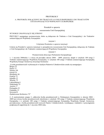 PROTOKOŁY A. PROTOKÓŁ DOŁĄCZONY DO TRAKTATU O UNII EUROPEJSKIEJ I DO TRAKTATÓW USTANAWIAJĄCYCH WSPÓLNOTY EUROPEJSKIE Protokół w sprawie rozszerzenia Unii Europejskiej WYSOKIE UMAWIAJĄCE SIĘ STRONY PRZYJĘŁY następujące postanowienia, które są dołączone do Traktatu o Unii Europejskiej i do Traktatów ustanawiających Wspólnoty Europejskie: Artykuł 1 Uchylenie Protokołu w sprawie instytucji Uchyla się Protokół w sprawie instytucji w perspektywie rozszerzenia Unii Europejskiej, dołączony do Traktatu o Unii Europejskiej i do Traktatów ustanawiających Wspólnoty Europejskie. Artykuł 2 Postanowienia dotyczące Parlamentu Europejskiego 1. 1 stycznia 2004roku i z mocą od początku okresu 2004 – 2009, pierwszy akapit w artykule 190 ustęp 2 Traktatu ustanawiającego Wspólnotę Europejską i w artykule 108 ustęp 2 Traktatu ustanawiającego Europejską Wspólnotę Energii Atomowej otrzymuje brzmienie: „Liczbę przedstawicieli wybieranych w każdym Państwie Członkowskim ustala się następująco: Belgia 22 Dania 13 Niemcy 99 Grecja 22 Hiszpania 50 Francja 72 Irlandia 12 Włochy 72 Luksemburg 6 Niderlandy 25 Austria 17 Portugalia 22 Finlandia 13 Szwecja18 Zjednoczone Królestwo 72” 2. Z zastrzeżeniem ustępu 3, całkowita liczba przedstawicieli w Parlamencie Europejskim w okresie 2004 – 2009 jest równa liczbie przedstawicieli określonej w artykule 190 ustęp 2 Traktatu ustanawiającego Wspólnotę Europejską i w artykule 108 ustęp 2 Traktatu ustanawiającego Europejską Wspólnotę Energii Atomowej, powiększonej o liczbę przedstawicieli nowych Państw Członkowskich, wynikającą z traktatów o przystąpieniu podpisanych najpóźniej do 1 stycznia 2004 roku. 3. Jeżeli całkowita liczba członków określona w ustępie 2 jest mniejsza niż 732, stosuje się korektę proporcjonalną do liczby przedstawicieli wybieranych w każdym Państwie Członkowskim tak, aby całkowita liczba była jak najbardziej zbliżona do 732. Korekta taka nie może prowadzić do zwiększenia liczby przedstawicieli wybieranych w każdym Państwie Członkowskim ponad liczbę określoną w artykule 190 ustęp 2 Traktatu ustanawiającego Wspólnotę Europejską oraz w artykule 108 ustęp 2 Traktatu ustanawiającego Europejską Wspólnotę Energii Atomowej w odniesieniu do okresu 2004 – 2009. Rada przyjmuje w tym celu decyzję. 4. Na zasadzie odstępstwa od drugiego akapitu artykułu 189 Traktatu ustanawiającego Wspólnotę Europejską i drugiego akapitu artykułu 107 ustęp 2 Traktatu ustanawiającego Europejską Wspólnotę Energii Atomowej, w przypadku wejścia w życie traktatów o przystąpieniu po przyjęciu przez Radę decyzji określonej w drugim akapicie ustępu 3 niniejszego artykułu, liczba członków Parlamentu Europejskiego może na okres stosowania tej decyzji tymczasowo przekroczyć 732. W odniesieniu do liczby przedstawicieli wybieranych w danych Państwach Członkowskich stosuje się taką samą korektę, jak określona w pierwszym akapicie ustępu 3 niniejszego artykułu. Artykuł 3 Postanowienia dotyczące ważenia głosów w Radzie 1. 1 stycznia 2005 roku: a) w artykule 205 Traktatu ustanawiającego Wspólnotę Europejską i w artykule 118 Traktatu ustanawiającego Europejską Wspólnotę Energii Atomowej: i) ustęp 2 otrzymuje brzmienie: „2. Jeżeli przyjęcie uchwały przez Radę wymaga większości kwalifikowanej, głosy jej członków ważone są następująco: Belgia 12 Dania 7 Niemcy 29 Grecja 12 Hiszpania 27 Francja 29 Irlandia 7 Włochy 29 Luksemburg 4 Niderlandy 13 Austria 10 Portugalia 12 Finlandia 7 Szwecja 10 Zjednoczone Królestwo 29 Uchwały Rady wymagają do ich przyjęcia co najmniej 169 głosów „za”, oddanych przez większość członków, jeżeli niniejszy Traktat wymaga, aby były przyjęte na wniosek Komisji. W innych przypadkach uchwały Rady wymagają do ich przyjęcia co najmniej 169 głosów „za”, oddanych przez co najmniej dwie trzecie członków.” ii) dodaje się ustęp 4 w brzmieniu: „4. Jeżeli decyzja ma zostać przyjęta przez Radę większością kwalifikowaną, członek Rady może zażądać sprawdzenia, czy Państwa Członkowskie stanowiące większość kwalifikowaną, reprezentują co najmniej 62% ogółu ludności Unii. Jeżeli okaże się, że warunek ten nie został spełniony, dana decyzja nie zostanie przyjęta.” b) w artykule 23 ustęp 2 Traktatu o Unii Europejskiej, trzeci akapit otrzymuje brzmienie: „Głosy członków Rady ważone są zgodnie z artykułem 205 ustęp 2 Traktatu ustanawiającego Wspólnotę Europejską. Decyzje wymagają do ich przyjęcia co najmniej 169 głosów „za”, oddanych przez co najmniej dwie trzecie członków. Jeżeli decyzja ma zostać przyjęta przez Radę większością kwalifikowaną, członek Rady może zażądać sprawdzenia, czy Państwa Członkowskie stanowiące większość kwalifikowaną, reprezentują co najmniej 62% ogółu ludności Unii. Jeżeli okaże się, że warunek ten nie został spełniony, dana decyzja nie zostanie przyjęta.” c) w artykule 34 Traktatu o Unii Europejskiej, ustęp 3 otrzymuje brzmienie: „3. Jeżeli przyjęcie uchwały przez Radę wymaga większości kwalifikowanej, głosy jej członków ważone są zgodnie z artykułem 205 ustęp 2 Traktatu ustanawiającego Wspólnotę Europejską. Uchwały Rady wymagają do ich przyjęcia co najmniej 169 głosów „za”, oddanych przez co najmniej dwie trzecie członków. Jeżeli decyzja ma zostać przyjęta przez Radę większością kwalifikowaną, członek Rady może zażądać sprawdzenia, czy Państwa Członkowskie stanowiące większość kwalifikowaną, reprezentują co najmniej 62% ogółu ludności Unii. Jeżeli okaże się, że warunek ten nie został spełniony, dana decyzja nie zostanie przyjęta.” 2. W chwili każdego przystąpienia, próg ustalony w drugim akapicie artykułu 205 ustęp 2 Traktatu ustanawiającego Wspólnotę Europejską i w drugim akapicie artykułu 118 ust
