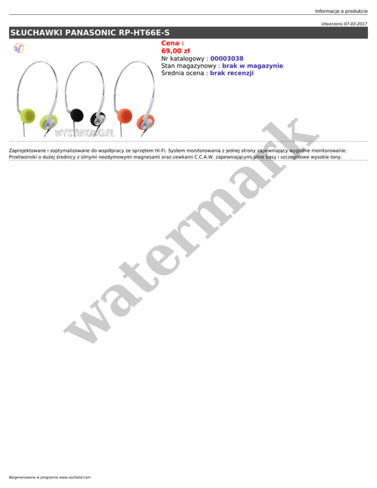 Informacje o produkcie Utworzono 07-03-2017 SŁUCHAWKI PANASONIC RP-HT66E-S Cena : 69,00 zł er m ar k Nr katalogowy : 00003038 Stan magazynowy : brak w magazynie Średnia ocena : brak recenzji w at Zaprojektowane i zoptymalizowane do współpracy ze sprzętem Hi-Fi. System monitorowania z jednej strony zapewniający wygodne monitorowanie. Przetworniki o dużej średnicy z silnymi neodymowymi magnesami oraz cewkami C.C.A.W. zapewniającymi silne basy i szczegółowe wysokie tony. Wygenerowano w programie www.oscGold.com