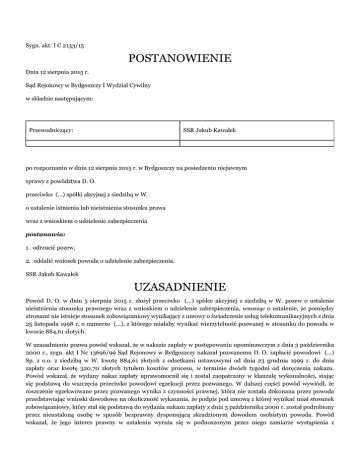 Sygn. akt: I C 2133/15 POSTANOWIENIE Dnia 12 sierpnia 2015 r. Sąd Rejonowy w Bydgoszczy I Wydział Cywilny w składzie następującym: Przewodniczący: SSR Jakub Kawałek po rozpoznaniu w dniu 12 sierpnia 2015 r. w Bydgoszczy na posiedzeniu niejawnym sprawy z powództwa D. O. przeciwko (...) spółki akcyjnej z siedzibą w W. o ustalenie istnienia lub nieistnienia stosunku prawa wraz z wnioskiem o udzielenie zabezpieczenia postanawia: 1. odrzucić pozew, 2. oddalić wniosek powoda o udzielenie zabezpieczenia. SSR Jakub Kawałek UZASADNIENIE Powód D. O. w dniu 5 sierpnia 2015 r. złożył przeciwko (...) spółce akcyjnej z siedzibą w W. pozew o ustalenie nieistnienia stosunku prawnego wraz z wnioskiem o udzielenie zabezpieczenia, wnosząc o ustalenie, że pomiędzy stronami nie istnieje stosunek zobowiązaniowy wynikający z umowy o świadczenie usług telekomunikacyjnych z dnia 25 listopada 1998 r, o numerze (...), z którego miałaby wynikać wierzytelność pozwanej w stosunku do powoda w kwocie 884,61 złotych. W uzasadnieniu pozwu powód wskazał, że w nakazie zapłaty w postępowaniu upominawczym z dnia 3 października 2000 r., sygn. akt I Nc 13696/99 Sąd Rejonowy w Bydgoszczy nakazał pozwanemu D. O. zapłacić powodowi (...) Sp. z o.o. z siedzibą w W. kwotę 884,61 złotych z odsetkami ustawowymi od dnia 23 grudnia 1999 r. do dnia zapłaty oraz kwotę 320,70 złotych tytułem kosztów procesu, w terminie dwóch tygodni od doręczenia nakazu. Powód wskazał, że wydany nakaz zapłaty uprawomocnił się i został zaopatrzony w klauzulę wykonalności, stając się podstawą do wszczęcia przeciwko powodowi egzekucji przez pozwanego. W dalszej części powód wywiódł, że roszczenie egzekwowane przez pozwanego wynika z czynności prawnej, która nie została dokonana przez powoda przedstawiając wnioski dowodowe na okoliczność wykazania, że podpis pod umową z której wynikać miał stosunek zobowiązaniowy, który stał się podstawą do wydania nakazu zapłaty z dnia 3 października 2000 r. został podrobiony przez nieustaloną osobę w sposób bezprawny dysponującą skradzionym dowodem osobistym powoda. Powód wskazał, że jego interes prawny w ustaleniu wyraża się w podnoszonym przez niego zamiarze wystąpienia z powództwem przeciwegzekucyjnym w oparciu o przepis art. 840 par. 1 pkt 2 k.p.c. Powód podniósł, że z przyczyn niezależnych od siebie nie wniósł sprzeciwu od wydanego nakazu zapłaty. Do pozwu dołączono odpis pozwu w sprawie I Nc 13696/99 z którego wynika, że powód w tamtym postępowaniu – (...) Sp. z o.o. z siedzibą w W., wniósł o zasądzenie od pozwanego D. O. kwoty 884,61 zł z ustawowymi odsetkami od dnia wniesienia pozwu do dnia zapłaty wraz z kosztami postępowania. Z treści pozwu i jego załączników wynikało, iż podstawą faktyczną powództwa jest podnoszona okoliczność, iż strony zawarły umowę o świadczenie usług telekomunikacyjnych z dnia 26 listopada 1998 r. nr (...) z której wynikła wierzytelność na łączną kwotę 884,61 złotych, składającą się z kwoty 733,11 zł z tytułu niezapłaconych faktur oraz skapitalizowanych odsetek. Do pozwu dołączono informację odpowiadającą odpisowi aktualnemu z rejestru przedsiębiorców nr KRS (...) z której wynika, że (...) spółka akcyjna z siedzibą w W. powstała w wyniku przekształcenia (...) spółki z ograniczoną odpowiedzialnością z siedzibą w W. w spółkę akcyjną zgodnie z uchwałą zgromadzenia wspólników z dnia 1 lipca 2011 r. Sąd ustalił i zważył, co następuje: W ocenie Sądu w niniejszej sprawie zachodzi tożsamość przedmiotowa powództwa o spełnienie świadczenia w sprawie o sygn. I Nc 13696/99 i powództwa o ustalenie istnienia lub nieistnienia stosunku prawnego, z którego wynikało roszczenie zasądzone w tym postępowaniu, wytoczonego w niniejszej sprawie. Sąd miał na uwadze, ujawnione w orzecznictwie rozbieżności co do przyjmowania tożsamości roszczeń o spełnienie określonego świadczenia oraz o ustalenia istnienia lub nieistnienia stosunku prawego, z którego świadczenie to wynika. Szczegółowo i całościowo zapoznał się z dorobkiem orzeczniczym opierającym się na poglądzie, iż tożsamość taka nie zachodzi - bowiem powództwo o świadczenie i powództwo o ustalenie obejmują różne żądania, a rozstrzygnięcia sądu mają odmienne charaktery oraz judykatami opartymi na koncepcji wskazującej na istnienie tożsamości przedmiotowej takich roszczeń, z uwagi na fakt, iż kwestia ustalenia istnienia stosunku prawnego stanowi przesłankę rozstrzygnięcia w przedmiocie spełnienia świadczenia. W ocenie Sądu pogłębiona analiza zagadnienia prowadzić musi do wniosku, iż prawidłowym poglądem, opartym o właściwą interpretacje zarówno art. 199 par. 1 pkt 2 k.p.c., jak i art. 379 pkt 3 k.p.c. jest pogląd drugi. Pogląd pierwszy wychodzi od odmienności żądań w obu procesach, kładąc szczególną uwagę na okoliczności, iż kwestia przesłankowości ustalenia dla rozstrzygnięcia o świadczeniu ma znaczenie dla istnienia interesu prawnego (art. 189 k.p.c.), a nie dla oceny jednakowości żądań na gruncie art. 199 par. 1 pkt 2 k.p.c. W orzecznictwie Sądu Najwyższego odwołania do tego poglądu odnaleźć można m.in. w postanowieniu Sądu Najwyższego z dnia 7 grudnia 2005 r., V CK 277/05, LEX nr 602316, w którym przyznano co prawda, iż „żądanie zasądzenia mieści w sobie implicite żądanie ustalenia”, jednak równocześnie stwierdzono, iż „to ostatnie rozstrzygane jest tylko przesłankowo i nie znajduje wyrazu w sentencji wyroku”, czy też wyroku Sądu Najwyższego z dnia 4 grudnia 1998 r., III CKN 56/98, LEX nr 35754, w którym odwołano się do powszechnego rozumienia zwrotu „to samo” użytego w art. 199 par. 1 pkt 2 k.p.c. (>> (…) "roszczenie" w wyrażeniu "to samo roszczenie" rozumiane jest powszechnie jako roszczenie w sensie procesowym <<). Powyższe poglądy zdobyły