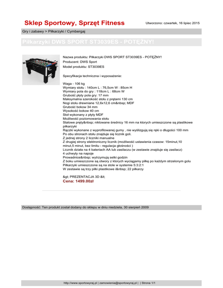 Sklep Sportowy, Sprzęt Fitness Utworzono: czwartek, 16 lipiec 2015 Gry i zabawy > Piłkarzyki / Cymbergaj Piłkarzyki DWS SPORT ST3039ES - POTĘŻNY! Nazwa produktu: Piłkarzyki DWS SPORT ST3039ES - POTĘŻNY! Producent: DWS Sport Model produktu: ST3039ES Specyfikacja techniczna i wyposażenie: Waga - 106 kg Wymiary stołu : 140cm L : 76,5cm W : 85cm H Wymiary pola do gry : 118cm L : 68cm W Grubość płyty pola gry: 17 mm Maksymalna szerokość stołu z prętami 130 cm Nogi stołu drewniane 12,6x12,6 cm MDF Grubość bokow 34 mm Wysokość bokow 40 cm Stoł wykonany z płyty MDF Możliwość poziomowania stołu Stalowe pręty niklowane średnicy 16 mm na ktorych umieszczone są plastikowe piłkarzyki Rączki wykonane z wyprofilowanej gumy , nie wyślizgują się ręki o długości 100 mm Po obu stronach stołu znajduje się licznik goli. Z jednej strony 2 liczniki manualne Z drugiej strony elektroniczny licznik (możliwość ustawienia czasow: 15minut,10 minut,5 minut, bez limitu - regulacja głośności ) Licznik działa na 4 bateriach AA lub zasilaczu (w zestawie znajduje się zasilacz) 4 uchwyty na napoje Prowadnice wytrzymują setki godzin Z boku umieszczone są otwory z ktorych wyciągamy piłkę po każdym strzelonym golu Piłkarzyki umieszczone są na stole w systemie 5:3:2:1 W zestawie są trzy piłki plastikowe i 22 piłkarzy > PREZENTACJA 3D < Cena: 1499.00zł Dostępność: Ten produkt został dodany do sklepu w dniu niedziela, 30 sierpień 2009 http://www.sportowyraj.pl | [email protected] | | Strona 1/1