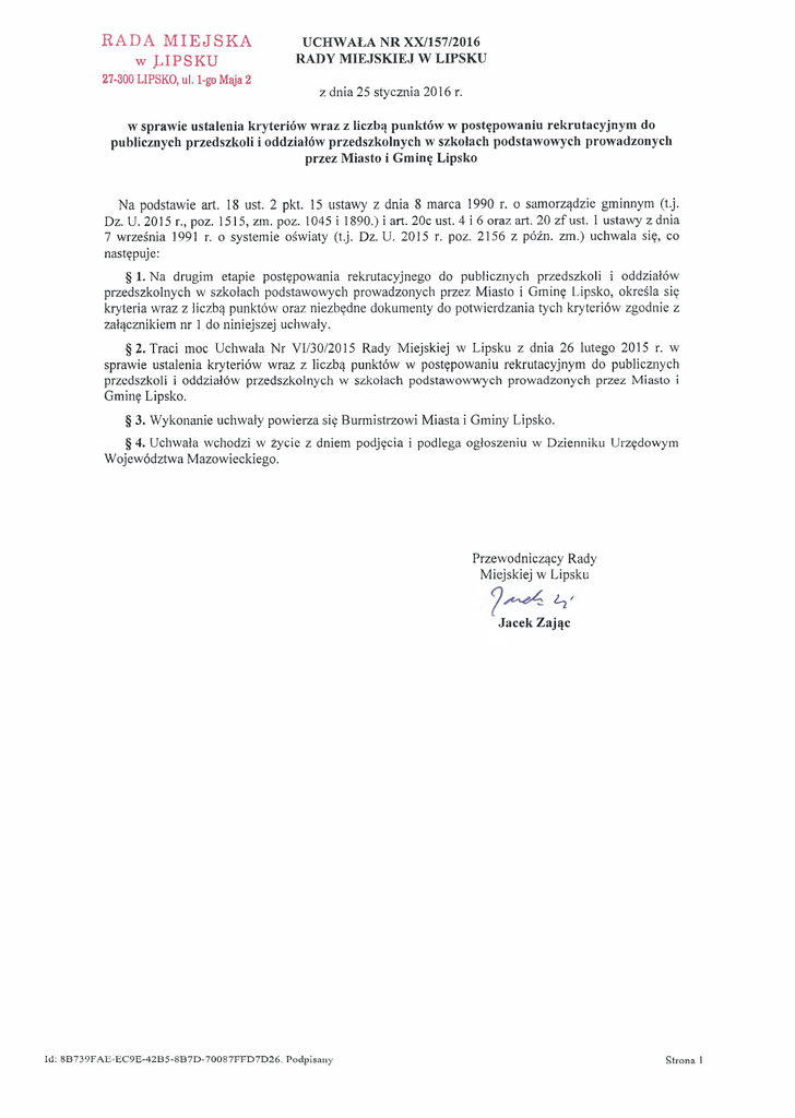 RADA M IEJSKA w L IP S KU /157/2016 R A D Y M IE JSK IE J W L IPSK U uchw ała nr xx 27-300 LIPSKO, ul. 1-go Mąja 2 z dnia 25 stycznia 2016 r. w spraw ie ustalenia k ryteriów w raz z liczbą punktów w postępow aniu rekrutacyjnym do publicznych p rzedszkoli i oddziałów przedszkolnych w szkołach podstaw ow ych prow adzonych przez M iasto i G m inę Lipsko N a podstaw ie art. 18 ust. 2 pkt. 15 ustaw y z dnia 8 m arca 1990 r. o sam orządzie gm innym (t.j. Dz. U. 2015 r., poz. 1515, zm. poz. 1045 i 1890.) i art. 20c ust. 4 i 6 oraz art. 20 z f ust. 1 ustaw y z dnia 7 w rześnia 1991 r. o system ie ośw iaty (t.j. Dz. U. 2015 r. poz. 2156 z późn. zm .) uchw ala się, co następuje: § 1. N a drugim etapie postępow ania rekrutacyjnego do publicznych przedszkoli i oddziałów przedszkolnych w szkołach podstaw ow ych prow adzonych przez M iasto i G m inę Lipsko, określa się kryteria w raz z liczbą punktów oraz niezbędne dokum enty do potw ierdzania tych kryteriów zgodnie z załącznikiem nr 1 do niniejszej uchw ały. § 2. Traci m oc U chw ała N r V I/3 0 /2 015 Rady M iejskiej w Lipsku z dnia 26 lutego 2015 r. w spraw ie ustalenia kryteriów w raz z liczbą punktów w postępow aniu rekrutacyjnym do publicznych przedszkoli i oddziałów przedszkolnych w szkołach podstaw ow w ych prow adzonych przez M iasto i G m inę Lipsko. § 3. W ykonanie uchw ały pow ierza się Burm istrzow i M iasta i G m iny Lipsko. § 4. U chw ała w chodzi w życie z dniem podjęcia i podlega ogłoszeniu w D zienniku U rzędow ym W ojew ództw a M azow ieckiego. Przew odniczący Rady M iejskiej w Lipsku L^ r Jacek Zając Id: 8 B 7 3 9 F A E -E C 9 E -4 2 B 5 -8 B 7 D -7 0 0 8 7 F F D 7 D 2 6 . P o d p isan y S tr o n a 1 RADA MIEJSKA w LIPSKU Załącznik do U chw ały N r X X /157/2016 27-300 LIPSKO, ul. 1-go Maja 2 Rady M iejskiej w Lipsku z dnia 25 stycznia 2016 r. KRYTERIA ORGANU PROWADZĄCEGO WRAZ Z LICZBĄ PUNKTÓW BRANE POD UWAGĘ NA DRUGIM ETAPIE POSTĘPOWANIA REKRUTACYJNEGO 30 D ziecko sześcioletn ie objęte obow iązkow ym rocznym przygotowaniem przedszkolnym oraz dziecko z odroczonym obow iązkiem szkolnym . D ziecko sześcioletnie lub pięcioletnie ubiegające się o przyjęcie do przedszkola lub oddziału przedszkolnego w szkole podstawowej położonej w odległości do 3 km od m iejsca zam ieszkania D ziecko z rodziny objętej nadzorem kuratorskim D zieci, które mają ustaw ow e prawo do korzystania z w ychow ania przedszkolnego D ziecko, którego oboje rodzice/opiekunow ie prawni pracują, wykonują pracę na podstawie um ow y cywilnoprawnej, uczą się w trybie dziennym , prowadzą gospodarstwo rolne lub działalność gospodarczą D zieci 3 letnie, które na dzień 01 września mają ukończone 3 lata. 5 25 15 5 5 II. D O K U M E N T Y P O T W IE R D Z A JĄ C E SPE Ł N IA N IE PR Z E Z K A N D Y D A T A K R Y T E R IÓ W O R G A N U PR O W A D Z A C E G O 1) W niosek zgłoszeniow y, 2) O św iadczenie o zam ieszkaniu dziecka w odległości do 3 km od przedszkola lub szkoły podstaw ow ej z oddziałam i przedszkolnym i, do której ubiega się o przyjęcie. 3) O rzeczenie sądu rodzinnego ustanaw iające nadzór kuratora lub jeg o kopia, 4) W niosek zgłoszeniow y 5) Z aśw iadczenie pracodaw cy o zatrudnieniu albo zaśw iadczenie o w ykonyw aniu pracy na podstaw ie um ow y cyw ilnopraw ne, - Z aśw iadczenie szkoły/uczelni potw ierdzające naukę w trybie dziennym . - W ydruk ze strony internetow ej Centralnej Ew idencji i Inform acji o D ziałalności G ospodarczej albo inform acja z K rajow ego Rejestru Sądow ego. - Z aśw iadczenie o prow adzeniu gospodarstw a rolnego z KRUS. 6) W niosek zgłoszeniow y. Przew odniczący Rady M iejskiej w Lipsku Jacek Z ając Id: 8B739FAE-EC9E-42B5-8B7D-70087FFD7D26. Podpisany S tro n a 1