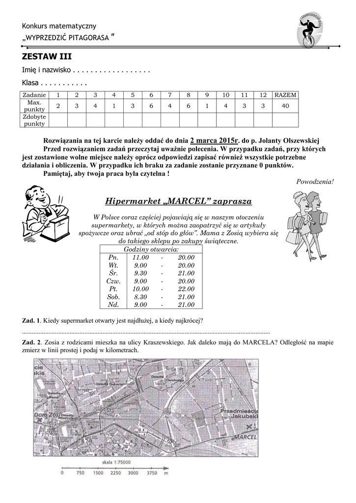 Konkurs matematyczny „WYPRZEDZIC PITAGORASA ” ZESTAW III Imię i nazwisko . . . . . . . . . . . . . . . . . . Klasa . . . . . . . . . . . Zadanie Max. punkty Zdobyte punkty 1 2 3 4 5 6 7 8 9 10 11 12 RAZEM 2 3 4 1 3 6 4 6 1 4 3 3 40 Rozwiązania na tej karcie należy oddać do dnia 2 marca 2015r. do p. Jolanty Olszewskiej Przed rozwiązaniem zadań przeczytaj uważnie polecenia. W przypadku zadań, przy których jest zostawione wolne miejsce należy oprócz odpowiedzi zapisać również wszystkie potrzebne działania i obliczenia. W przypadku ich braku za zadanie zostanie przyznane 0 punktów. Pamiętaj, aby twoja praca była czytelna ! Powodzenia! Hipermarket „MARCEL” zaprasza W Polsce coraz częściej pojawiają się w naszym otoczeniu supermarkety, w których można zaopatrzyć się w artykuły spożywcze oraz ubrać „od stóp do głów”. Mama z Zosią wybiera się do takiego sklepu po zakupy świąteczne. Godziny otwarcia: Pn. 11.00 20.00 Wt. 9.00 20.00 Śr. 9.30 21.00 Czw. 9.00 20.00 Pt. 10.00 22.00 Sob. 8.30 21.00 Nd. 9.00 21.00 Zad. 1. Kiedy supermarket otwarty jest najdłużej, a kiedy najkrócej? ....................................................................................................................................................... Zad. 2. Zosia z rodzicami mieszka na ulicy Kraszewskiego. Jak daleko mają do MARCELA? Odległość na mapie zmierz w linii prostej i podaj w kilometrach. Miejsce na obliczenia: odległość na mapie ................ odległość rzeczywista ...................... Odpowiedź: Poniższe tabele przedstawiają rozkład jazdy z przystanku początkowego i czas przejazdu autobusu. Zad. 3. a) Oblicz czas przejazdu z przystanku przy domu Zosi do MARCELA. Obliczenia: Odpowiedź: b) Autobus ma przy supermarkecie 15 min przerwy i jedzie w powrotną drogę. O której godzinie najpóźniej (jadąc ostatnim autobusem ) Zosia będzie na przystanku koło domu. Obliczenia: Odpowiedź: Zad. 4. Mama z Zosią mają się spotkać z tatą przy MARCELU o godz. 16.00. Którym autobusem muszą wyjechać z przystanku najbliżej domu, aby jak najkrócej czekać na tatę? Podaj godzinę odjazdu autobusu z przystanku początkowego. Obliczenia: Odpowiedź: Zad. 5. Mama z Zosią idą pieszo do przystanku autobusowego 7 min. Jaką część drogi do MARCELA pokonują pieszo, a jaką autobusem? Ile czasu zajmuje im cała droga? Obliczenia: Odpowiedź: Zad. 6. W środę przyjedzie do Zosi wujek z Gdańska. Mama chciała na kolację zrobić sałatkę, którą wujek bardzo lubi. Nie ma jednak wszystkich produktów. Musi więc kupić: 2 kg ziemniaków, majonez, 1 12 kg pieczarek oraz ogórki kiszone. a) Ile zapłaci za te produkty w sklepie MARCEL? Obliczenia: b) W którym supermarkecie otrzyma najwięcej reszty z 60 zł? Obliczenia: Udziel odpowiedzi na podstawie cen proponowanych przez poszczególne sklepy. Zad. 7. Na terenie sklepu znajdują się różne stoiska. Największą powierzchnię zajmuje dział spożywczy. Oblicz powierzchnię supermarketu, wiedząc, że 53 tej powierzchni to dział spożywczy zajmujący 1500 m 2 . Jaką powierzchnię zajmuje dział z zabawkami, jeśli stanowi Obliczenia: Odpowiedź: 1 3 działu spożywczego? Zad. 8. W piątek odbędzie się dyskoteka klasowa. Zosia zobowiązała się kupić napoje, ale nie wie ile. Butelka oranżady (1,5 l) kosztuje 0,79zł; Fanty (2,0 l) – 2,75zł. Na dyskotekę wybierają się 24 osoby. Dla każdej z nich zaplanowano po dwa kubki napoju o poj. 0,25 l ( po jednym kubku oranżady i Fanty) a) Ile butelek tańszego napoju należy kupić? Obliczenia: Odpowiedź: b) O ile więcej pieniędzy należy przeznaczyć na zakup tej samej ilości Fanty co oranżady? Obliczenia: Odpowiedź: Zad. 9. Zamień jednostki uzupełniając zdanie: 0,25 l to .............. dm 3 Zad. 10. Tato Zosi zarabia 1875zł, a mama przeznaczyła na zakupy 5 razy mniej. Ile pieniędzy postanowiła wydać na prezenty gwiazdkowe jeśli przeznaczyła na nie 13 tej kwoty? Obliczenia: Odpowiedź: Zad. 11. Zaznacz na osi liczbowej wydarzenia: a) wynalezienie margaryny przez Hipilita Mege-Mouries – 1869r. b) śmierć wynalazcy w Anglii – 1880r. c) 14 lat po odkryciu margaryny to - ................ Zad. 12. Rozwiąż krzyżówkę tematyczną.
