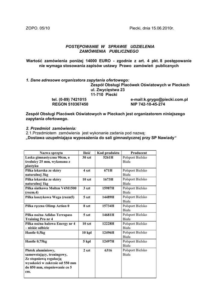 ZOPO. 05/10 Piecki, dnia 15.06.2010r. POSTĘPOWANIE W SPRAWIE UDZIELENIA ZAMÓWIENIA PUBLICZNEGO Wartość zamówienia poniżej 14000 EURO - zgodnie z art. 4 pkt. 8 postępowanie nie wymaga stosowania zapisów ustawy Prawo zamówień publicznych 1. Dane adresowe organizatora zapytania ofertowego: Zespół Obsługi Placówek Oświatowych w Pieckach ul. Zwycięstwa 23 11-710 Piecki tel. (0-89) 7421015 e-mail:[email protected] REGON 510367450 NIP 742-10-45-274 Zespół Obsługi Placówek Oświatowych w Pieckach jest organizatorem niniejszego zapytania ofertowego. 2. Przedmiot zamówienia: 2.1.Przedmiotem zamówienia jest wykonanie zadania pod nazwą: „Dostawa uzupełniająca wyposażenia do sali gimnastycznej przy SP Nawiady” Nazwa sprzętu Laska gimnastyczna 90cm, o średnicy 25 mm, wykonana z plastyku Piłka lekarska ze skóry naturalnej 3kg Piłka lekarska ze skóry naturalnej 1kg Piłka siatkowa Molten V4M1500 (rozm.4) Piłka koszykowa Wega (rozm5) Ilość 30 szt Kod produktu Producent Polsport Bielsko 5261H Biała 4 szt 671H 10 szt 1673H 3 szt 15987H 5 szt 14489H Piłka ręczna Olimp Action 0 8 szt 15734H Piłka nożna Adidas Terrapass Training Pro nr 4 Piłka nożna halowa Energy nr 4 – niskie odbicie Hantle 0,5kg 5 szt 14681H 10 szt 12228H 10 kpl 12496H Hantle 0,75kg 5 kpl 12497H Płotek aluminiowy, samowstający, treningowy, Ze stopniową regulacją wysokości w zakresie od 550 mm do 850 mm, stopniowanie co 5 cm. 2 szt 6316 Polsport Bielsko Biała Polsport Bielsko Biała Polsport Bielsko Biała Polsport Bielsko Biała Polsport Bielsko Biała Polsport Bielsko Biała Polsport Bielsko Biała Polsport Bielsko Biała Polsport Bielsko Biała Polsport Bielsko Biała kij do unihokeja Kij HOT SHOT 90 cm Mata do ćwiczeń 20 szt 14430H 20 szt 15664H Piłka gimnastyczna 55 cm. 10 szt 13006H Lustra do ćwiczeń 2x1m z poręczą i wspornikiem do poręczy Guma fitness (81290) kpl =3 szt 4 szt 8139 10 kpl 13693H Skakanka 300 cm, skóra naturalna drewniane rączki, średnica rzemienia 6 mm. Drabina gimnastyczna podwójna 3,00 x 1,80 Boki drabin z drewna iglastego, szczeble z drewna liściastego buk Drabina gimnastyczna pojedyncza 3,00 x 0,90 Boki drabin z drewna iglastego, szczeble z drewna liściastego buk Belka mocująca drabinki gimnastyczne, Wspornik mocujący drabinki do belki Wspornik mocujący drabinki do podłogi, Wspornik mocujący drabinki do ściany L-250 mm Polsport Bielsko Biała Polsport Bielsko Biała Polsport Bielsko Biała Polsport Bielsko Biała Polsport Bielsko Biała 8 szt. 5007H 2 sztuki Polsport Szamocin 1 sztuka Polsport Szamocin 5 mb 5-19 8 sztuk 5-54 8 sztuk 5-55 8 sztuk 5-56 Pesmenpol Trzemeśnia W powyższej tabelce kolumna – kod produktu , producent ma służyć ewentualnemu dostawcy jako źródło wiedzy o jaki produkt pyta się zamawiający i jaki chce otrzymać. Produkty dostarczone powinny spełniać wymagania norm i posiadać wymagane certyfikaty. 3. Termin realizacji usługi : Dostawa winna być wykonane w terminie do dnia 30.07.2010 r 4.Cena ofertowa - cena brutto za wykonanie przedmiotu zamówienia określonego w punkcie 2. 5.Termin złożenia oferty: 25.06.2010r. Godz. 1100 , w siedzibie Zespół Obsługi Placówek Oświatowych w Pieckach – Koperta powinna być oznaczona „wyposażenie sali.” 6. Warunki płatności : w ciągu 21 dni od dostarczenia faktury 7. Osoba do kontaktów: Pracownikiem uprawnionym do kontaktu z oferentami jest Krzysztof Grygo – dyrektor ZOPO, tel. 89/7421015 Dyrektor Zespołu Obsługi Placówek Oświatowych w Pieckach Krzysztof Grygo