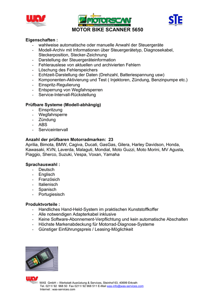 MOTOR BIKE SCANNER 5650 Eigenschaften : - wahlweise automatische oder manuelle Anwahl der Steuergeräte - Modell-Archiv mit Informationen über Steuergerätetyp, Diagnosekabel, Steckerposition, Stecker-Zeichnung - Darstellung der Steuergeräteinformation - Fehlerauslese von aktuellen und archivierten Fehlern - Löschung des Fehlerspeichers - Echtzeit-Darstellung der Daten (Drehzahl, Batteriespannung usw) - Komponenten-Aktivierung und Test ( Injektoren, Zündung, Benzinpumpe etc.) - Einspritz-Regulierung - Entsperrung von Wegfahrsperren - Service-Intervall-Rückstellung Prüfbare Systeme (Modell-abhängig) - Einspritzung - Wegfahrsperre - Zündung - ABS - Serviceintervall Anzahl der prüfbaren Motorradmarken: 23 Aprilia, Bimota, BMW, Cagiva, Ducati, GasGas, Gilera, Harley Davidson, Honda, Kawasaki, KVN, Laverda, Malaguti, Mondial, Moto Guzzi, Moto Morini, MV Agusta, Piaggio, Sherco, Suzuki, Vespa, Voxan, Yamaha Sprachauswahl : - Deutsch - Englisch - Französich - Italienisch - Spanisch - Portugiesisch Produktvorteile : - Handliches Hand-Held-System im praktischen Kunststoffkoffer - Alle notwendigen Adapterkabel inklusive - Keine Software-Abonnement-Verpflichtung und kein automatische Abschalten - Höchste Markenabdeckung für Motorrad-Diagnose-Systeme - Günstiger Einführungspreis / Leasing-Möglichkeit WAS GmbH – Werkstatt Ausrüstung & Services, Steinhof 63, 40699 Erkrath Tel. 0211/ 92 968 50 Fax 0211/ 92 968 511 E-Mail [email protected] Internet : was-services.com