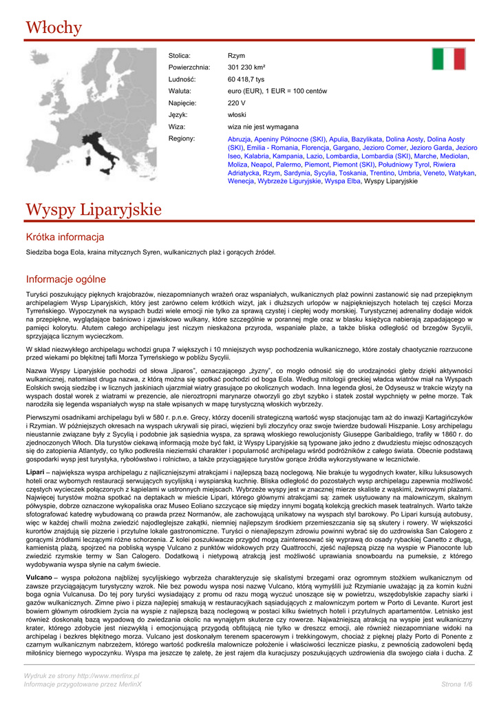 Włochy Stolica: Rzym Powierzchnia: 301 230 km² Ludność: 60 418,7 tys Waluta: euro (EUR), 1 EUR = 100 centów Napięcie: 220 V Język: włoski Wiza: wiza nie jest wymagana Regiony: Abruzja, Apeniny Północne (SKI), Apulia, Bazylikata, Dolina Aosty, Dolina Aosty (SKI), Emilia - Romania, Florencja, Gargano, Jezioro Comer, Jezioro Garda, Jezioro Iseo, Kalabria, Kampania, Lazio, Lombardia, Lombardia (SKI), Marche, Mediolan, Moliza, Neapol, Palermo, Piemont, Piemont (SKI), Południowy Tyrol, Riwiera Adriatycka, Rzym, Sardynia, Sycylia, Toskania, Trentino, Umbria, Veneto, Watykan, Wenecja, Wybrzeże Liguryjskie, Wyspa Elba, Wyspy Liparyjskie Wyspy Liparyjskie Krótka informacja Siedziba boga Eola, kraina mitycznych Syren, wulkanicznych plaż i gorących źródeł. Informacje ogólne Turyści poszukujący pięknych krajobrazów, niezapomnianych wrażeń oraz wspaniałych, wulkanicznych plaż powinni zastanowić się nad przepięknym archipelagiem Wysp Liparyjskich, który jest zarówno celem krótkich wizyt, jak i dłuższych urlopów w najpiękniejszych hotelach tej części Morza Tyrreńskiego. Wypoczynek na wyspach budzi wiele emocji nie tylko za sprawą czystej i ciepłej wody morskiej. Turystycznej adrenaliny dodaje widok na przepiękne, wyglądające baśniowo i zjawiskowo wulkany, które szczególnie w porannej mgle oraz w blasku księżyca nabierają zapadającego w pamięci kolorytu. Atutem całego archipelagu jest niczym nieskażona przyroda, wspaniałe plaże, a także bliska odległość od brzegów Sycylii, sprzyjająca licznym wycieczkom. W skład niezwykłego archipelagu wchodzi grupa 7 większych i 10 mniejszych wysp pochodzenia wulkanicznego, które zostały chaotycznie rozrzucone przed wiekami po błękitnej tafli Morza Tyrreńskiego w pobliżu Sycylii. Nazwa Wyspy Liparyjskie pochodzi od słowa „liparos”, oznaczającego „żyzny”, co mogło odnosić się do urodzajności gleby dzięki aktywności wulkanicznej, natomiast druga nazwa, z którą można się spotkać pochodzi od boga Eola. Według mitologii greckiej władca wiatrów miał na Wyspach Eolskich swoją siedzibę i w licznych jaskiniach ujarzmiał wiatry grasujące po okolicznych wodach. Inna legenda głosi, że Odyseusz w trakcie wizyty na wyspach dostał worek z wiatrami w prezencie, ale nieroztropni marynarze otworzyli go zbyt szybko i statek został wypchnięty w pełne morze. Tak narodziła się legenda wspaniałych wysp na stałe wpisanych w mapę turystyczną włoskich wybrzeży. Pierwszymi osadnikami archipelagu byli w 580 r. p.n.e. Grecy, którzy docenili strategiczną wartość wysp stacjonując tam aż do inwazji Kartagińczyków i Rzymian. W późniejszych okresach na wyspach ukrywali się piraci, więzieni byli złoczyńcy oraz swoje twierdze budowali Hiszpanie. Losy archipelagu nieustannie związane były z Sycylią i podobnie jak sąsiednia wyspa, za sprawą włoskiego rewolucjonisty Giuseppe Garibaldiego, trafiły w 1860 r. do zjednoczonych Włoch. Dla turystów ciekawą informacją może być fakt, iż Wyspy Liparyjskie są typowane jako jedno z dwudziestu miejsc odnoszących się do zatopienia Atlantydy, co tylko podkreśla nieziemski charakter i popularność archipelagu wśród podróżników z całego świata. Obecnie podstawą gospodarki wysp jest turystyka, rybołówstwo i rolnictwo, a także przyciągające turystów gorące źródła wykorzystywane w lecznictwie. Lipari – największa wyspa archipelagu z najliczniejszymi atrakcjami i najlepszą bazą noclegową. Nie brakuje tu wygodnych kwater, kilku luksusowych hoteli oraz wybornych restauracji serwujących sycylijską i wyspiarską kuchnię. Bliska odległość do pozostałych wysp archipelagu zapewnia możliwość częstych wycieczek połączonych z kąpielami w ustronnych miejscach. Wybrzeże wyspy jest w znacznej mierze skaliste z wąskimi, żwirowymi plażami. Najwięcej turystów można spotkać na deptakach w mieście Lipari, którego głównymi atrakcjami są: zamek usytuowany na malowniczym, skalnym półwyspie, dobrze oznaczone wykopaliska oraz Museo Eoliano szczycące się między innymi bogatą kolekcją greckich masek teatralnych. Warto także sfotografować katedrę wybudowaną co prawda przez Normanów, ale zachowującą unikatowy na wyspach styl barokowy. Po Lipari kursują autobusy, więc w każdej chwili można zwiedzić najodleglejsze zakątki, niemniej najlepszym środkiem przemieszczania się są skutery i rowery. W większości kurortów znajdują się pizzerie i przytulne lokale gastronomiczne. Turyści o nienajlepszym zdrowiu powinni wybrać się do uzdrowiska San Calogero z gorącymi źródłami leczącymi różne schorzenia. Z kolei poszukiwacze przygód mogą zainteresować się wyprawą do osady rybackiej Canetto z długą, kamienistą plażą, spojrzeć na pobliską wyspę Vulcano z punktów widokowych przy Quattrocchi, zjeść najlepszą pizzę na wyspie w Pianoconte lub zwiedzić rzymskie termy w San Calogero. Dodatkową i nietypową atrakcją jest możliwość uprawiania snowboardu na pumeksie, z którego wydobywania wyspa słynie na całym świecie. Vulcano – wyspa położona najbliżej sycylijskiego wybrzeża charakteryzuje się skalistymi brzegami oraz ogromnym stożkiem wulkanicznym od zawsze przyciągającym turystyczny wzrok. Nie bez powodu wyspa nosi nazwę Vulcano, którą wymyślili już Rzymianie uważając ją za komin kuźni boga ognia Vulcanusa. Do tej pory turyści wysiadający z promu od razu mogą wyczuć unoszące się w powietrzu, wszędobylskie zapachy siarki i gazów wulkanicznych. Zimne piwo i pizza najlepiej smakują w restauracyjkach sąsiadujących z malowniczym portem w Porto di Levante. Kurort jest bowiem głównym ośrodkiem życia na wyspie z najlepszą bazą noclegową w postaci kilku świetnych hoteli i przytulnych apartamentów. Letnisko jest również doskonałą bazą wypadową do zwiedzania okolic na wynajętym skuterze czy rowerze. Najważniejszą atrakcją na wy